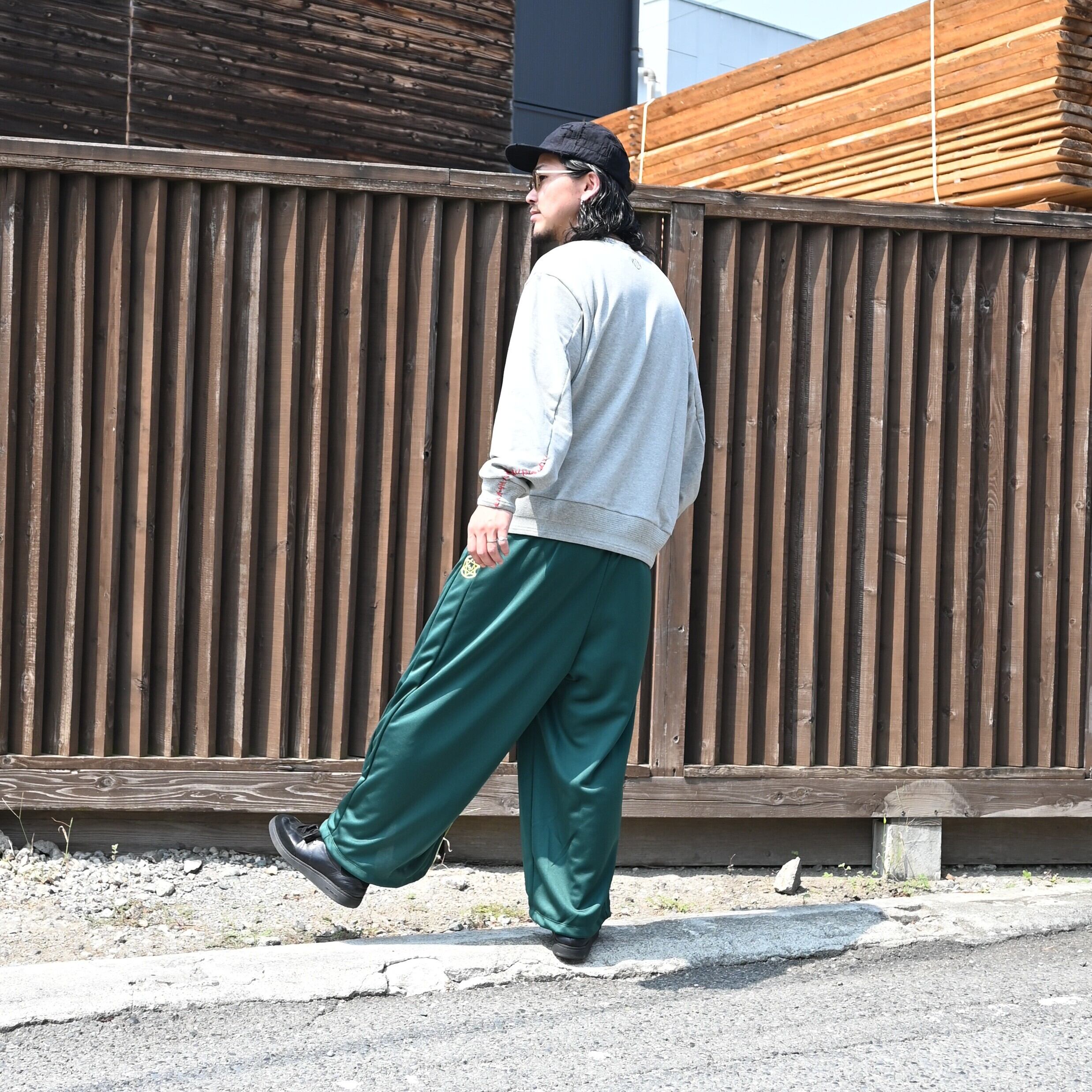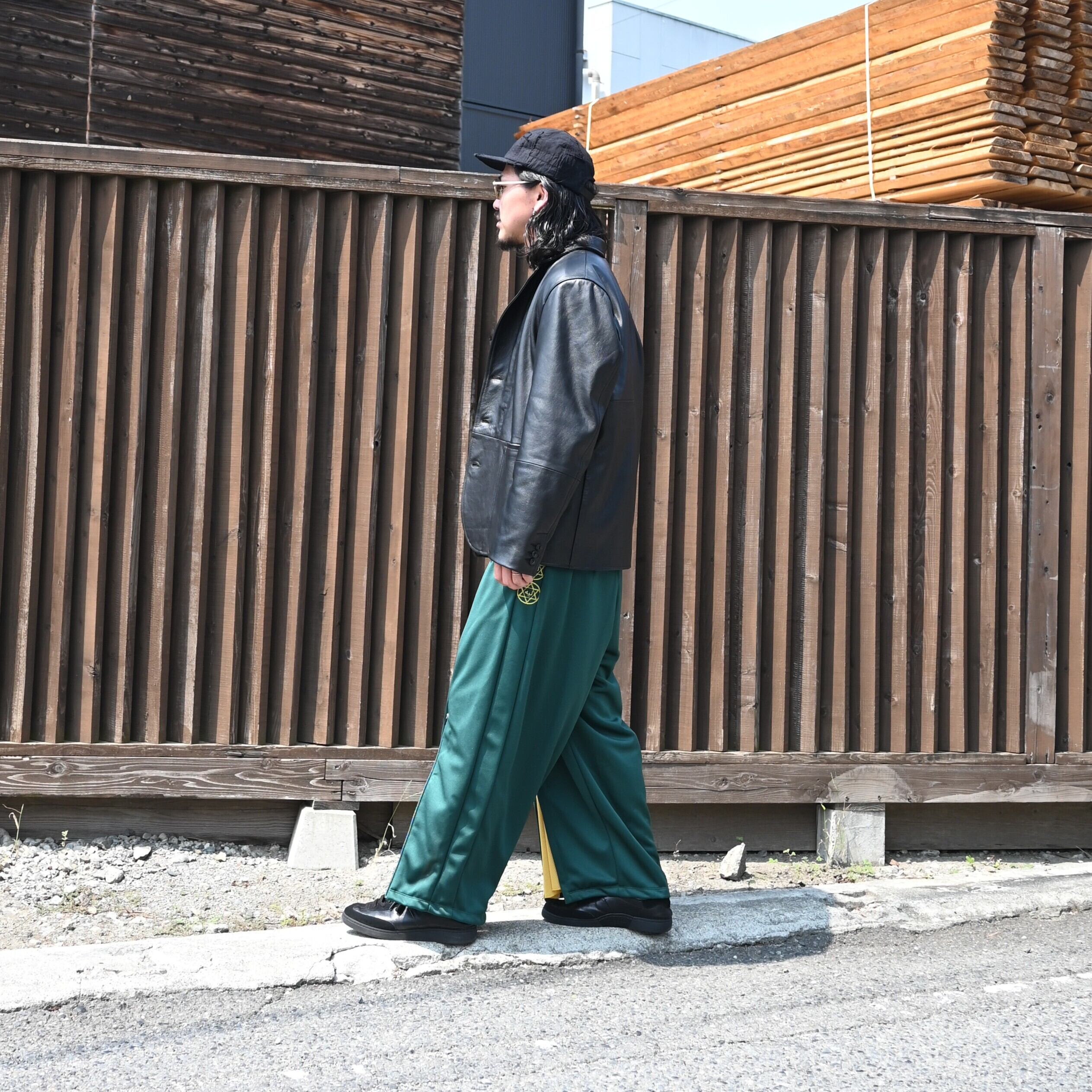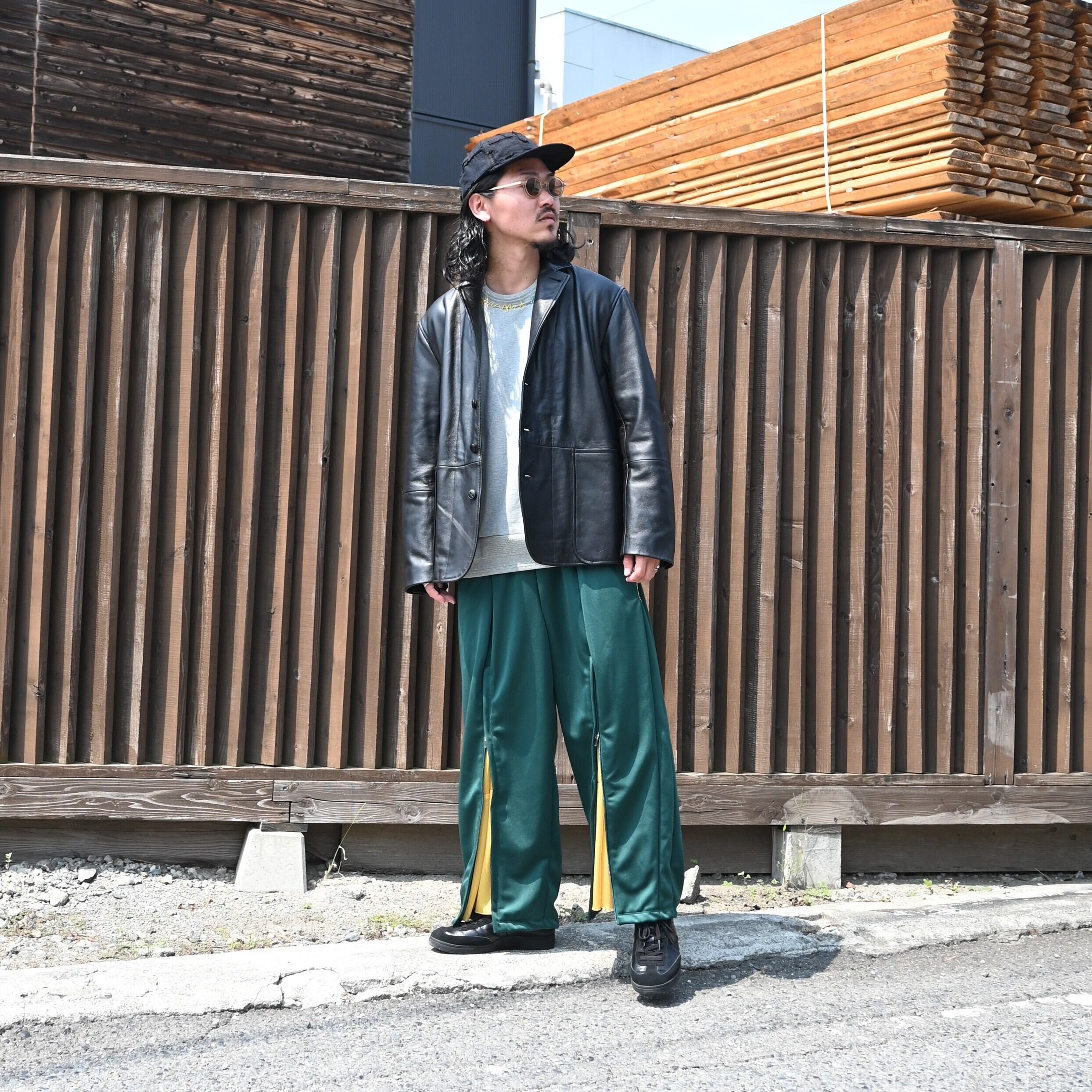 今回のコーディネートはCCU(シーシーユー)のレザージャケットをメインにハズシでLEH(レー)のトラックパンツを合わせています。