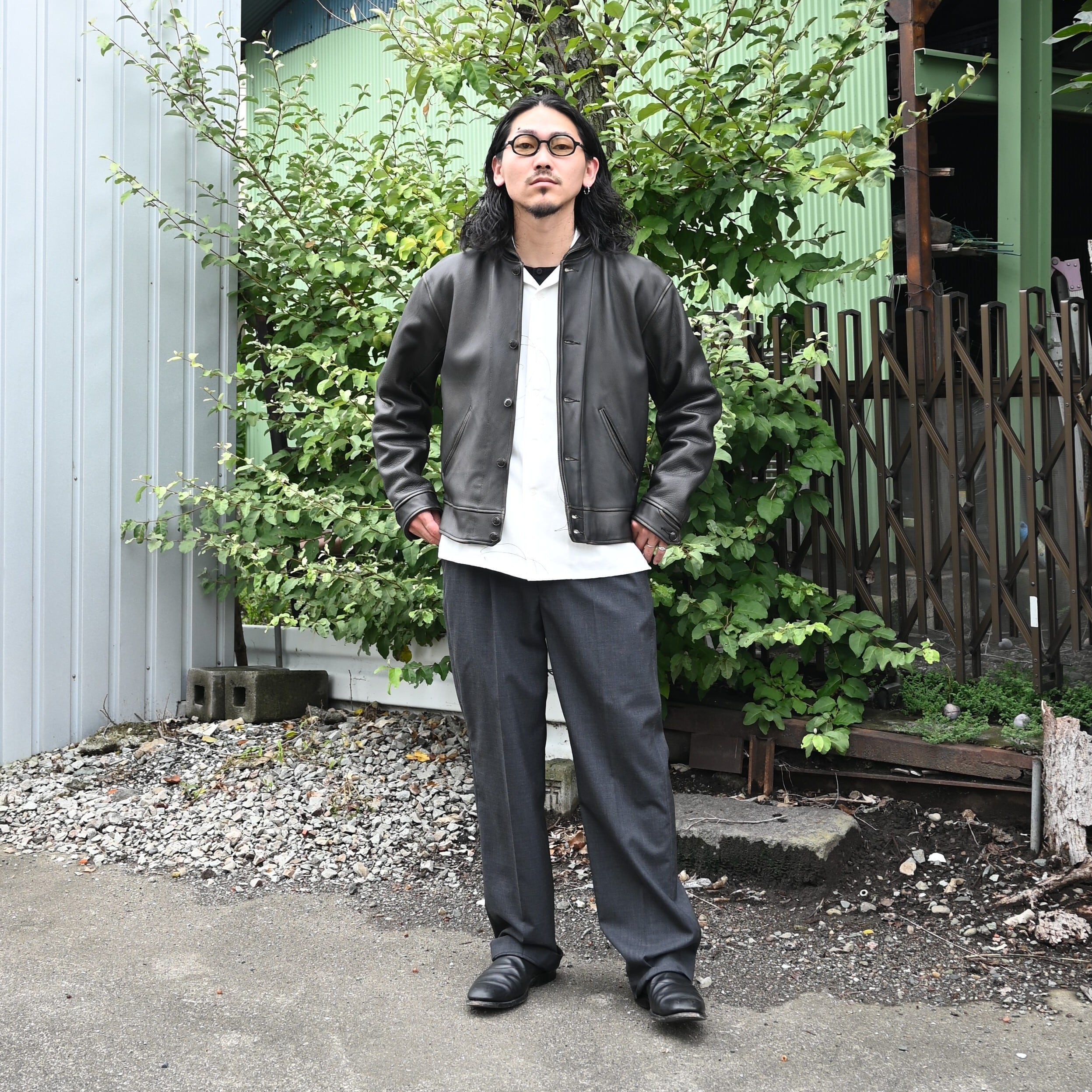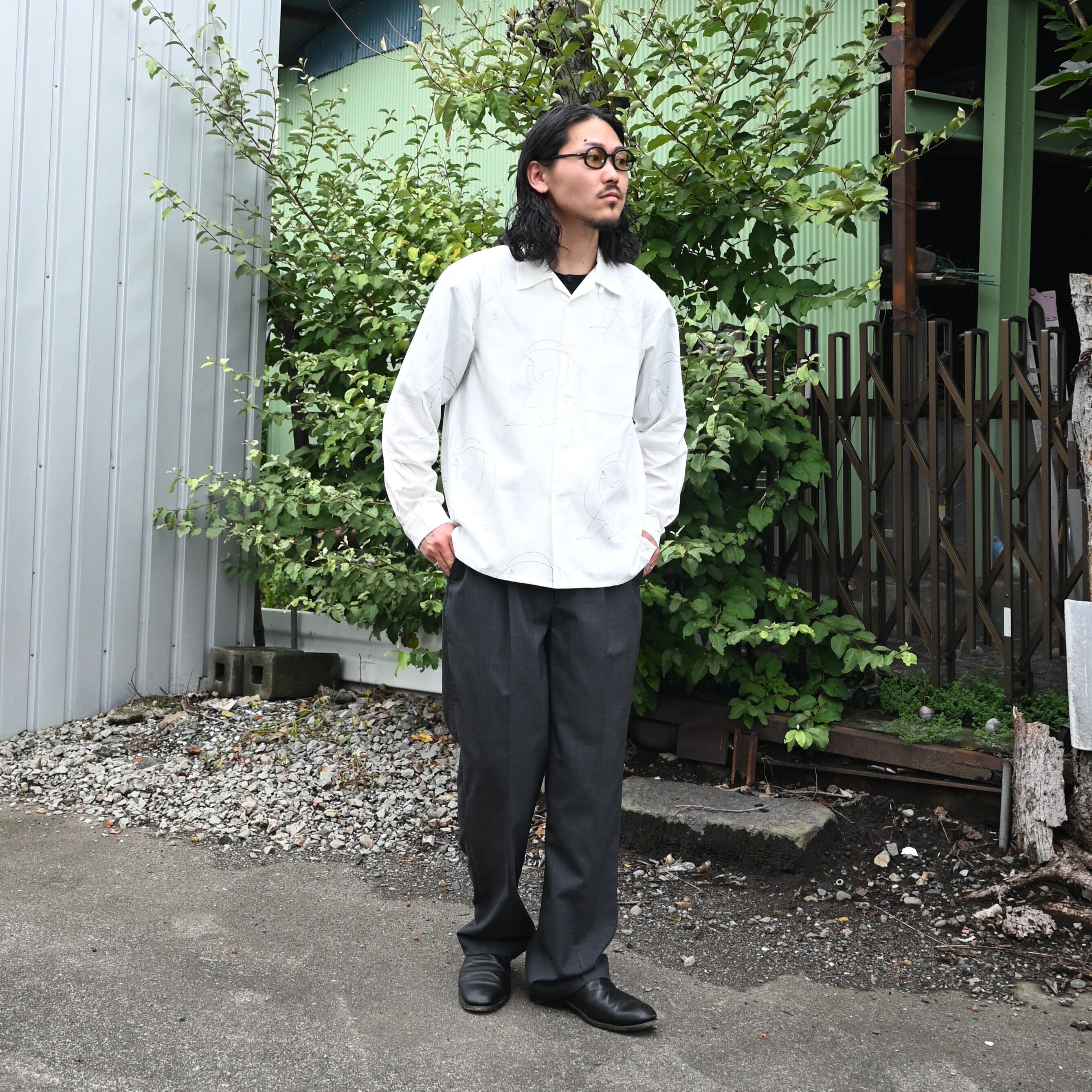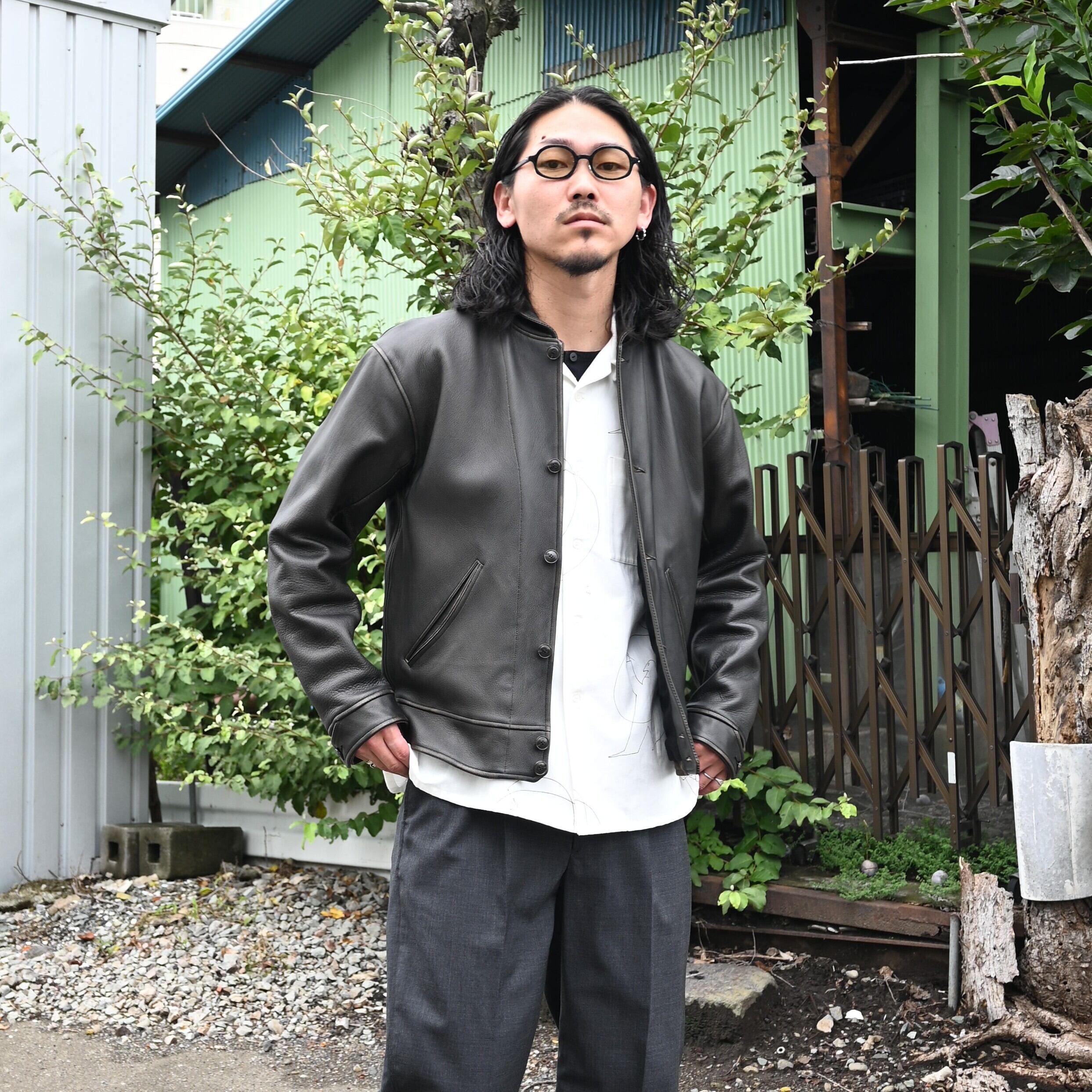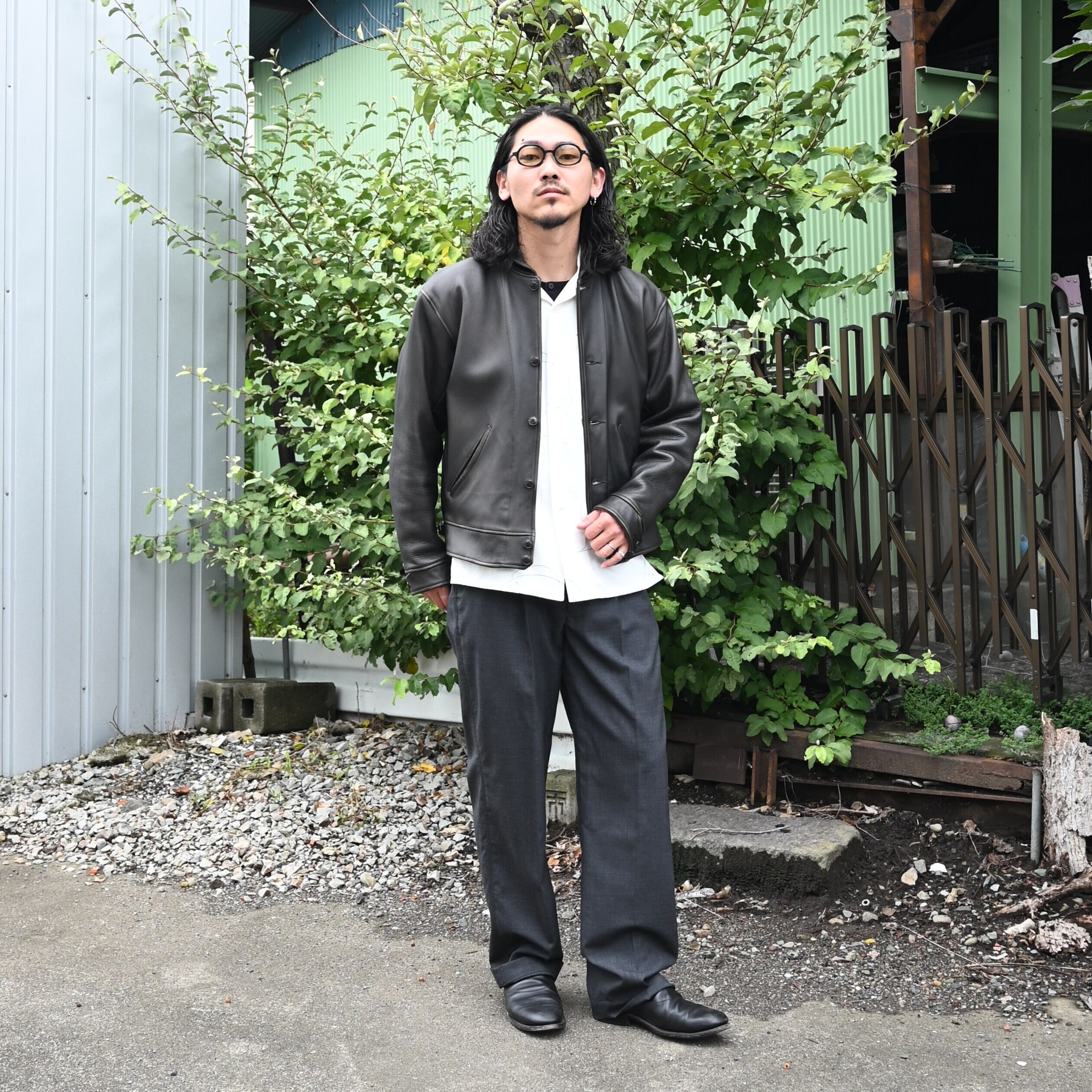 OLD JOE(オールドジョー)PATINA DEERSKIN COSSAK JACKETをメインにOPEN COLLAR SHIRTS (Saul Steinberg)、 HIDDEN LOOP BUDDY TROUSERをセットで合わせたブランドらしいスタイルです。インナーのコラージュシャツが渋さを軽減してくれ、ファッションライクなスタイルに。