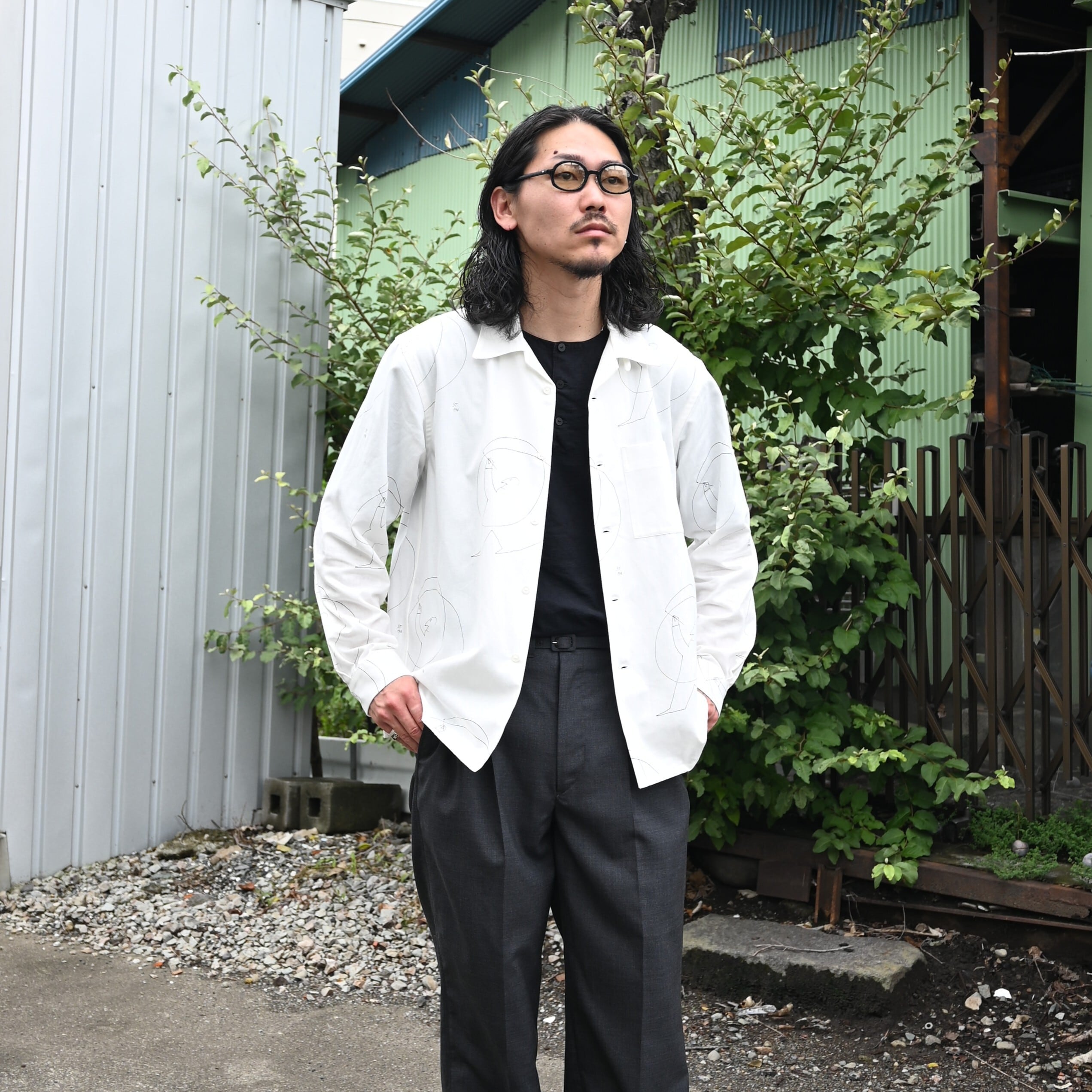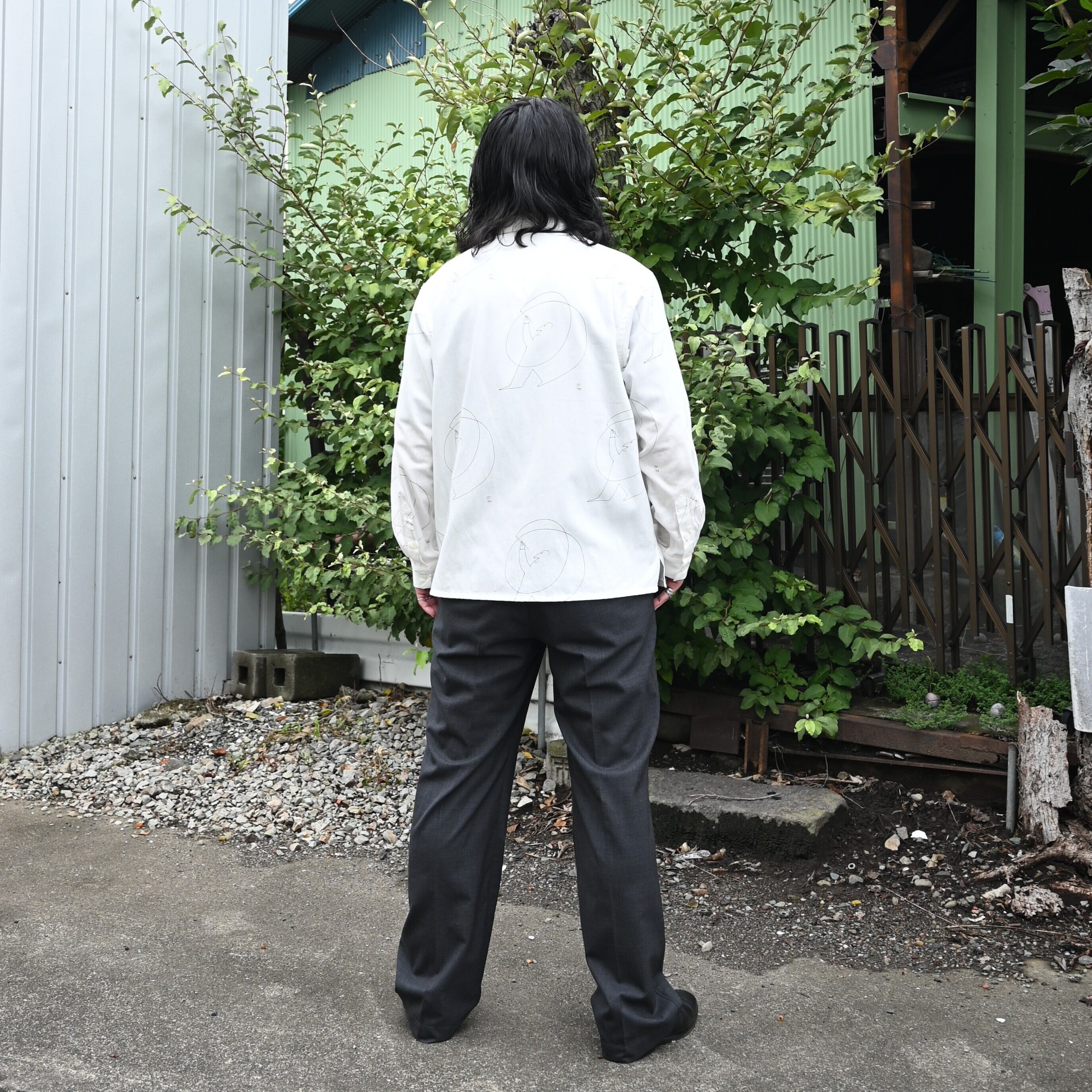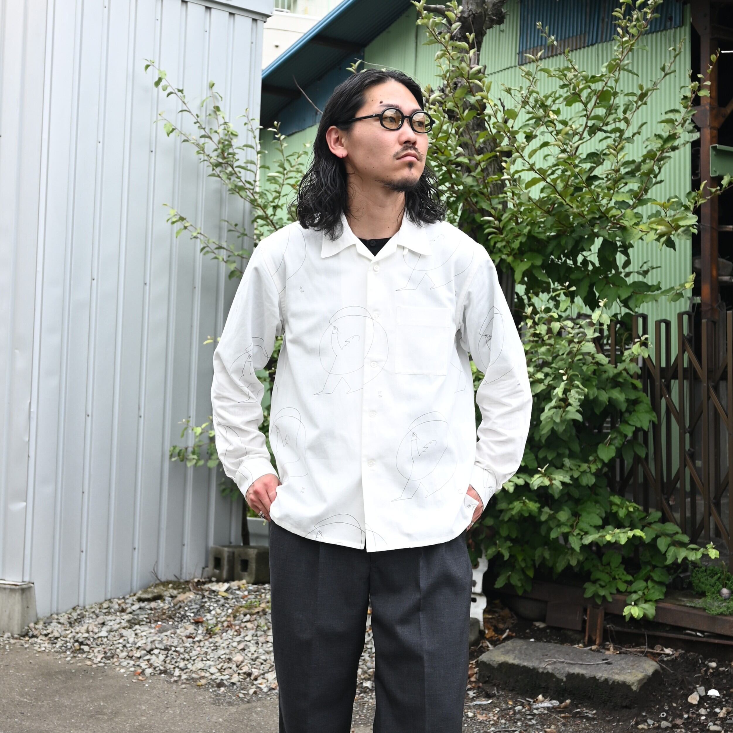 OLD JOE(オールドジョー)PATINA DEERSKIN COSSAK JACKETをメインにOPEN COLLAR SHIRTS (Saul Steinberg)、 HIDDEN LOOP BUDDY TROUSERをセットで合わせたブランドらしいスタイルです。インナーのコラージュシャツが渋さを軽減してくれ、ファッションライクなスタイルに。