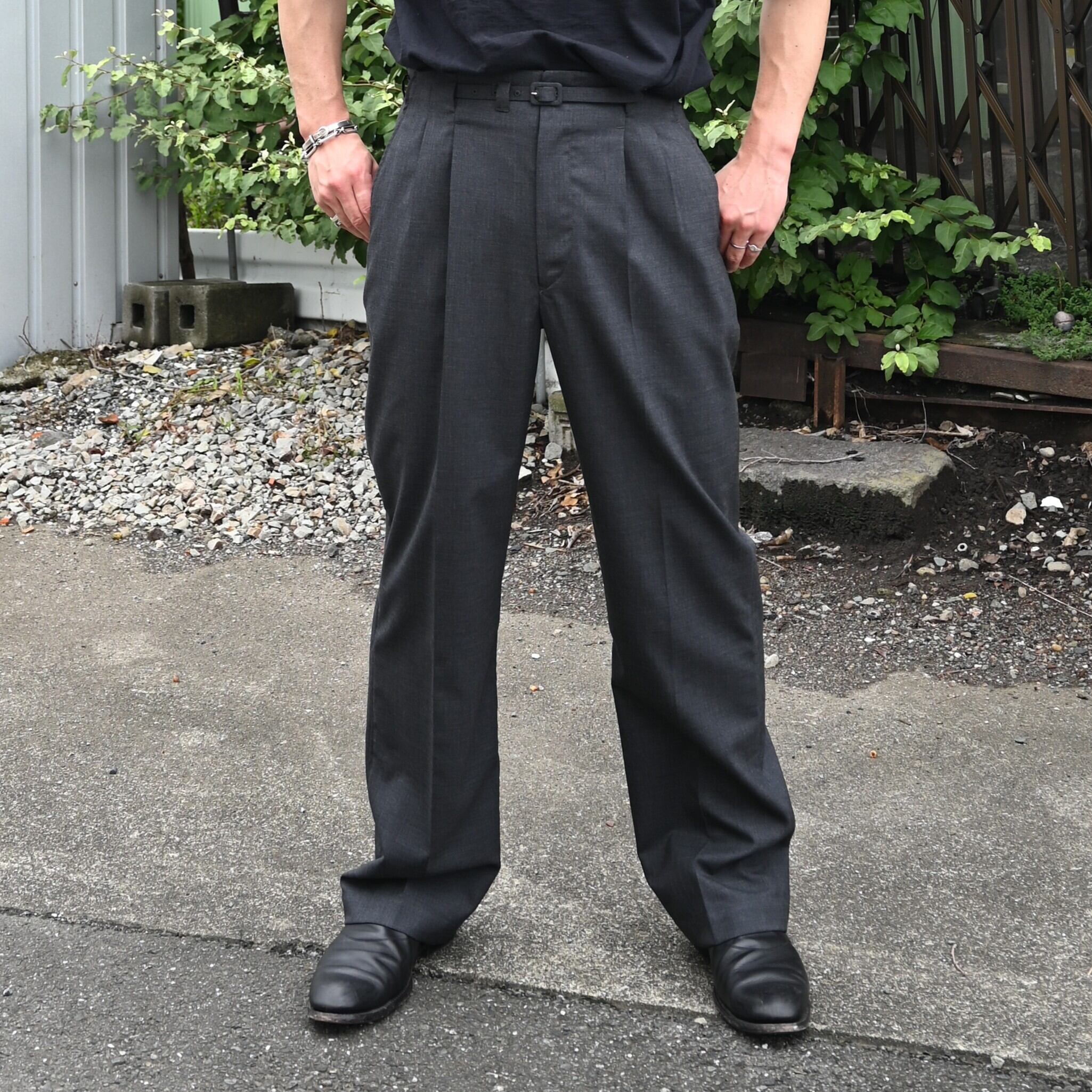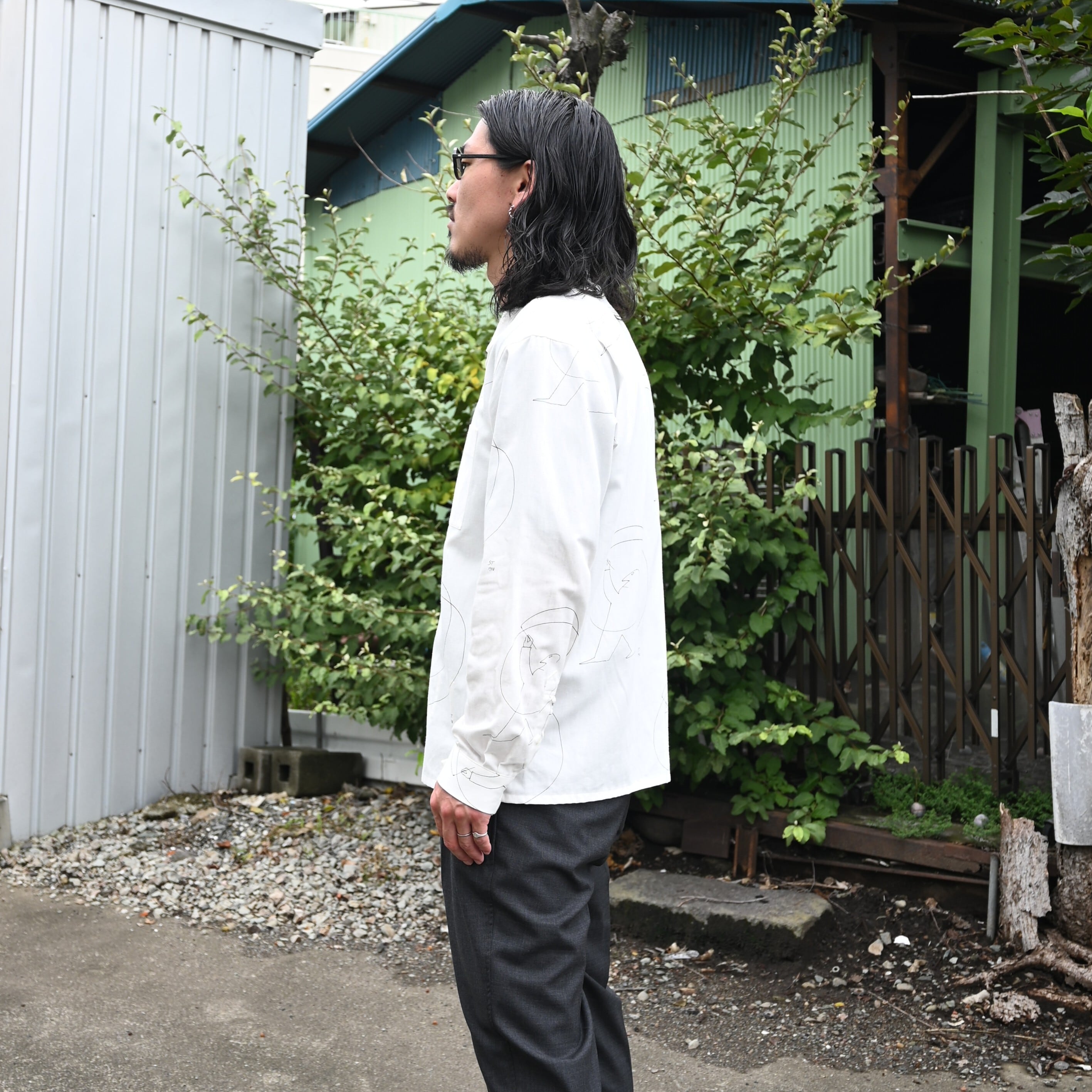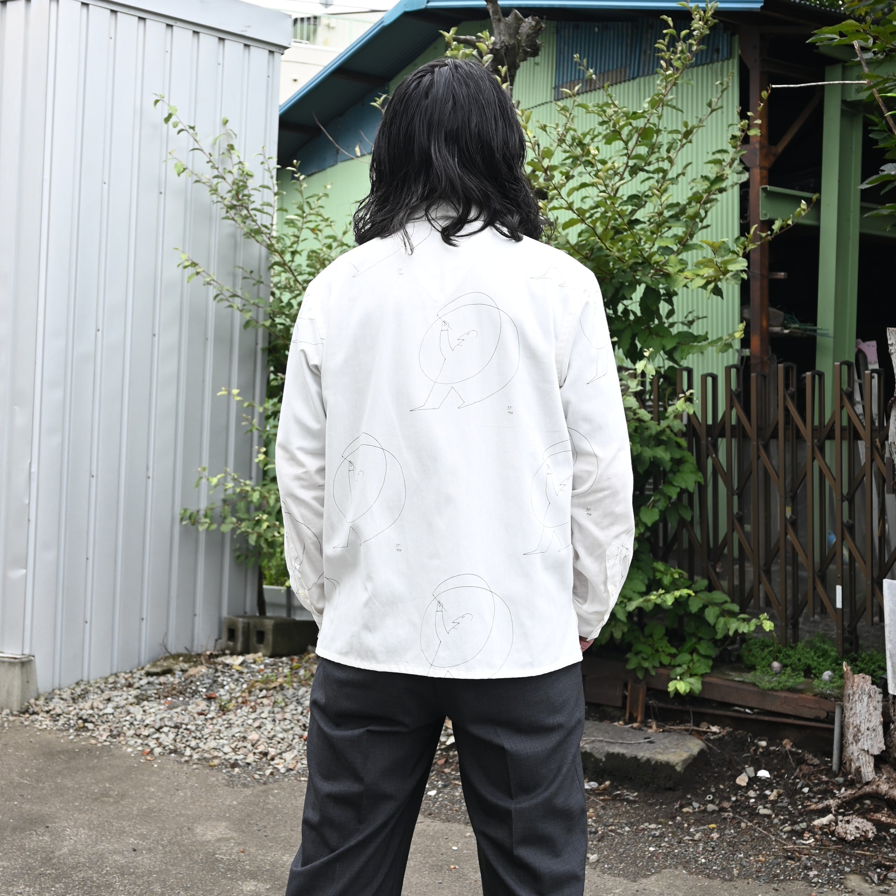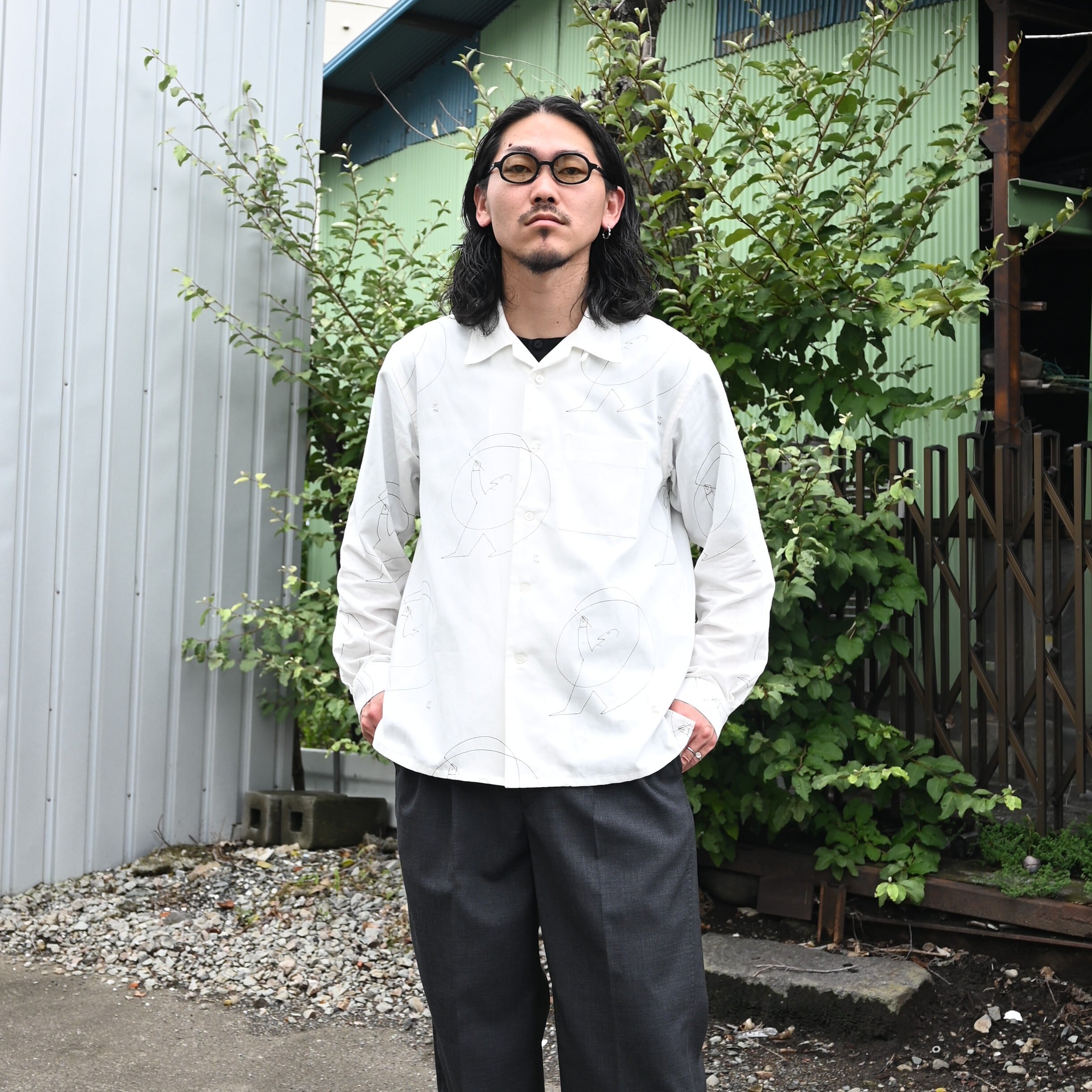 OLD JOE(オールドジョー)PATINA DEERSKIN COSSAK JACKETをメインにOPEN COLLAR SHIRTS (Saul Steinberg)、 HIDDEN LOOP BUDDY TROUSERをセットで合わせたブランドらしいスタイルです。インナーのコラージュシャツが渋さを軽減してくれ、ファッションライクなスタイルに。