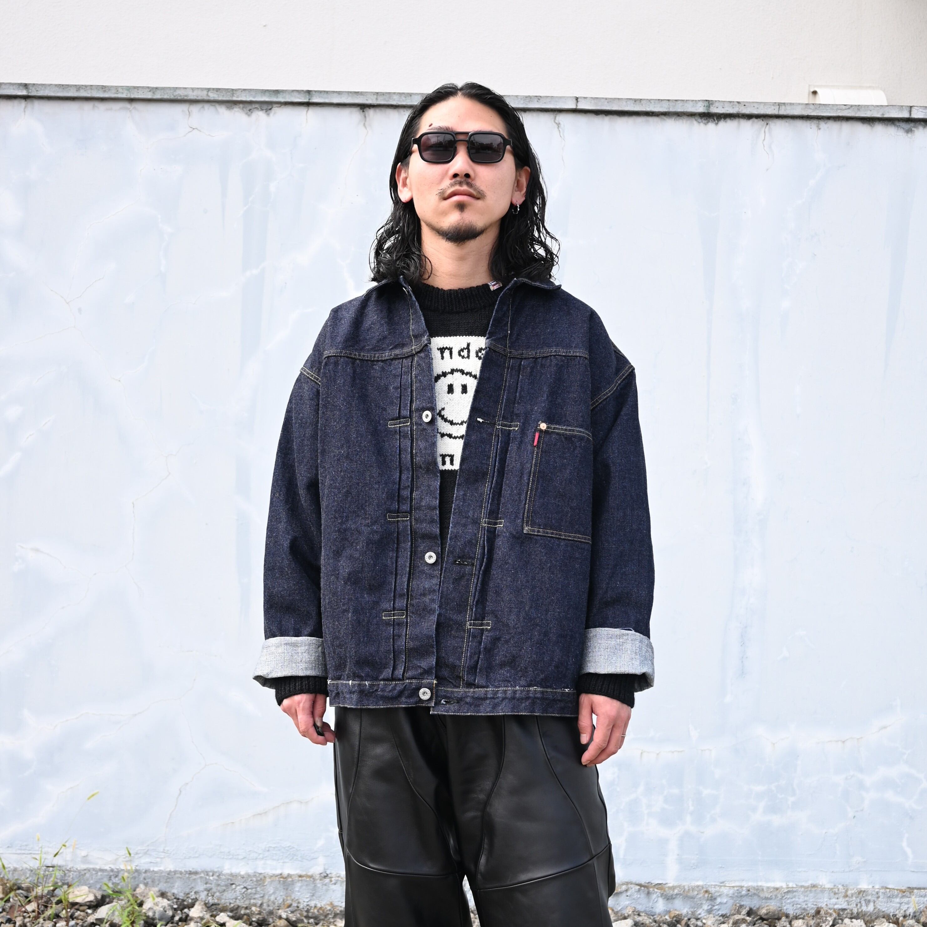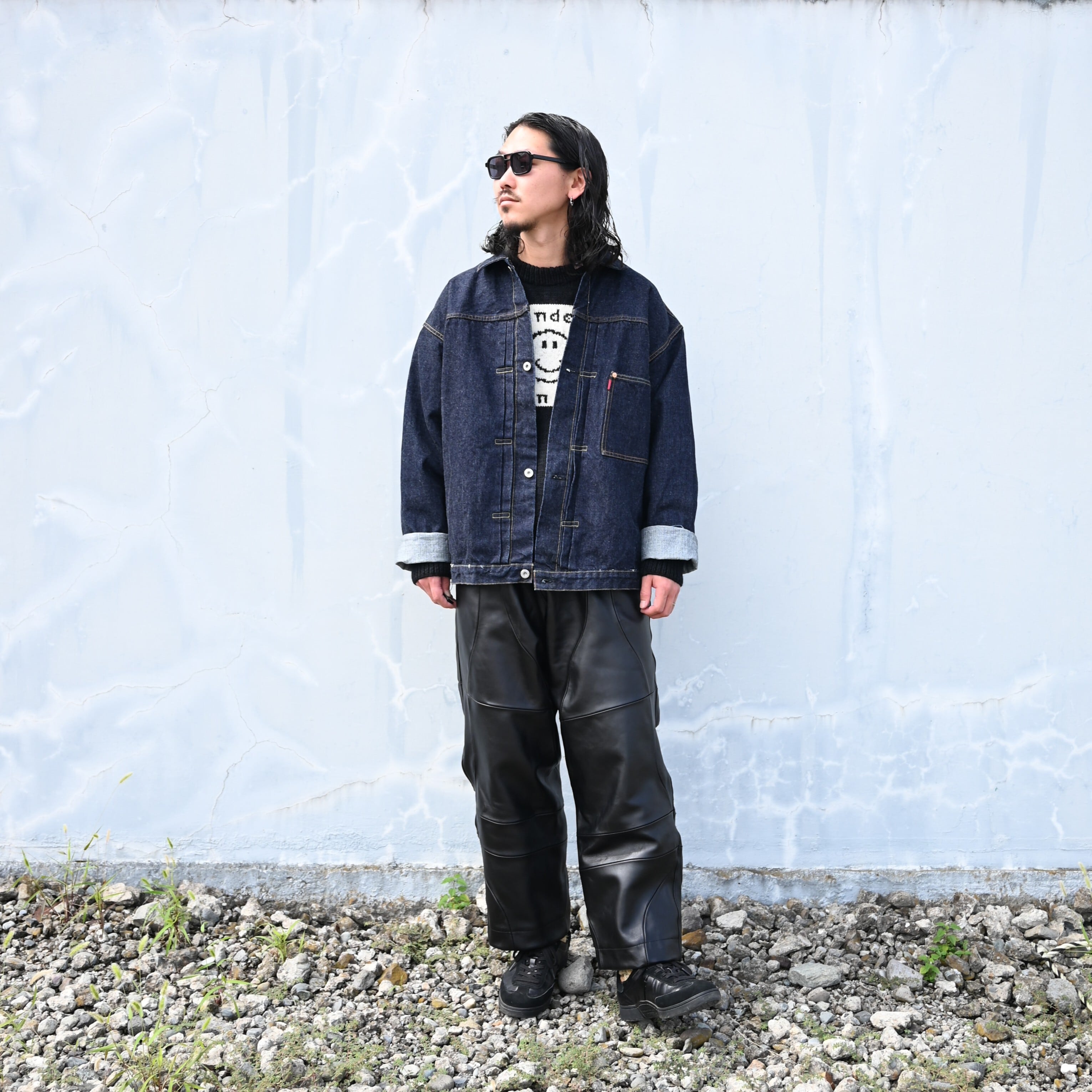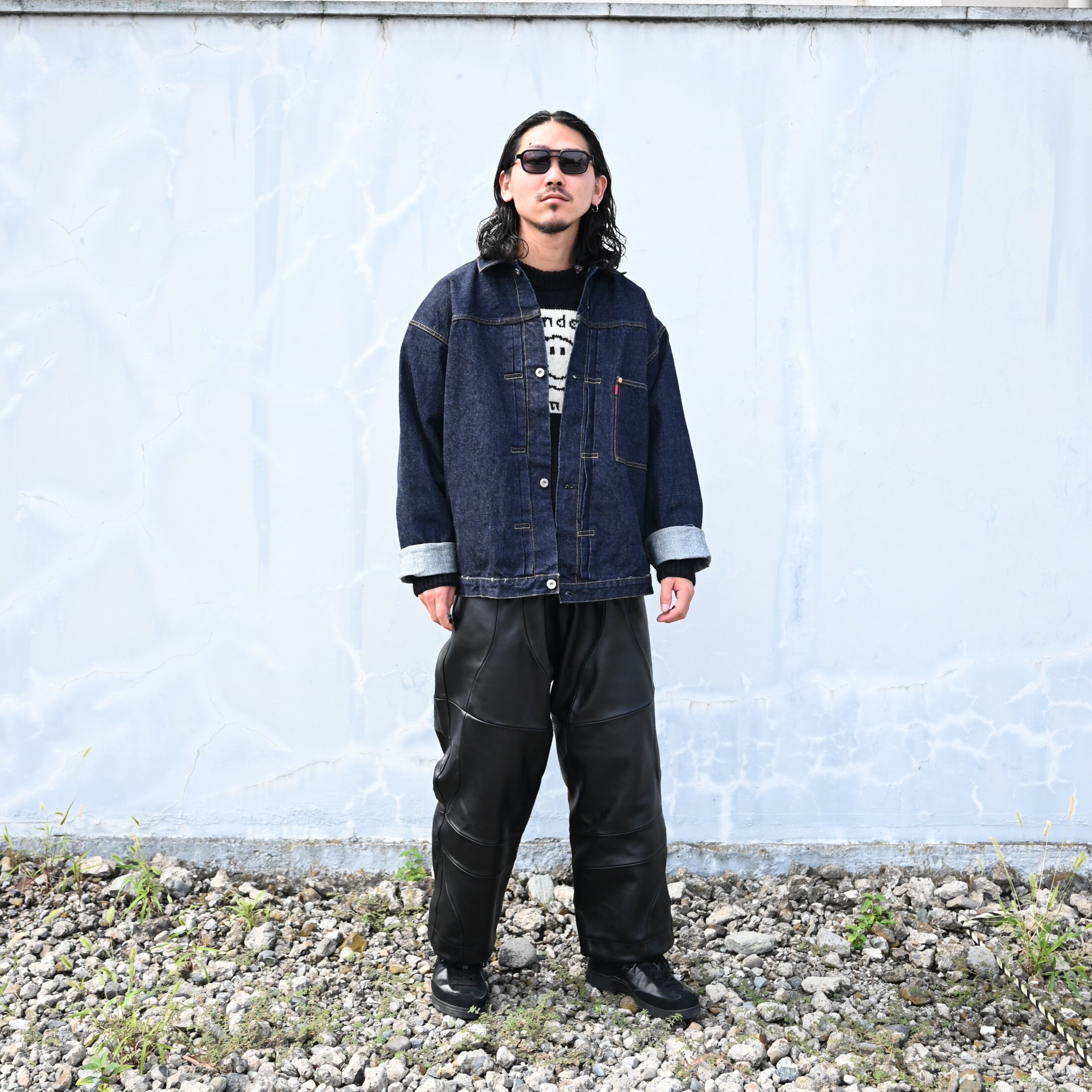 Wearing a set of LEH 25AW new arrivals, the Smiley Knit Sweater and Leather Coverup Pants. Paired with the INTÉRIM WASH HEAVY KIBATA SHUTTLE HYPER BIG WWII "1ST" Denim Jacket. The combination of leather pants and denim works exceptionally well.