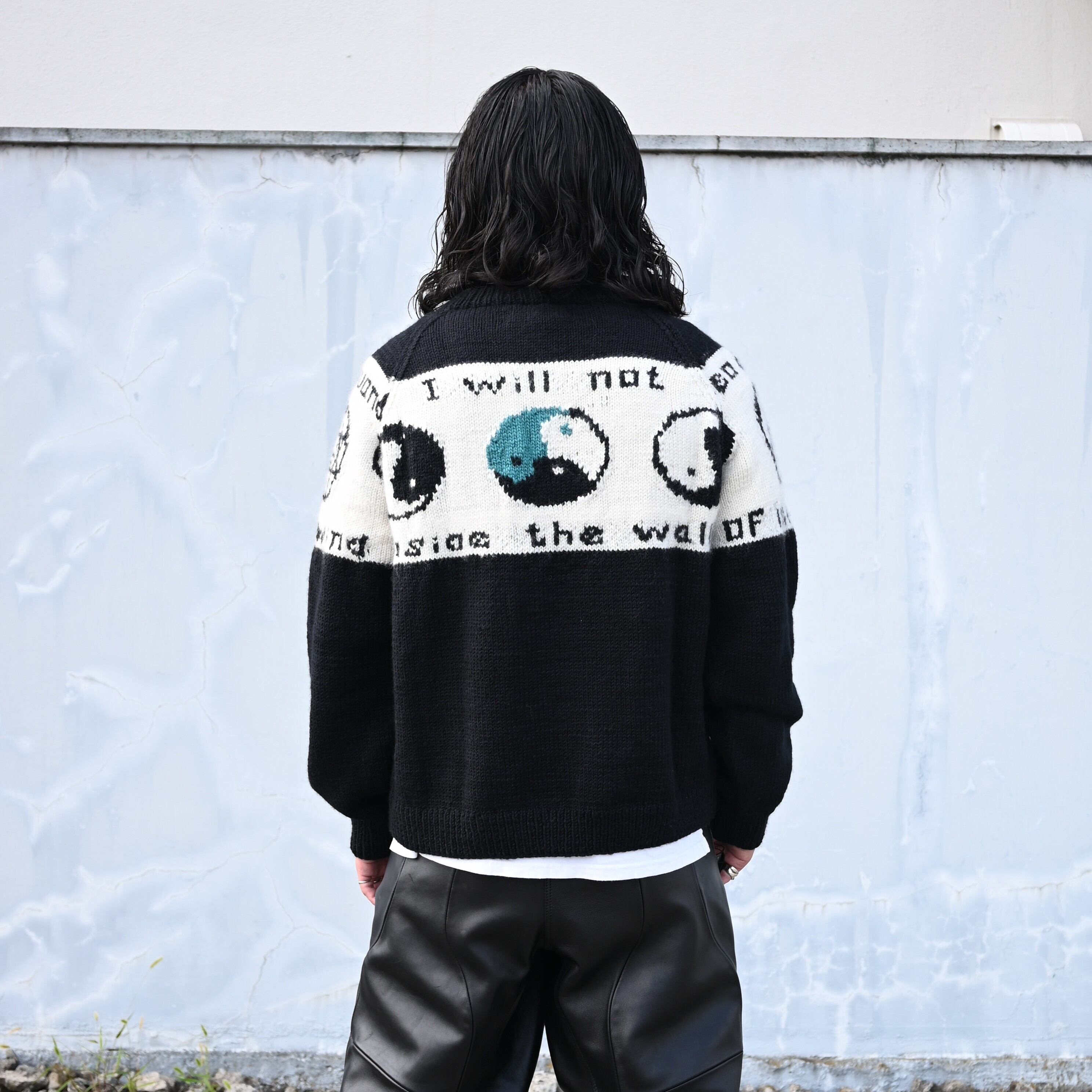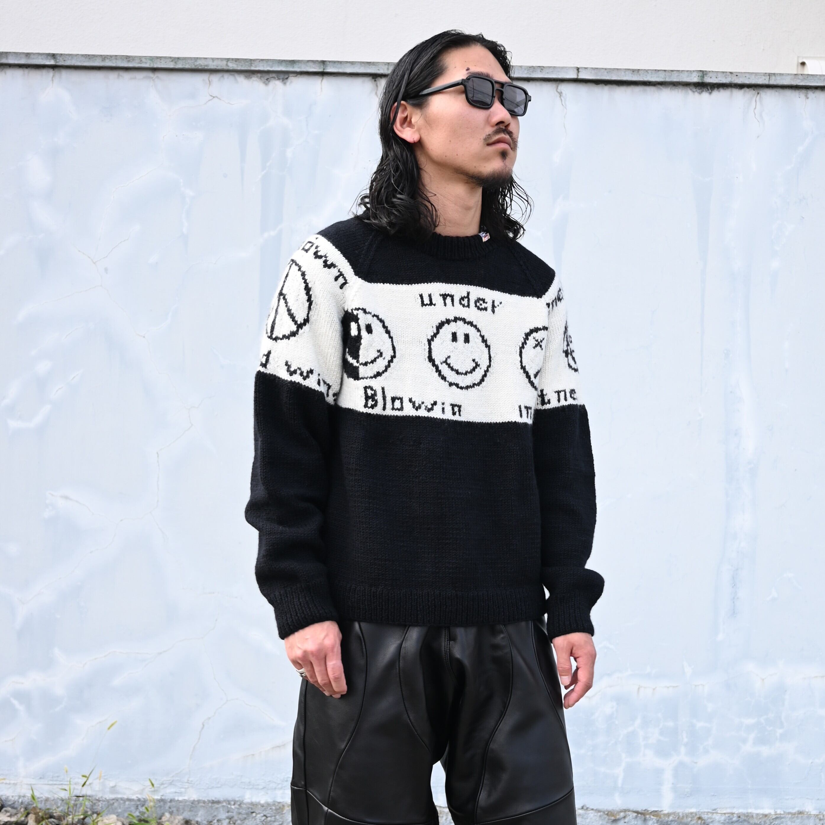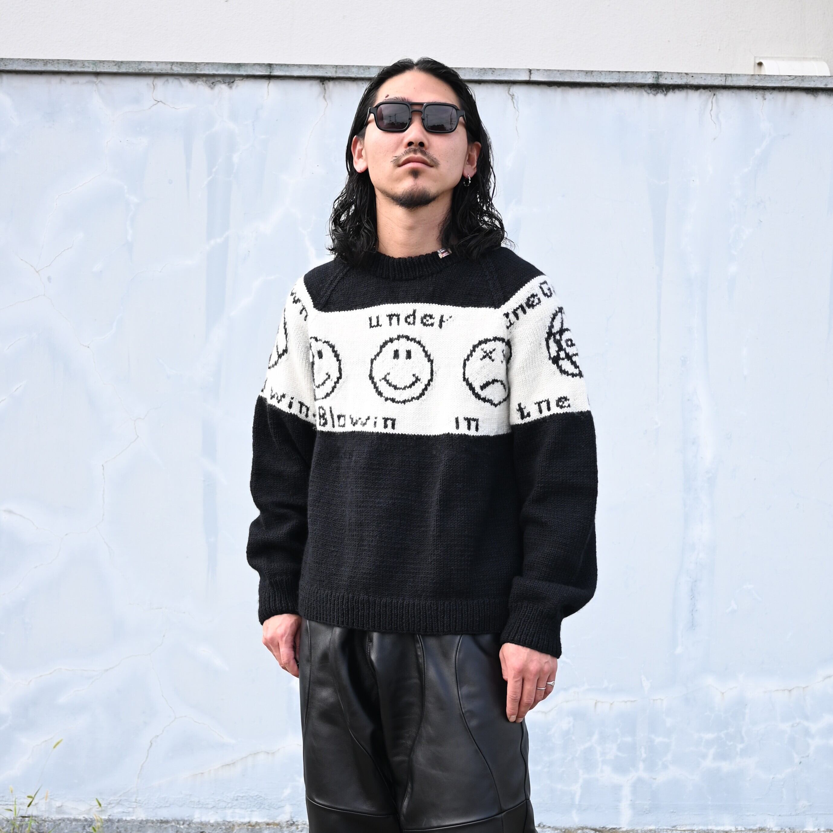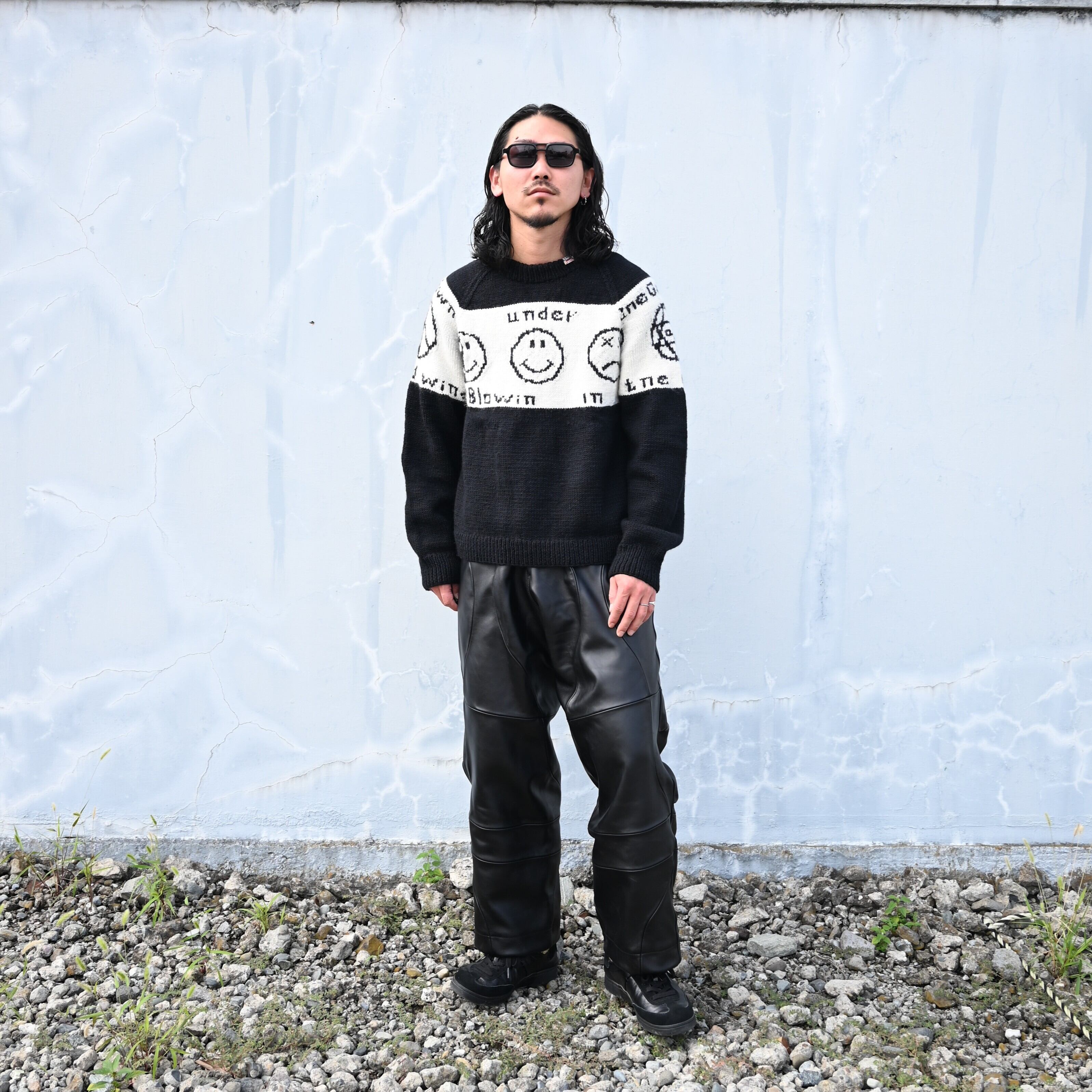 Wearing a set of LEH 25AW new arrivals, the Smiley Knit Sweater and Leather Coverup Pants. Paired with the INTÉRIM WASH HEAVY KIBATA SHUTTLE HYPER BIG WWII "1ST" Denim Jacket. The combination of leather pants and denim works exceptionally well.