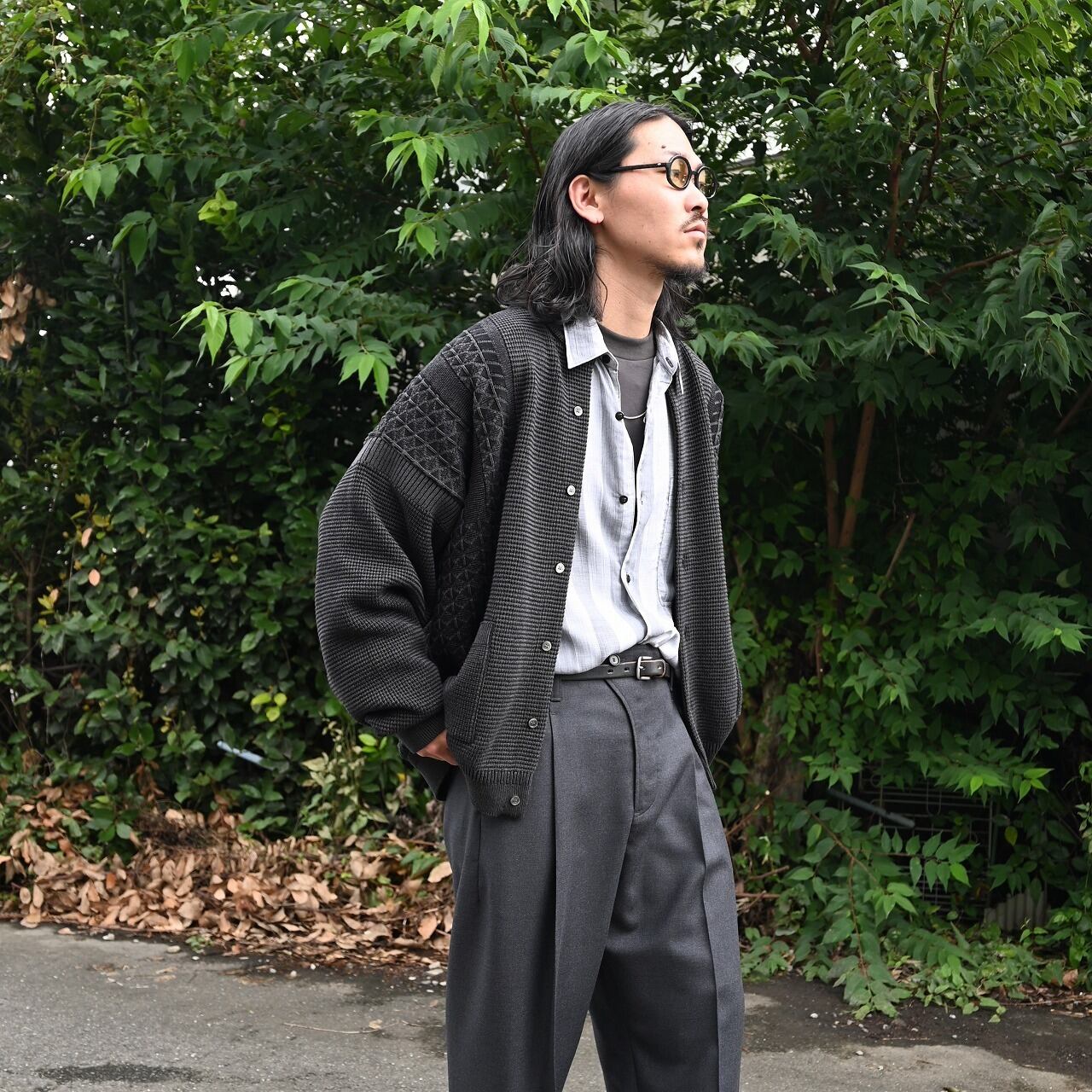 間違いなく業界でトップクラスのテキスタイルを作る山内(ヤマウチ)が展開する25AW最新作となるヘビーウールツイル・サイドシームレスパンツとヤシキのカーディガンを合わせてコーディネート。グレーブラックベースのスタイルにチェンジーズのカーキヘルメットバッグを合わせることで差し色をプラス。インナーにユーズド、デッドストックのグーチヴィスコースストライプロングスリーブシャツを合わせて抜け感を。
