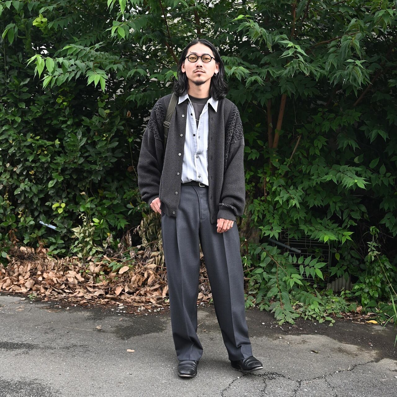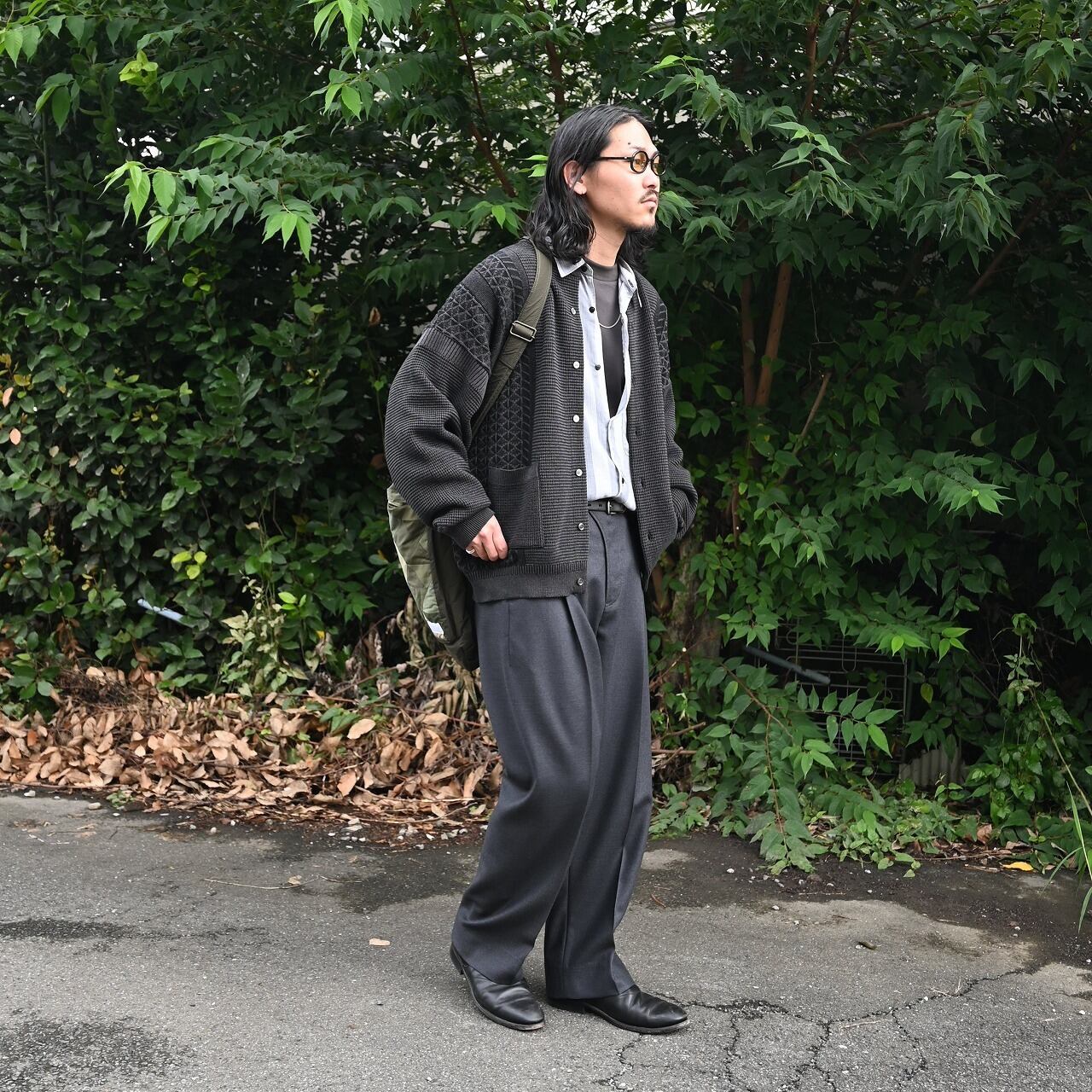 A coordinated look featuring Yamauchi’s (Yamauchi) latest 25AW release—Heavy Wool Twill Side-Seamless Pants, crafted by a brand renowned for producing some of the industry’s finest textiles—paired with a cardigan from Yashiki. The gray-black base style is accented with a Changes khaki helmet bag, adding a touch of color.