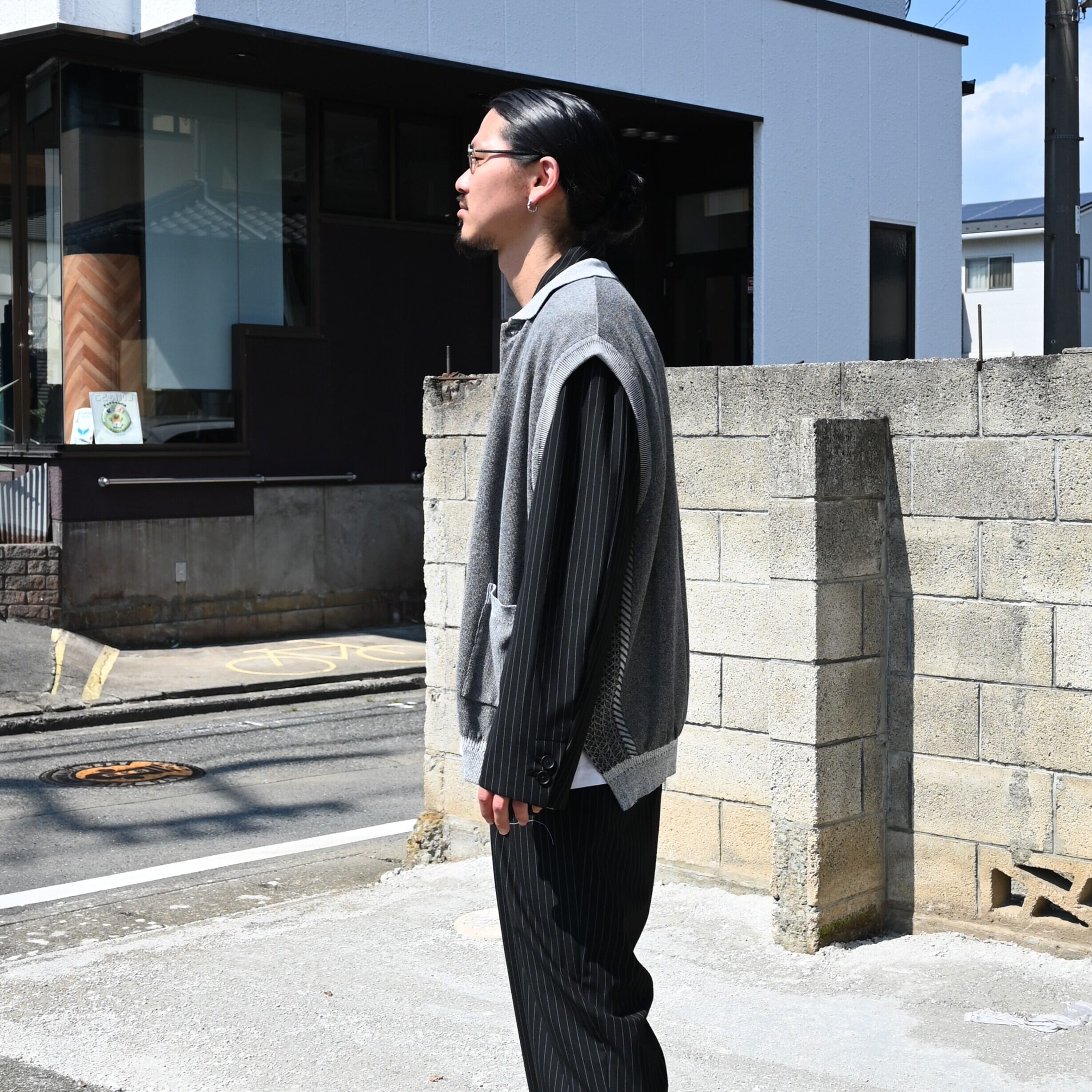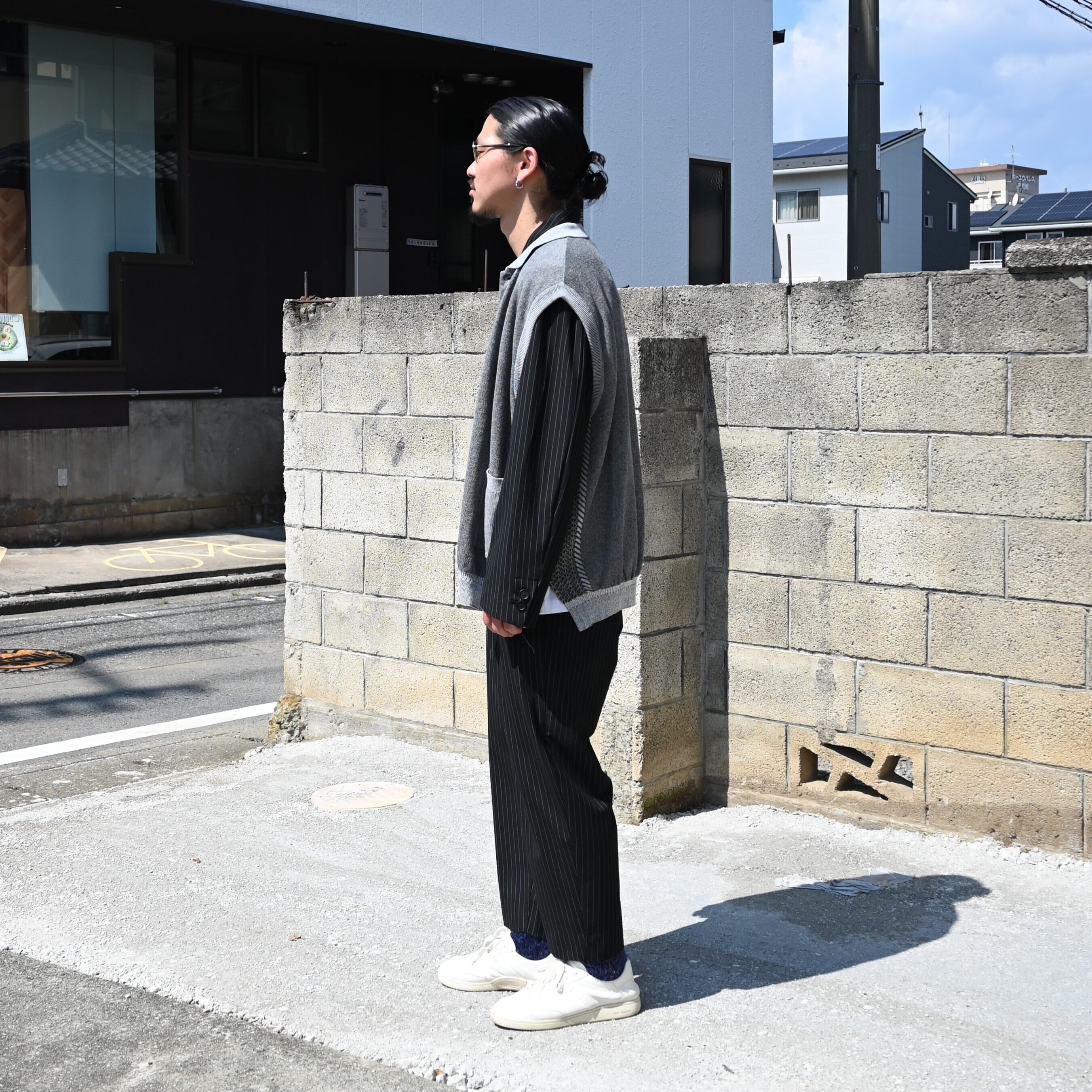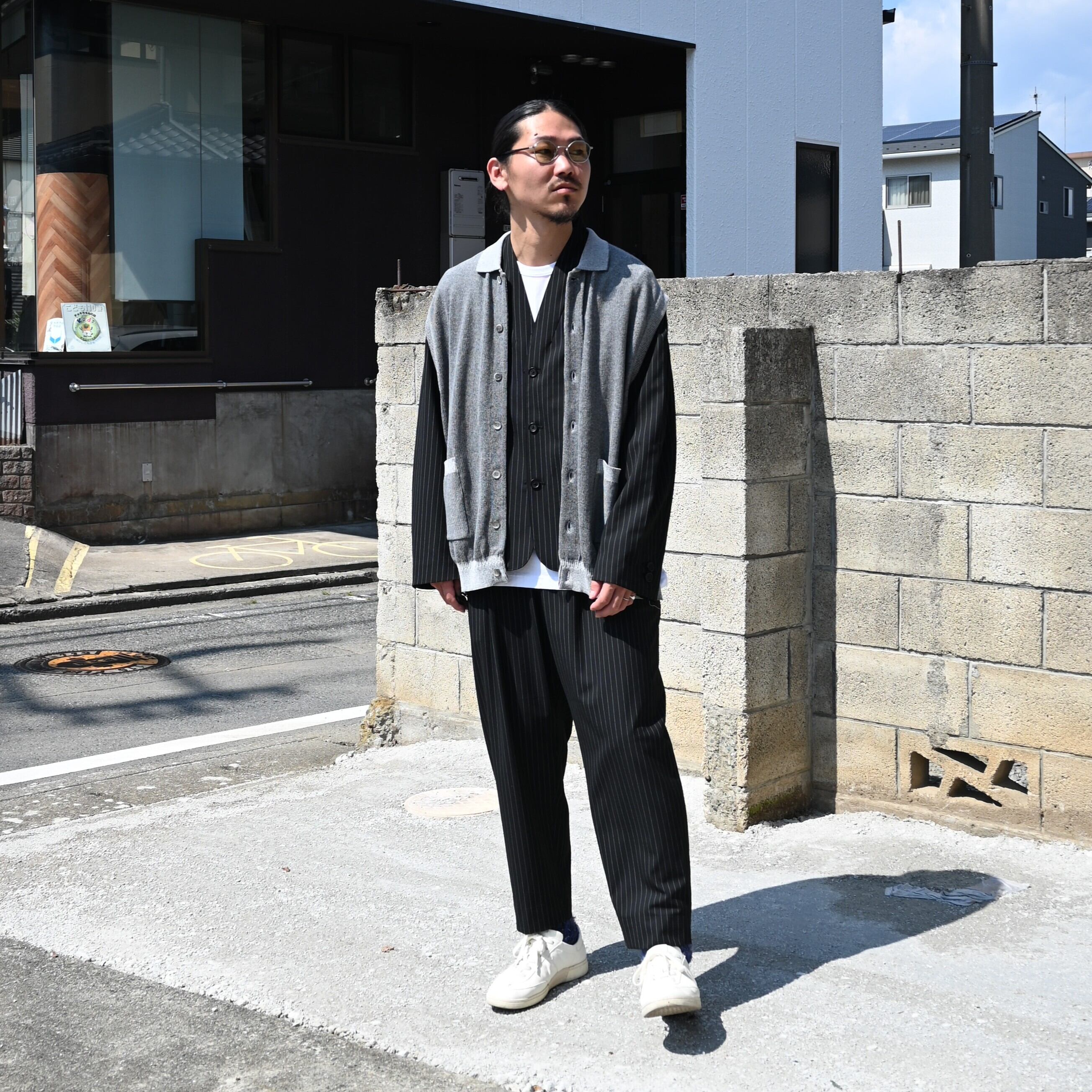 The main piece is a set-up from KUON. To intentionally add variation to the styling, I paired it with a knit vest from Yashiki. This knit vest from Yashiki can be worn year-round and blends seamlessly into a wide range of styles. The KUON set-up features a reversible jacket, making it enjoyable not only for business occasions but also as a fashion statement.