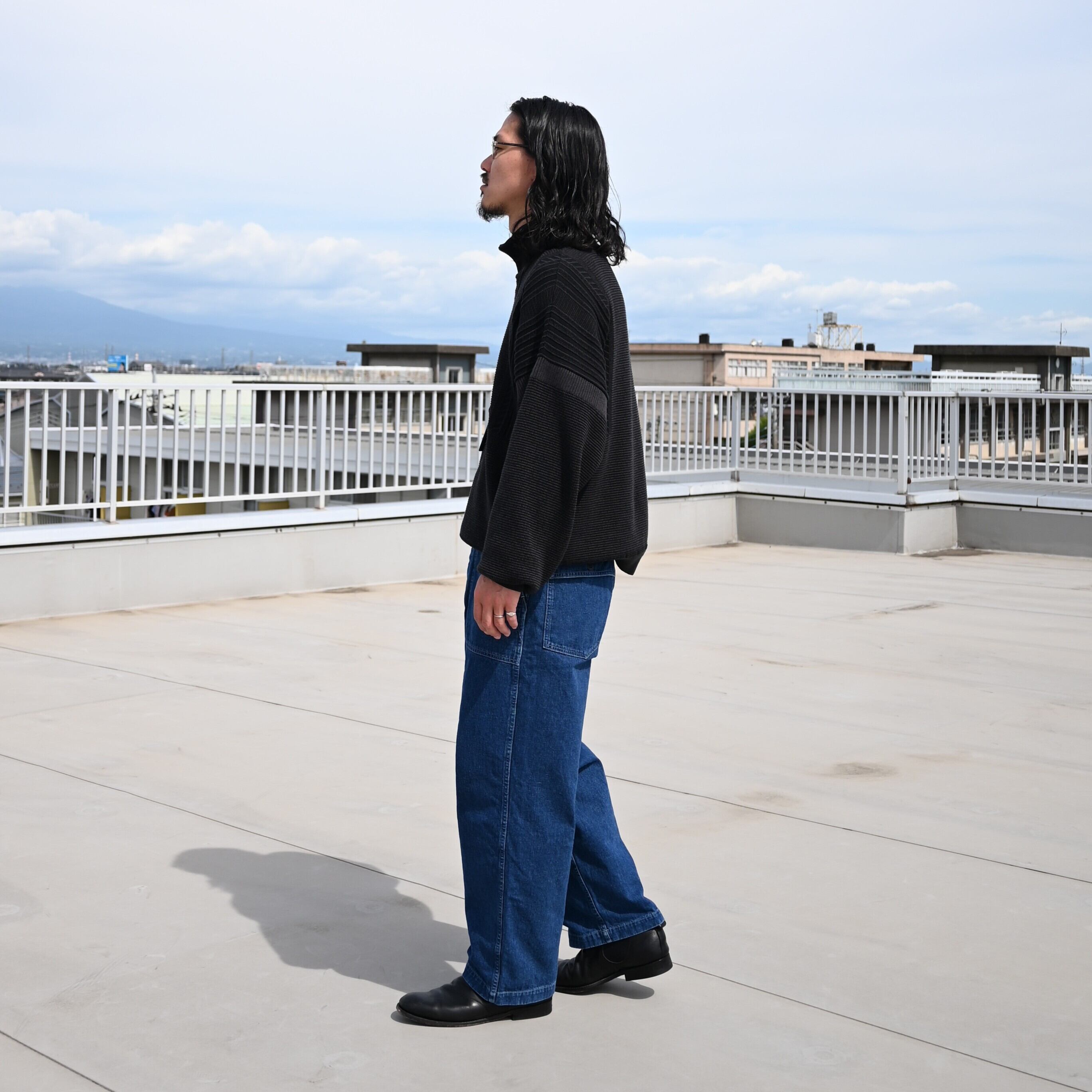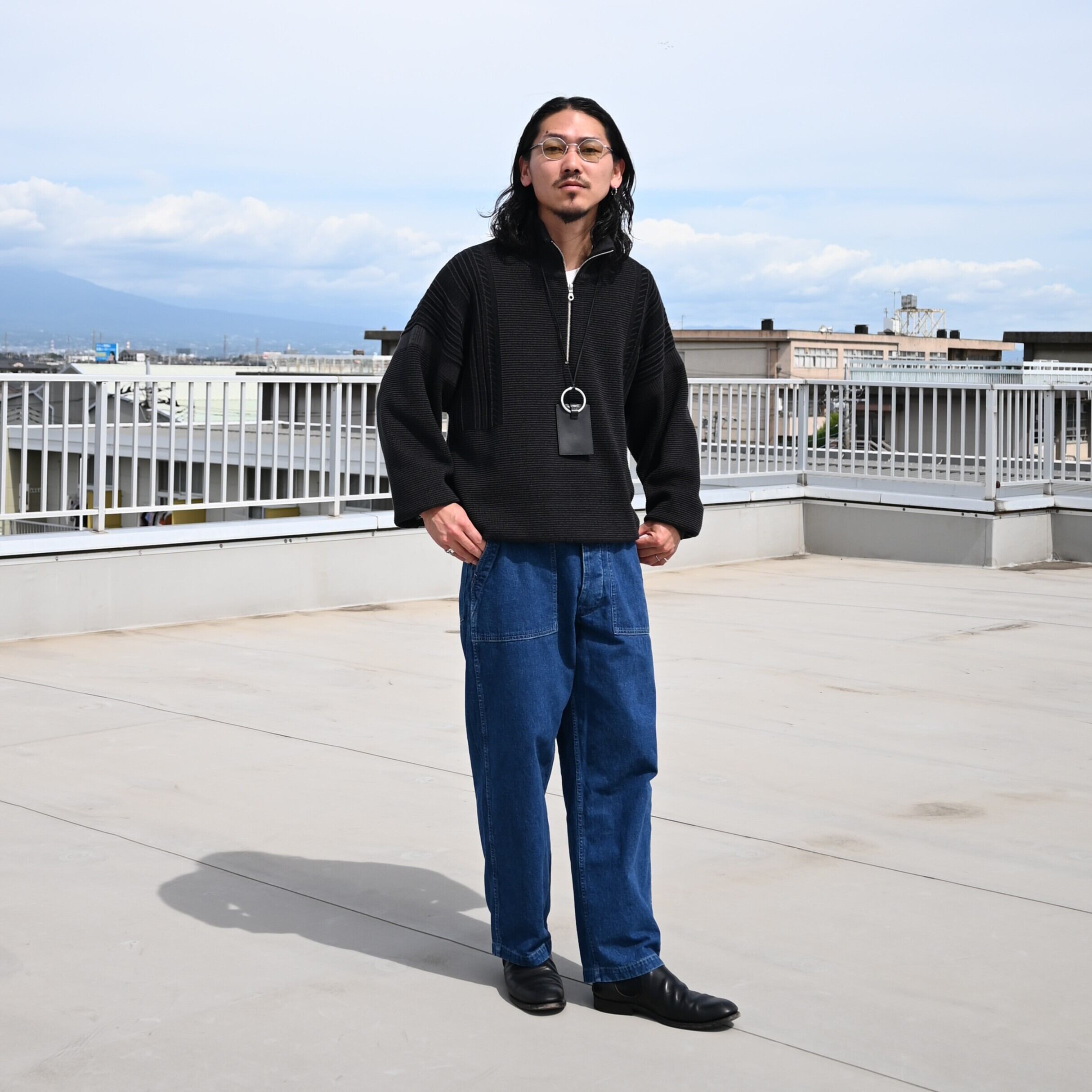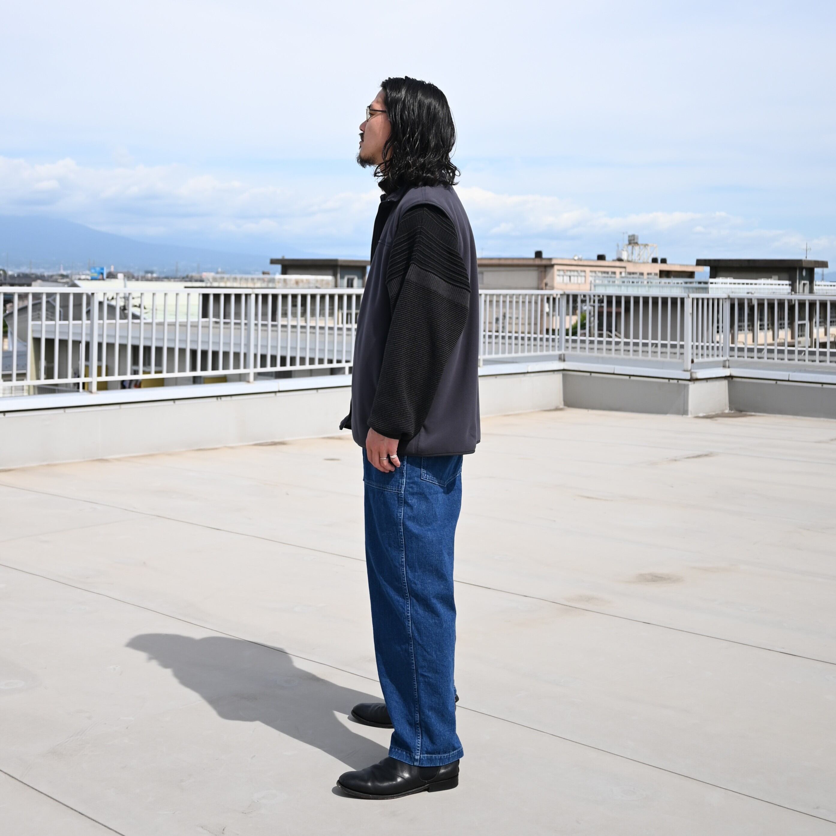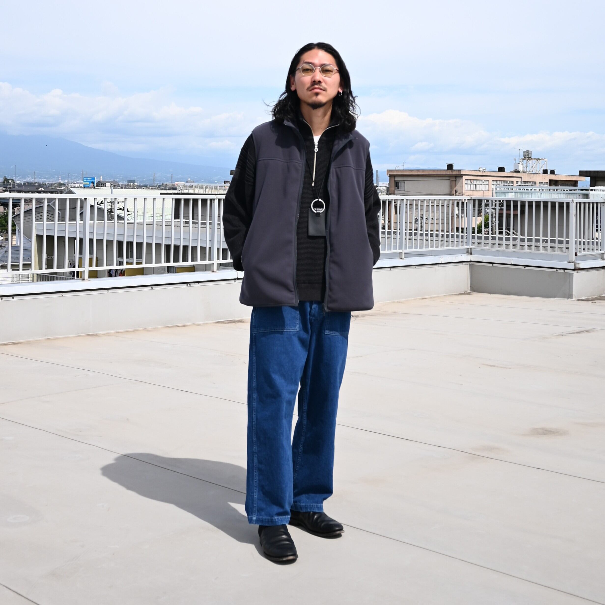 Wearing the THEDAY WIND ZONE FLEECE VEST as the main piece, paired with the YASHIKI Fuyushigure Half Zip Knit as an inner layer, and adding a touch of lightness with INTÉRIM’s USED SLUB YARN DENIM BAKER PANTS.