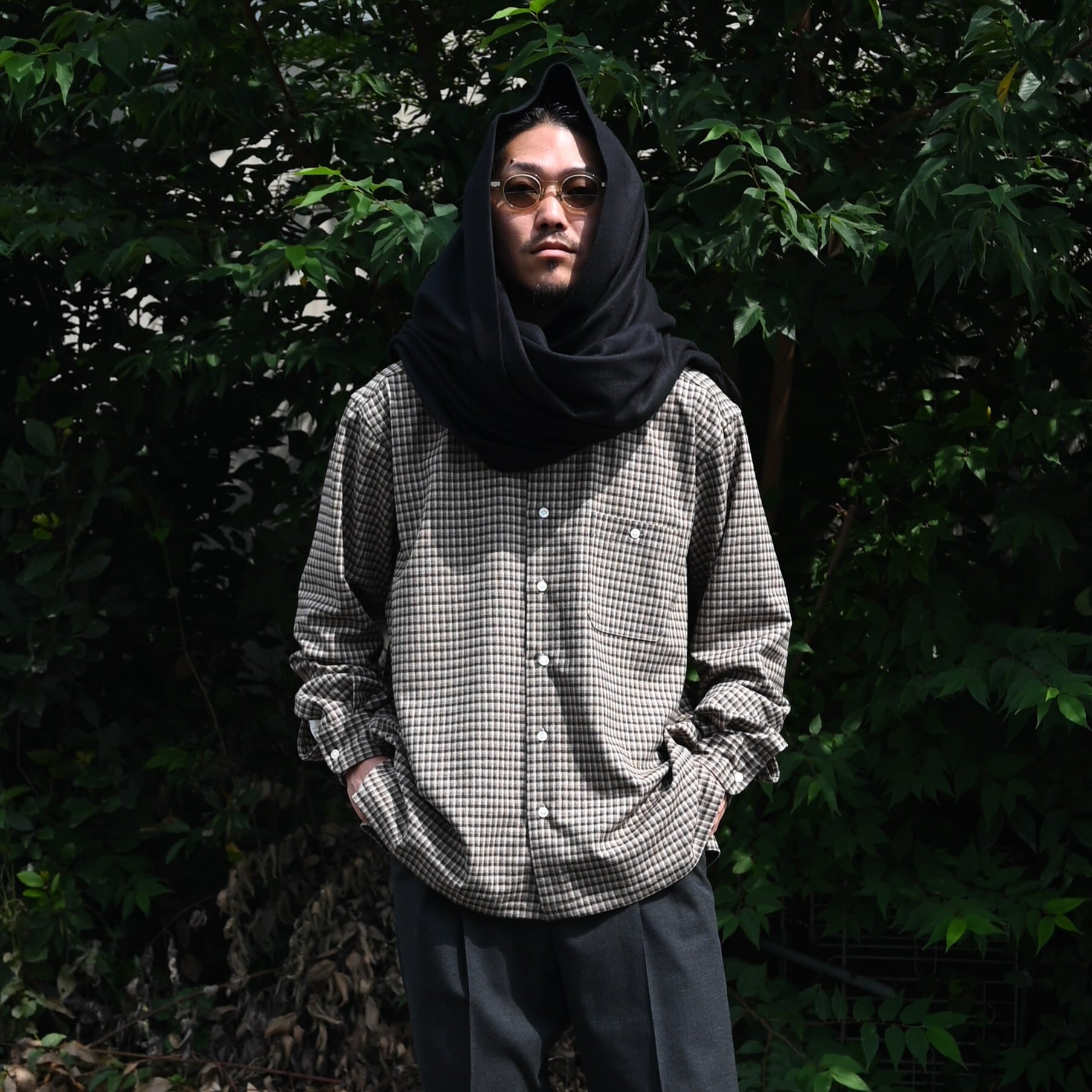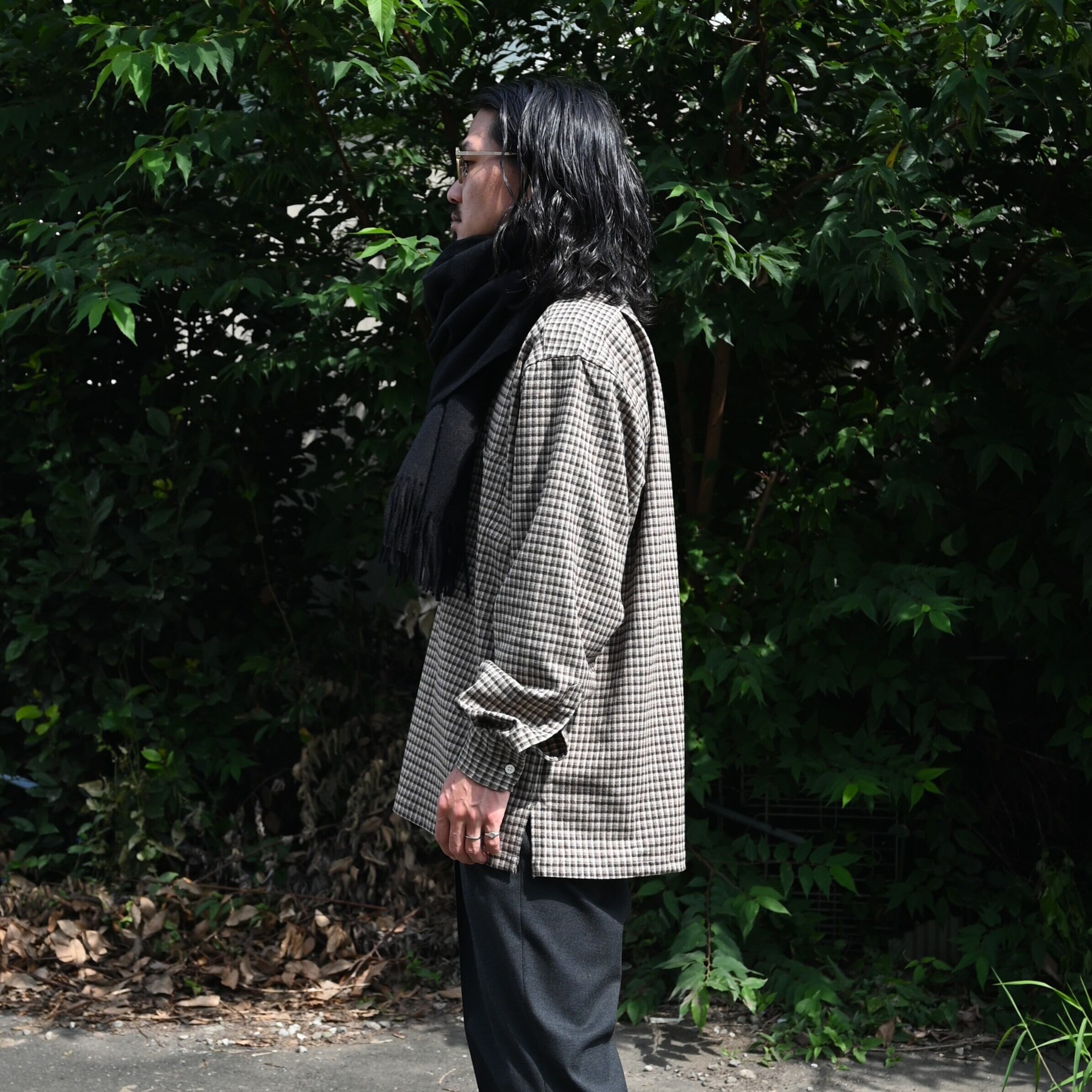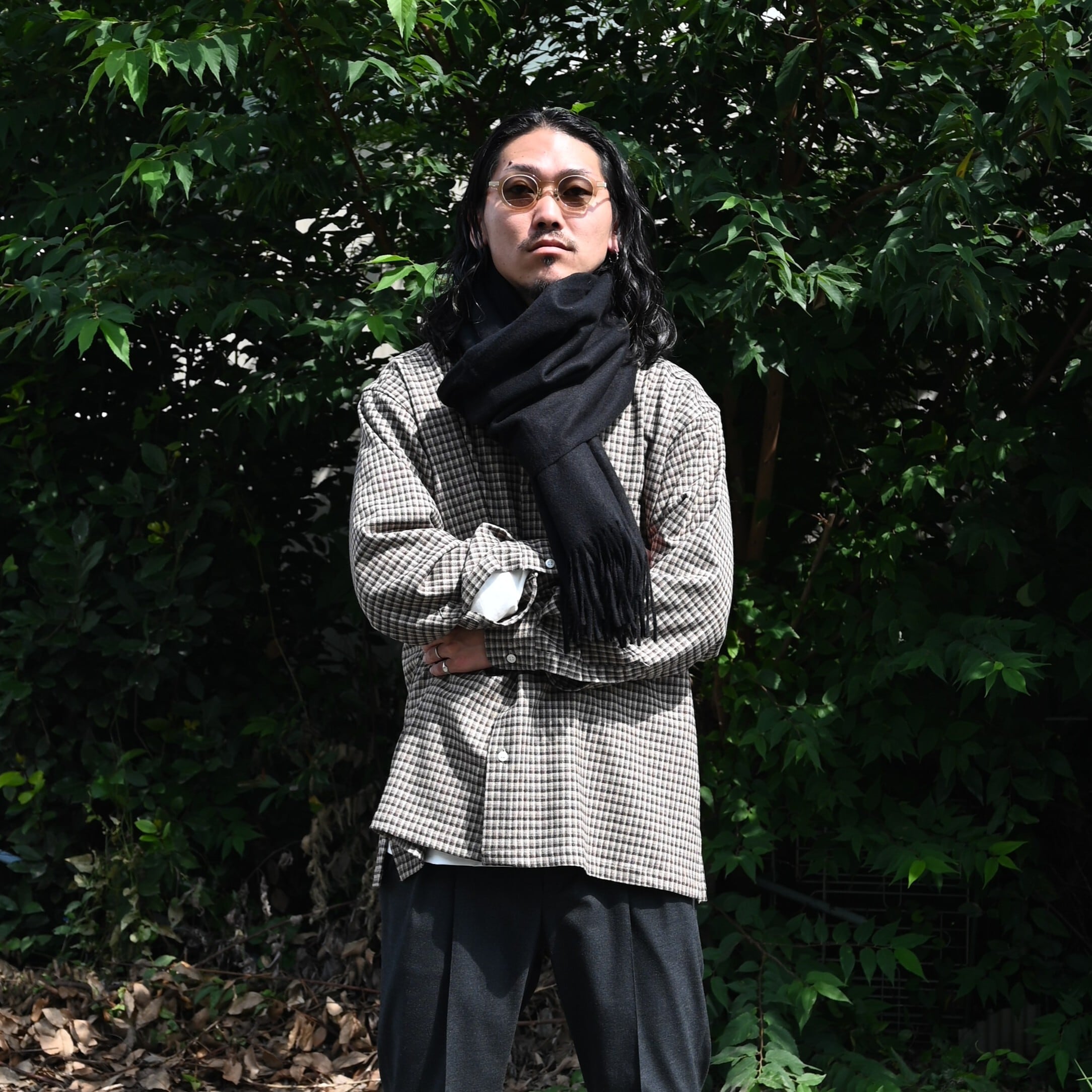 インナーにはインテリムのTRICOLOR CHECK GINGHAM DEADSTOCK SQUARE REGULAR SHIRTSを合わせてシックな雰囲気で着用いたしました。