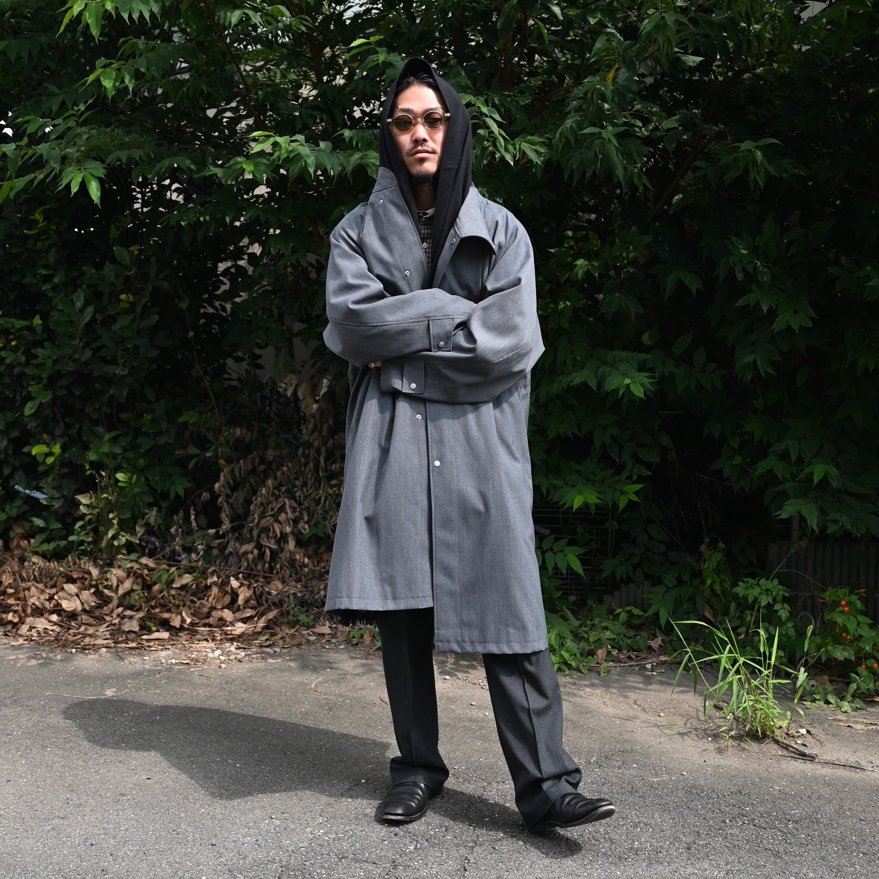 product twelve(プロダクトトゥウェルブ) T/W Rain Coat、バーバリークロスを採用し仕上げに撥⽔加⼯を施し、ウールとポリエステルの混紡⽷のもつ耐久性‧イージーケア性があるコート。