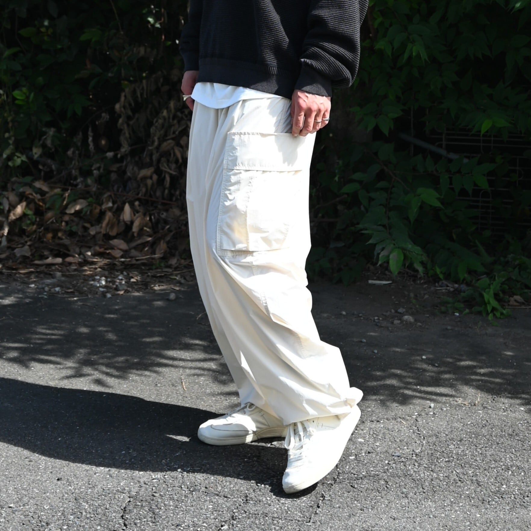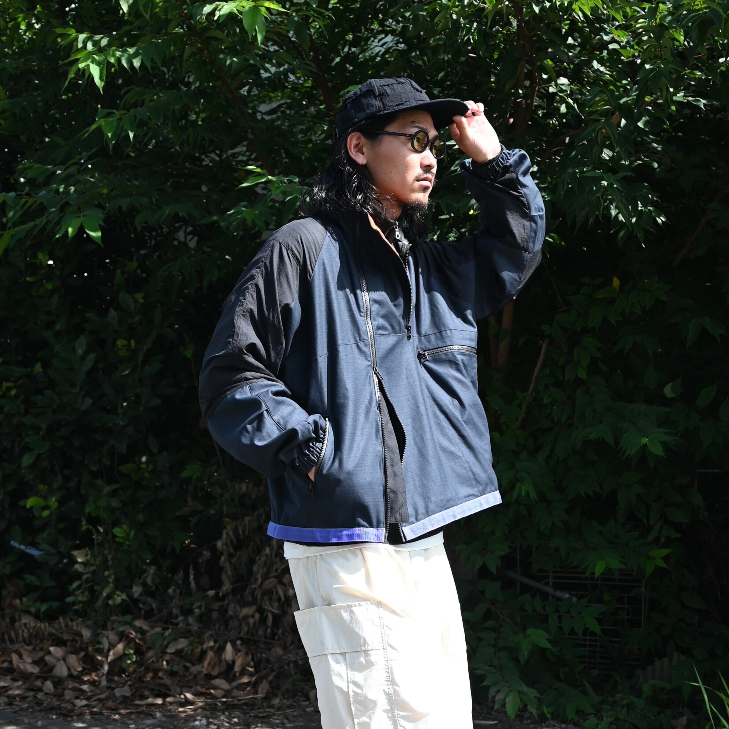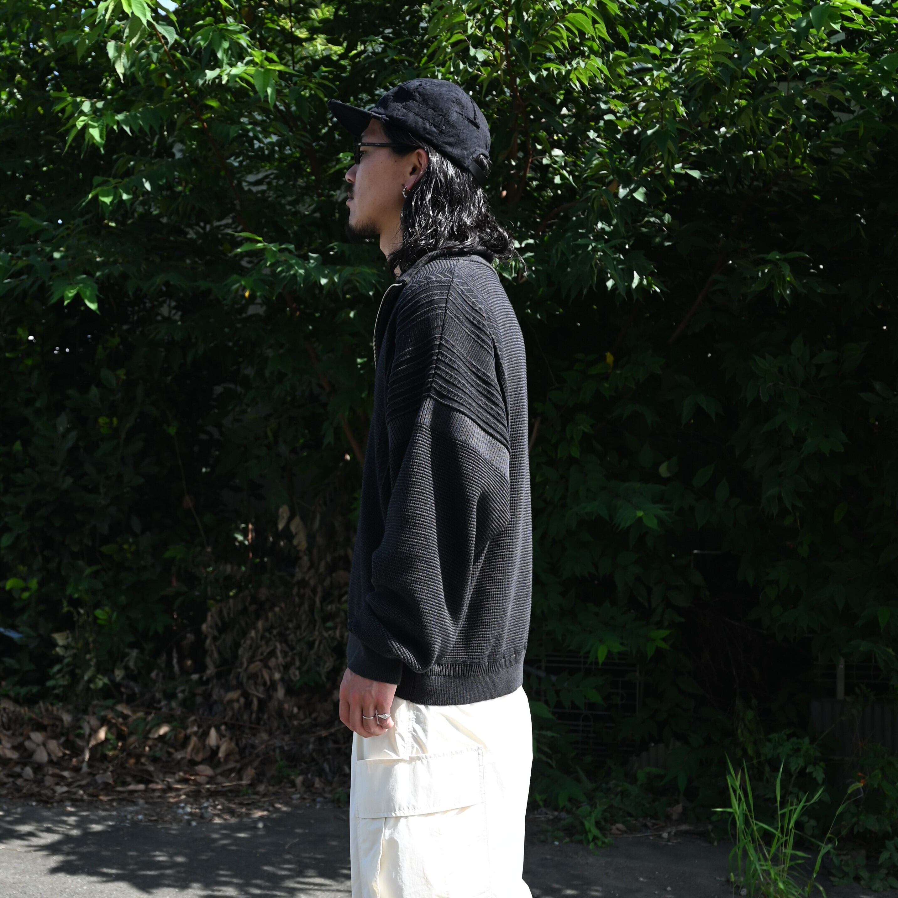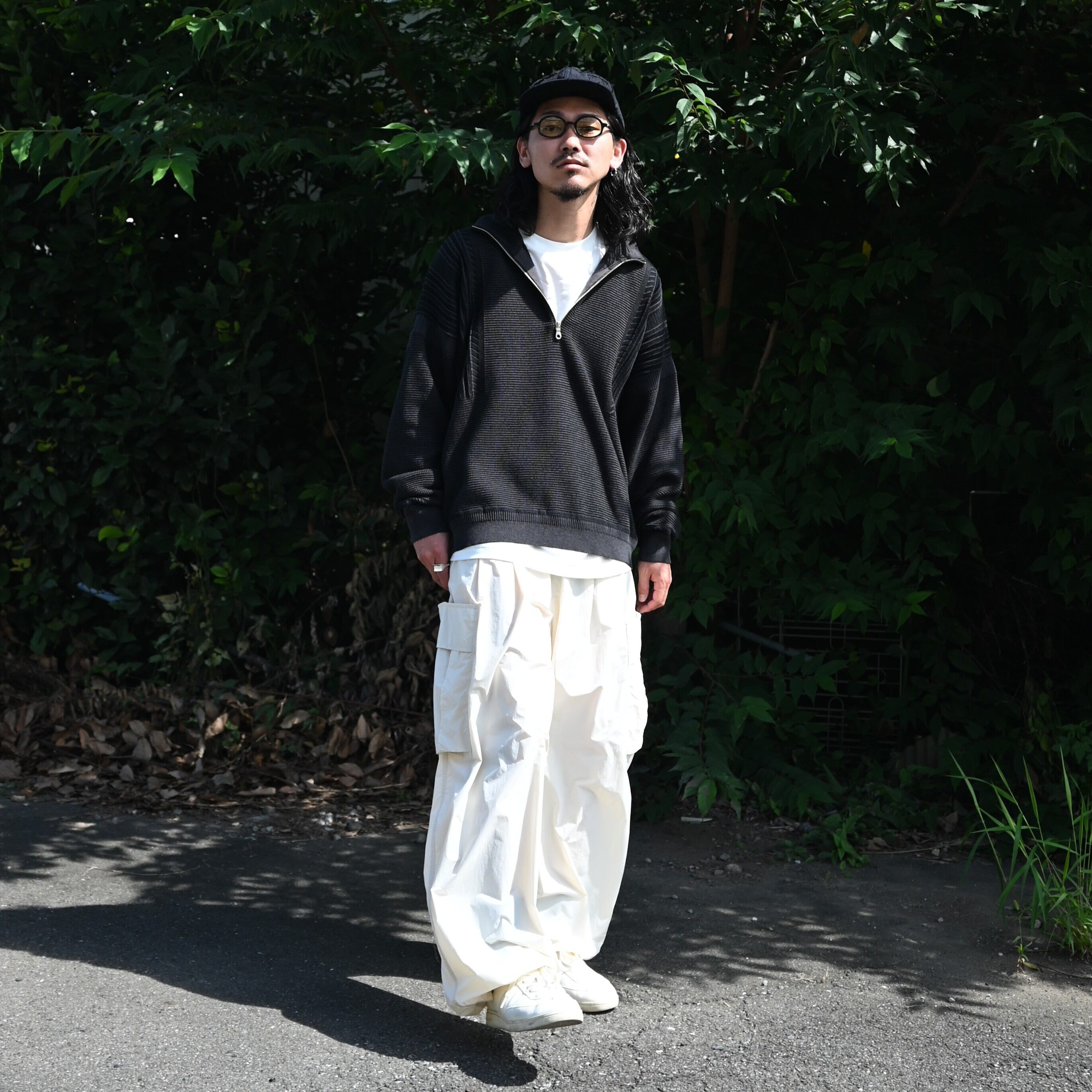 UNTRACE(アントレース)再入荷のライダースジャケットをメインにインナーにYASHIKI(ヤシキ)の Fuyushigure Half Zip Knitを合わせproduct twelve (プロダクトトゥウェルブ)のPT12 Utility Pantsを履きました。ネイビーのジャケットとエクリュのカーゴパンツはとても相性が良く、アウターパンツともに相乗効果で良さが際立ちます。