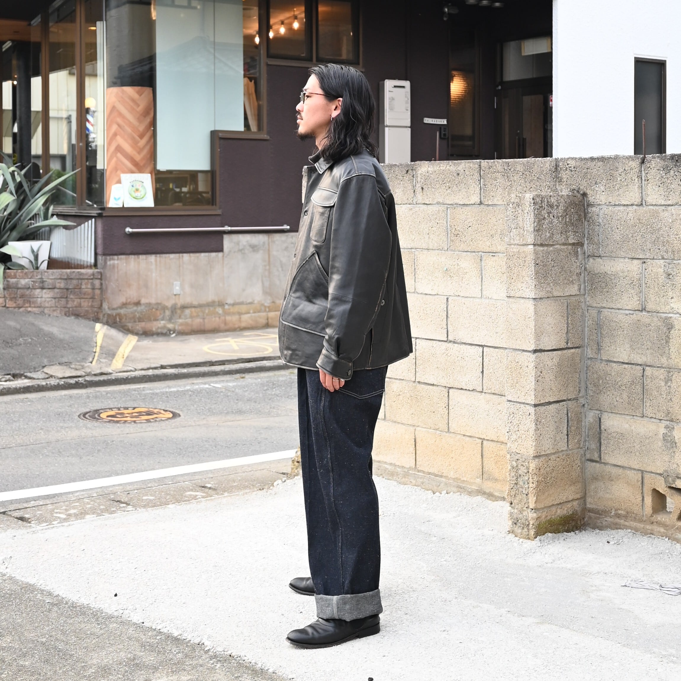 CCU(シーシーユー)の HUNTING JKTをメインにインナーにはOLDJOE(オールドジョー)のCROSS SHOULDER ANVIL OVERALLS、そしてYASHIKI(ヤシキ)のFuyushigure Half Zip Knitを合わせました。ヤシキのグレージュニットとレザージャケットの茶芯の風合いがとても相性良く、大人なだけど無骨さもほどよく残したスタイルになっております。