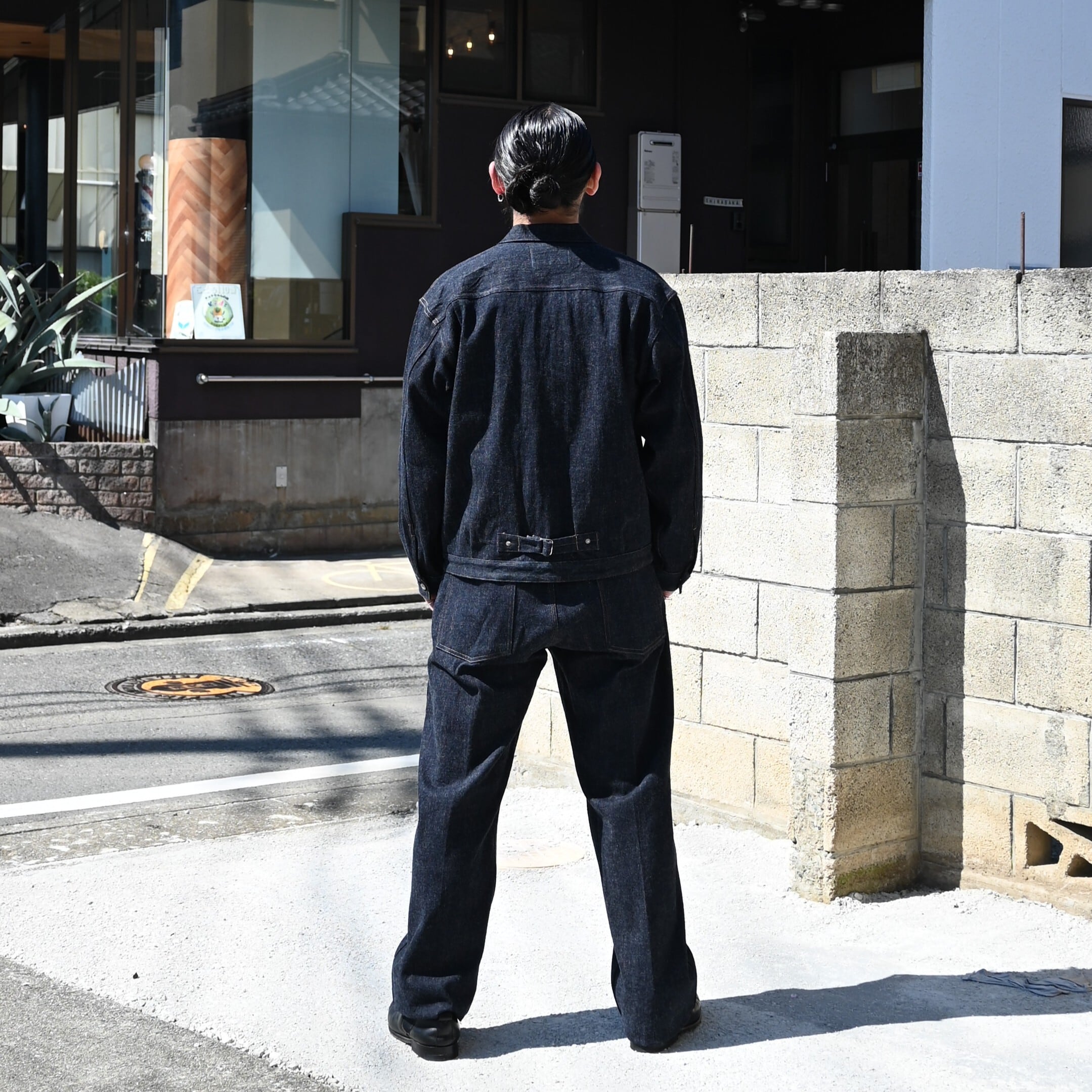 A total coordinated look featuring OLD JOE’s ONE POCKET JEAN JACKET and BELTLESS WAIST JEAN TROUSER "990" worn as a setup.