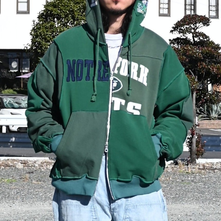 二枚のパーカーを解体、ドッキングして再構築したリメイクジップパーカー