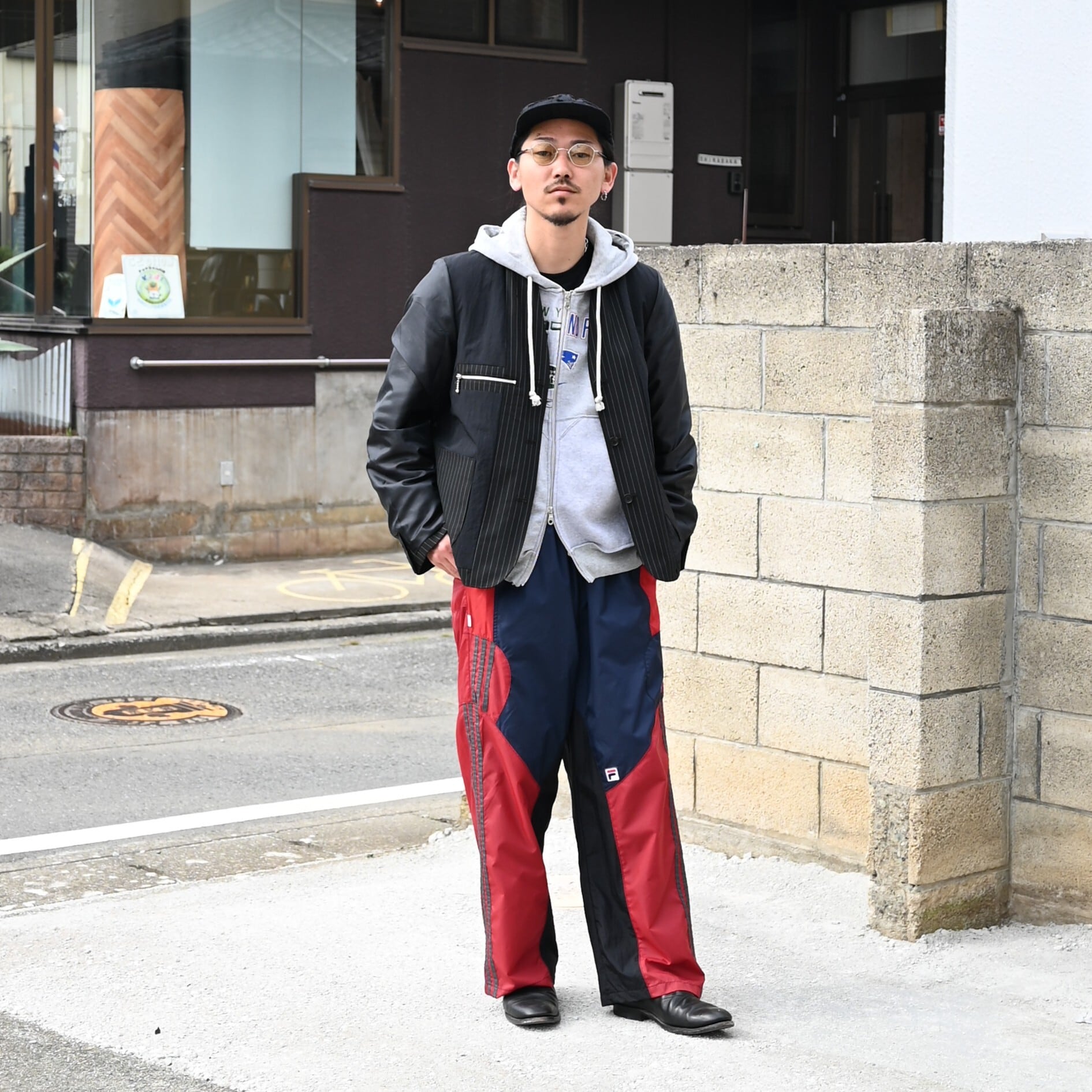 スポーツ要素のナイロンパンツをドレスとカジュアルのバランスを考え、足元を革靴にしたり、ジャケットを合わせたりしてスタイリングのバランスを取りました。