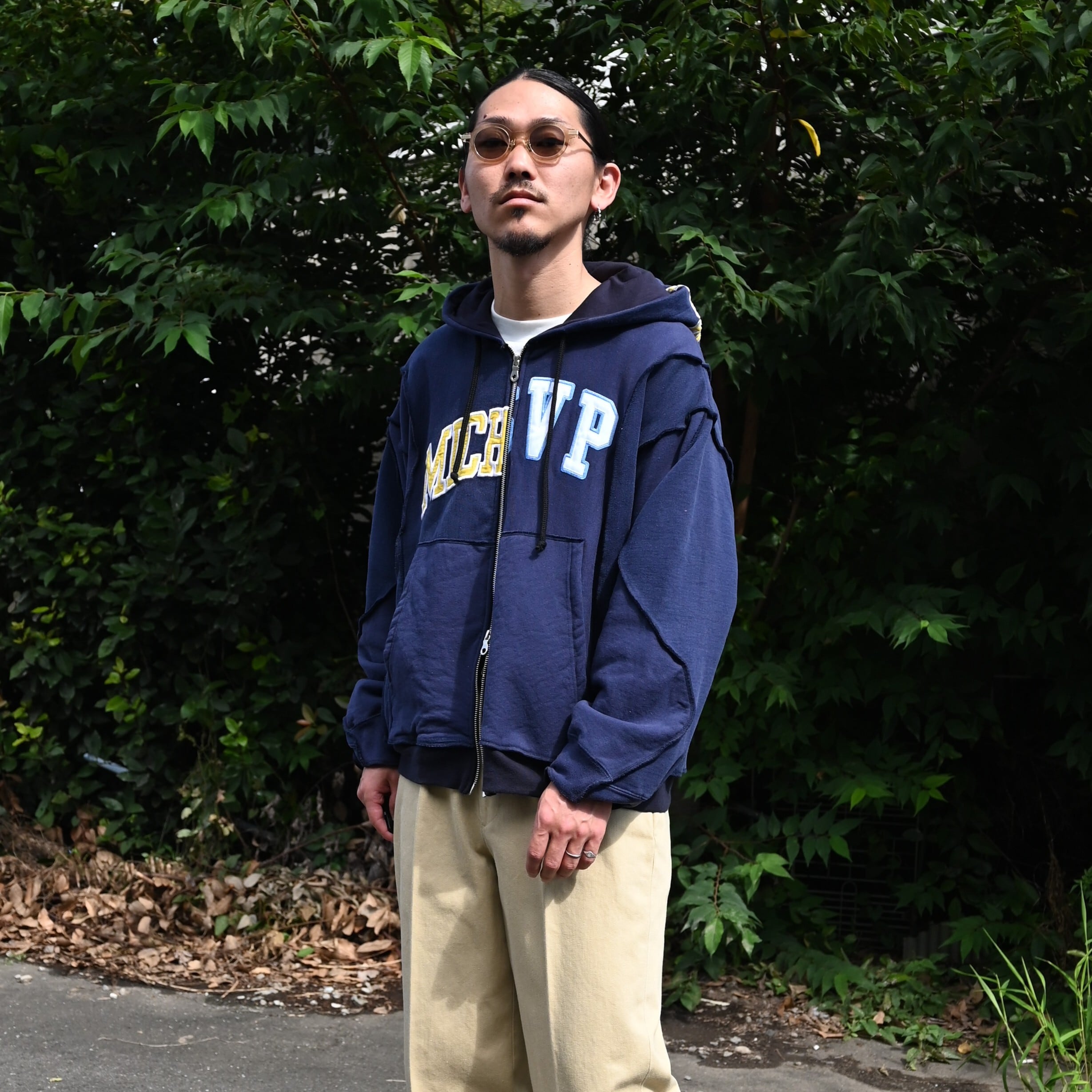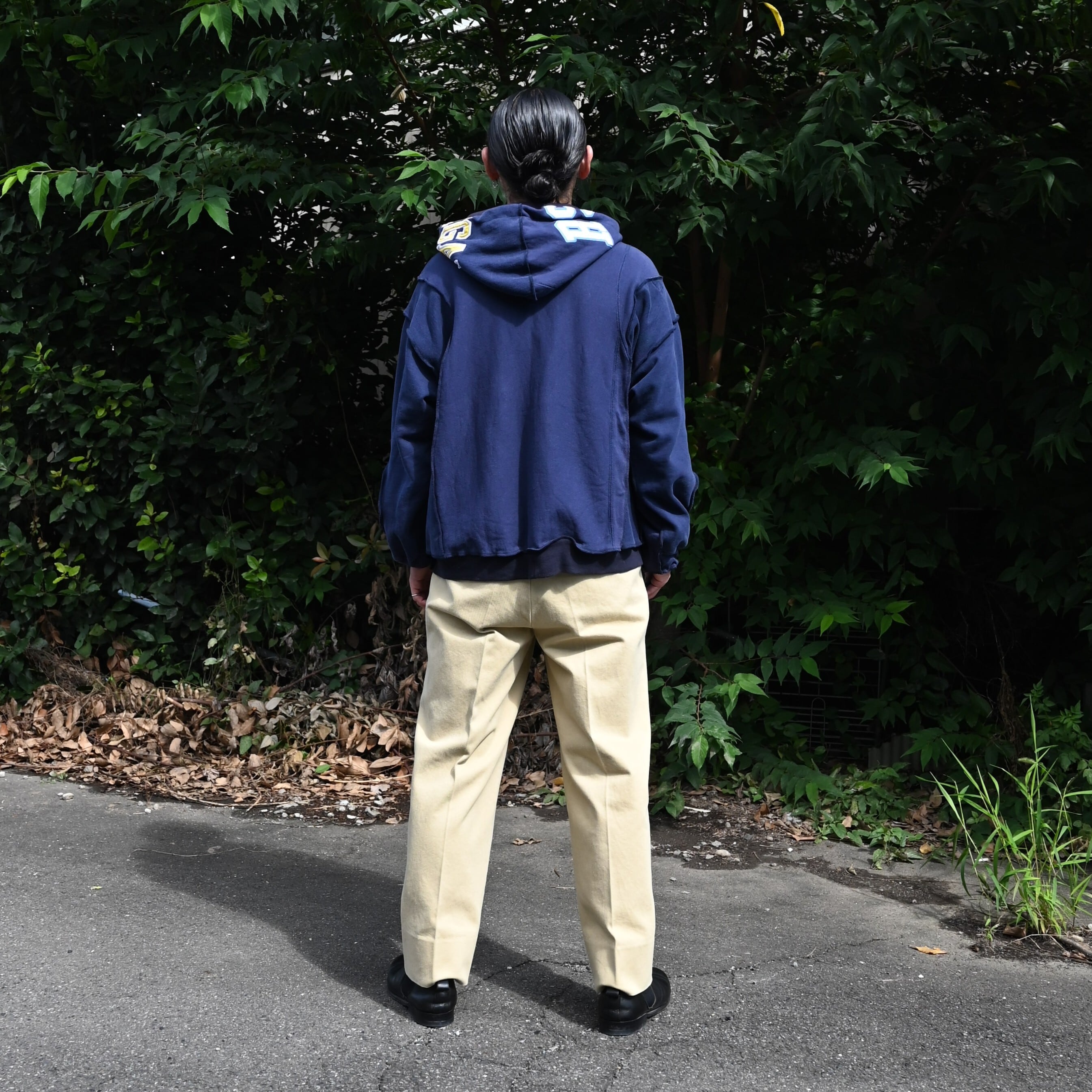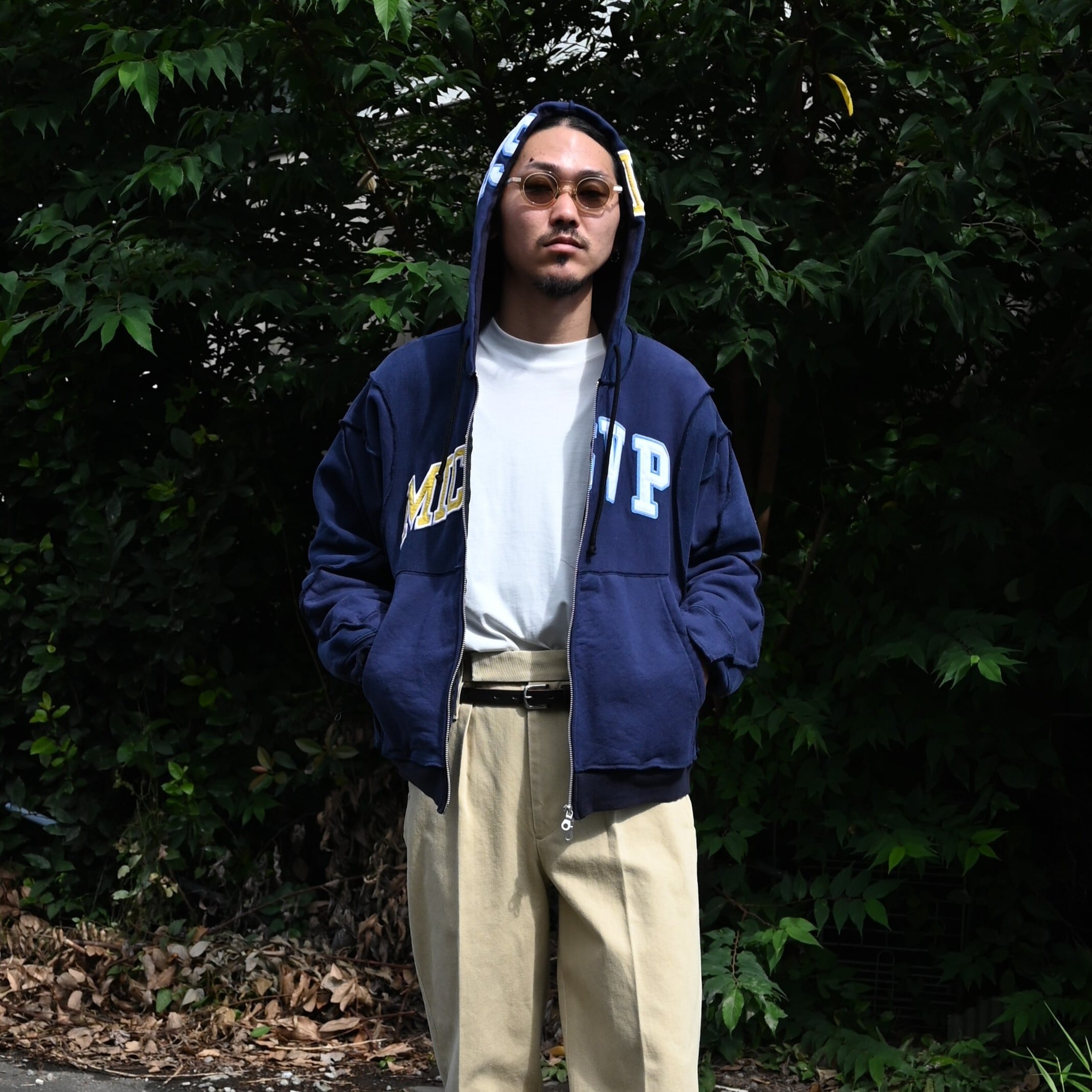 CHANGES(チェンジーズ)新作のSWITCHING HOODIEをメイン着用。INTÉRIM(インテリム)のHEAVY PIMA TWILL 1-TUCK FRENCH ARMY WIDE TAPERED TROUSERとTHEDAY(ザデイ)の MOLESKIN DOUBLE BREASTED JACKETと合わせ、クラシックスタイルにハズシをプラス。