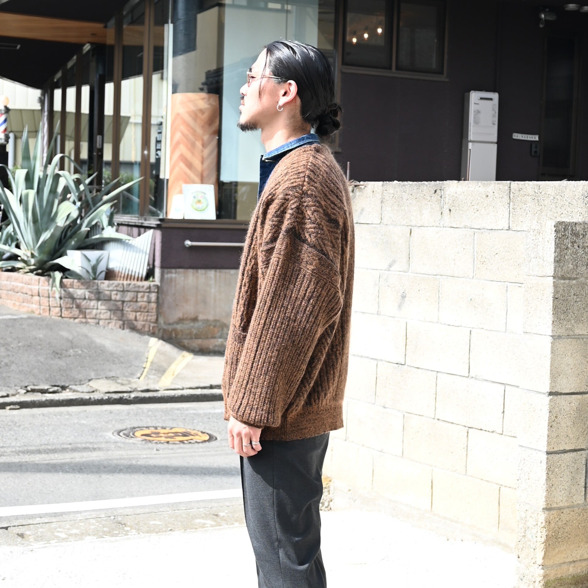 YASHIKI(ヤシキ)新作のSekkei mohair Cardigan をメイン着用。インナーにはVINTAGEITEMのLEE220-J Denim Jacketを合わせSAYATOMO(サヤトモ)の 2-Tack Slacksを着用しました。