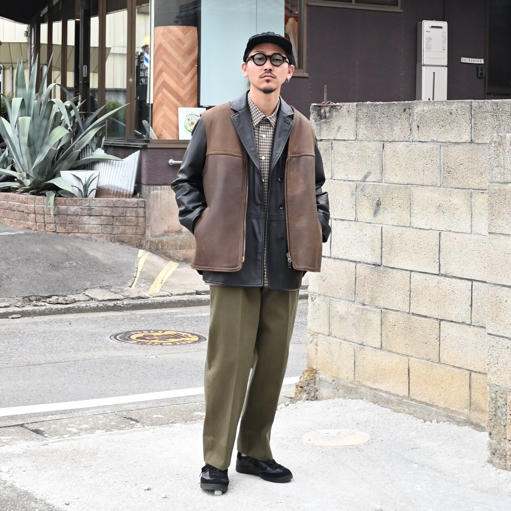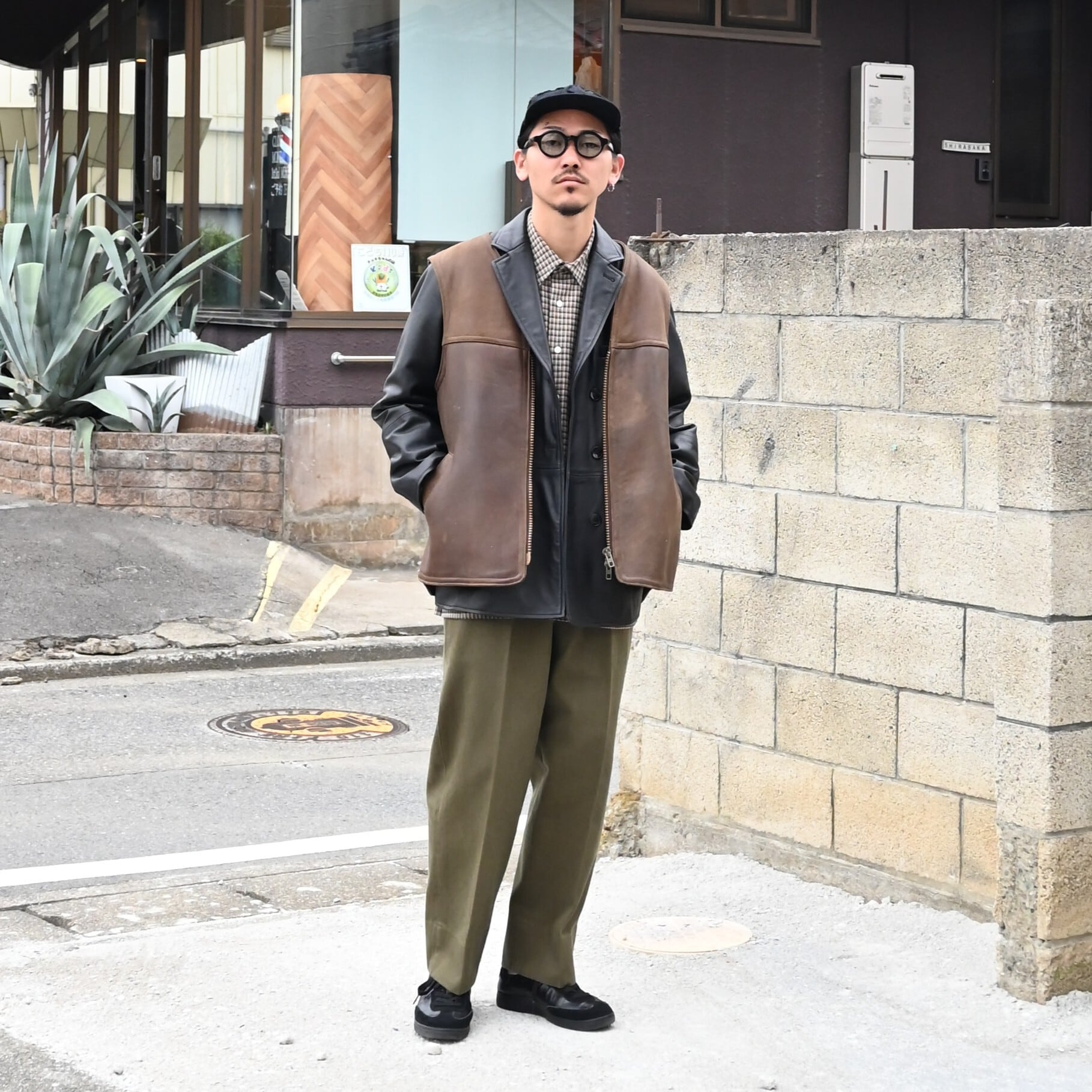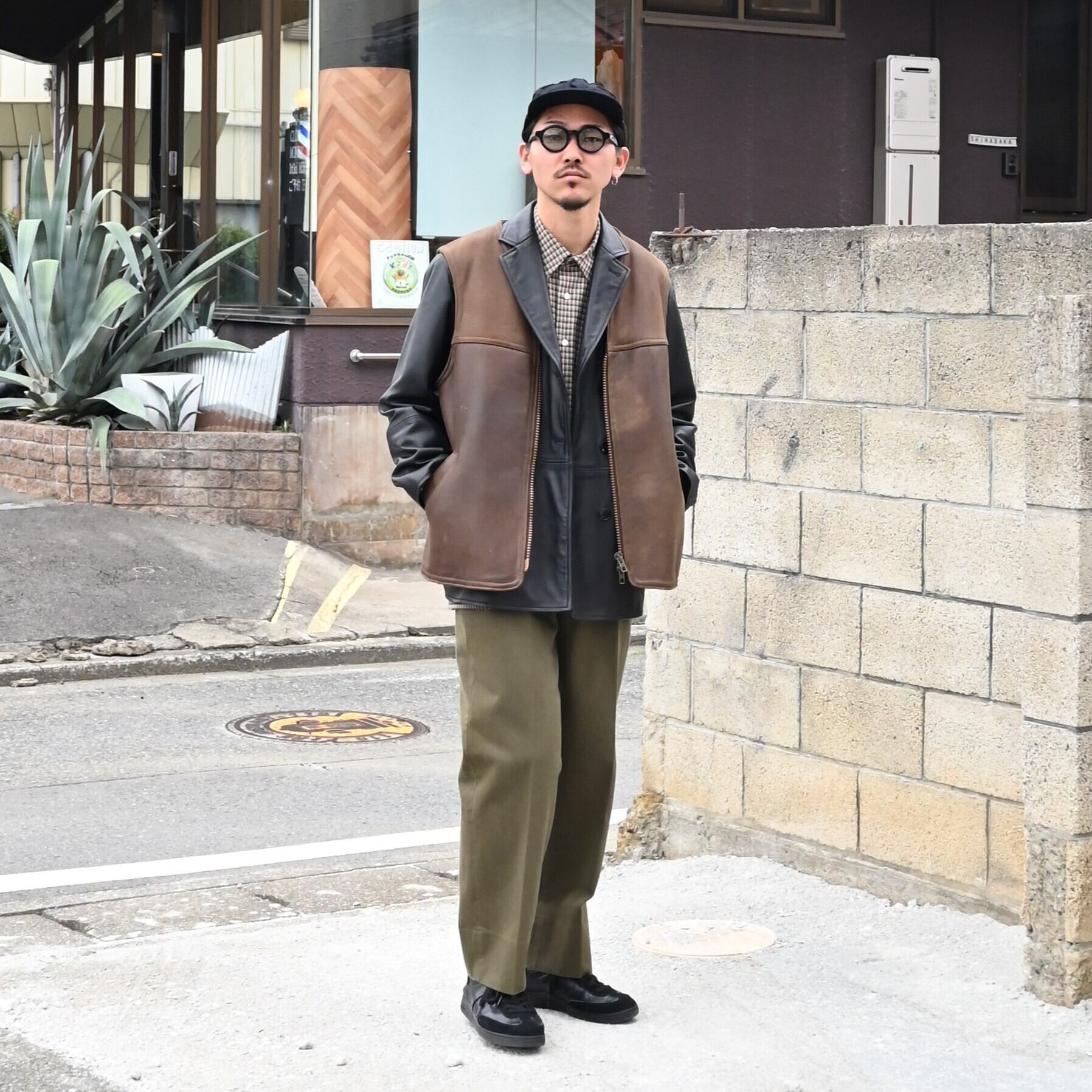 CCUの新作レザージャケットにvintageのレザーベストを合わせました。