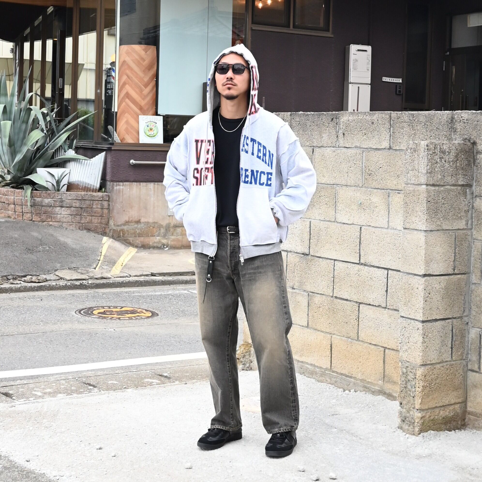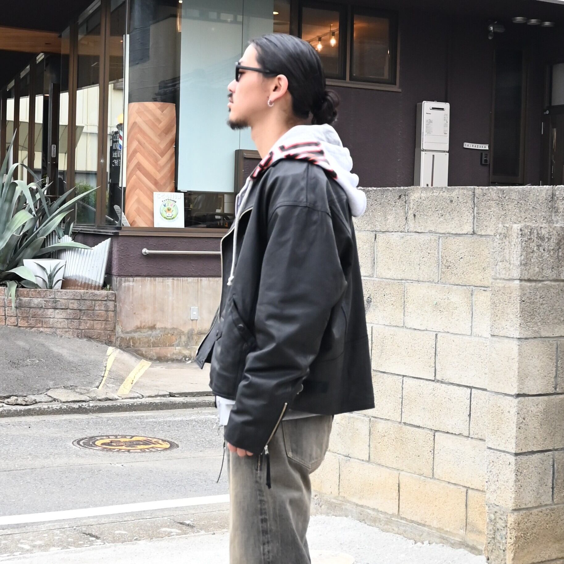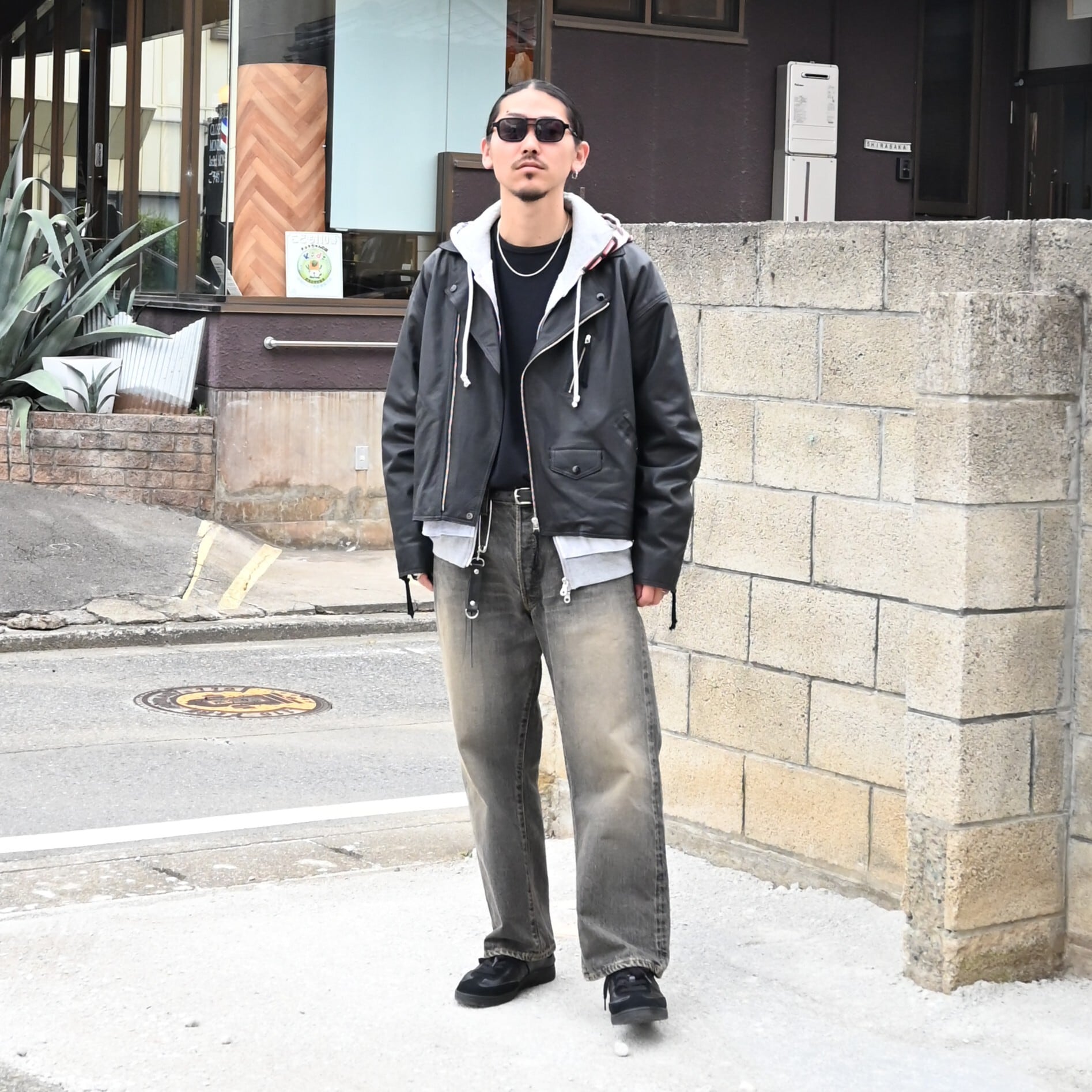 Styled around the CCU (Sea Sea You) x sandwater Double Riders Jacket, paired with a CHANGES (チェンジーズ) SWITCHING HOODIE as the inner layer, and completed with INTÉRIM SHABBY VINTAGE "1947XX" SHUTTLE DENIM TROUSERS to add a touch of rugged character.