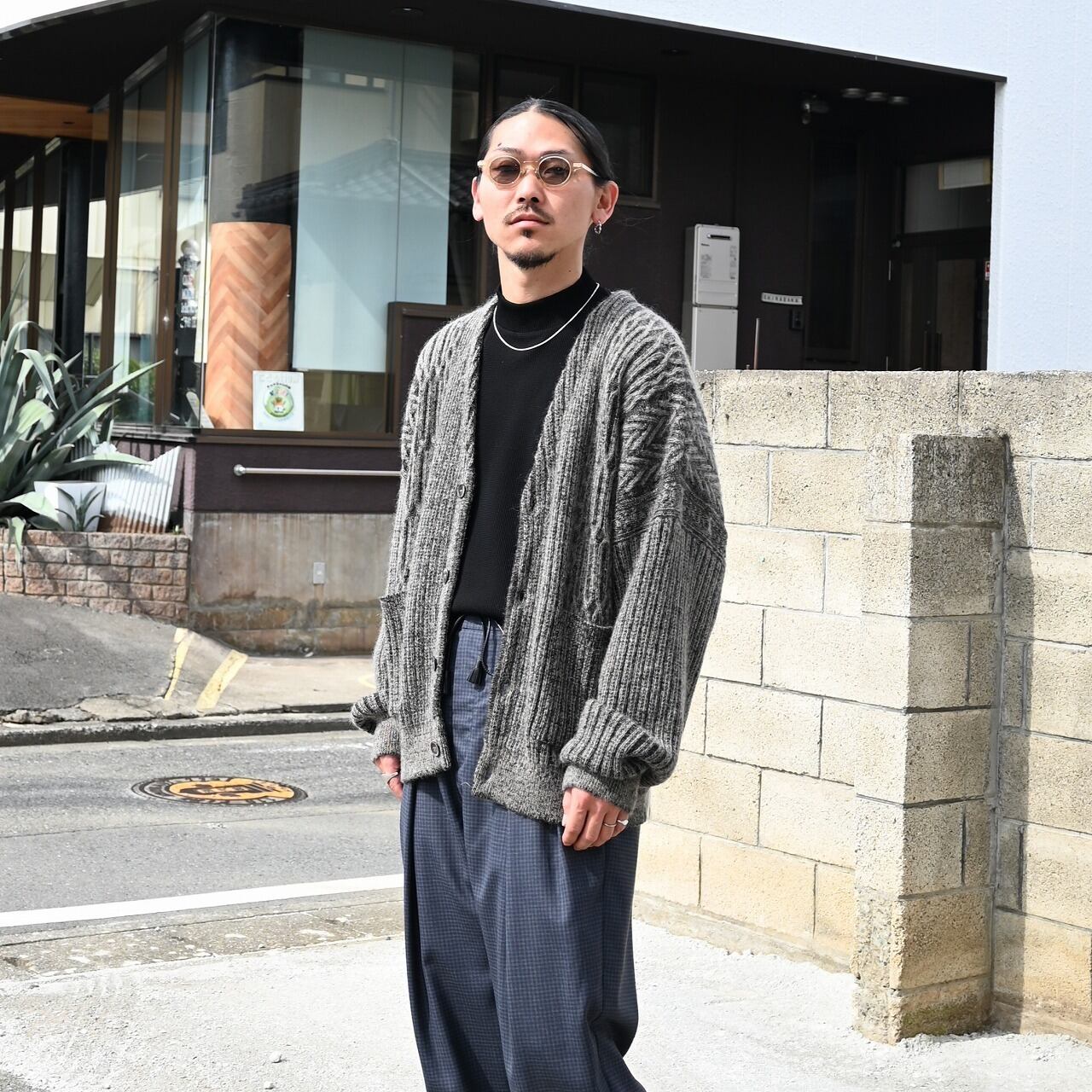 YASHIKI (ヤシキ)Sekkei mohair Cardigan ベージュカラーをメイン着用。JACKETはTHEDAY(ザデイ)の MOLESKIN DOUBLE BREASTED JACKETを合わせました。タートルネックとスラックスはtangenet (タンジェネット)です。シンプルなスタイルにベージュカラーのモヘアが差し色となってくれています。