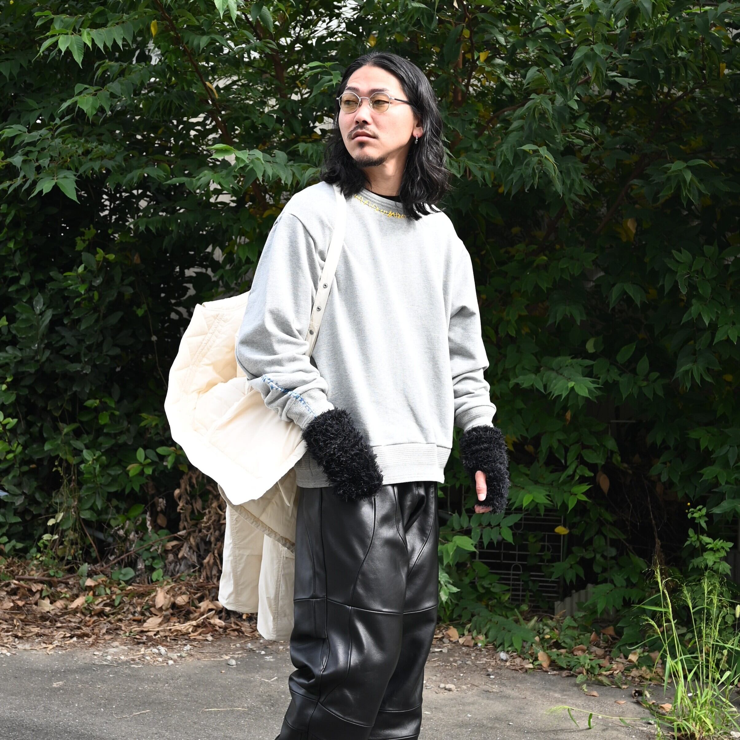 The outer fabric is made from high-quality lamb leather composed of 36 parts, and the lining is made from a disassembled 100% cashmere shawl used for the Leather Coverup Pants. They are inspired by cover pants typically found in military styles, and the size balance is perfect.