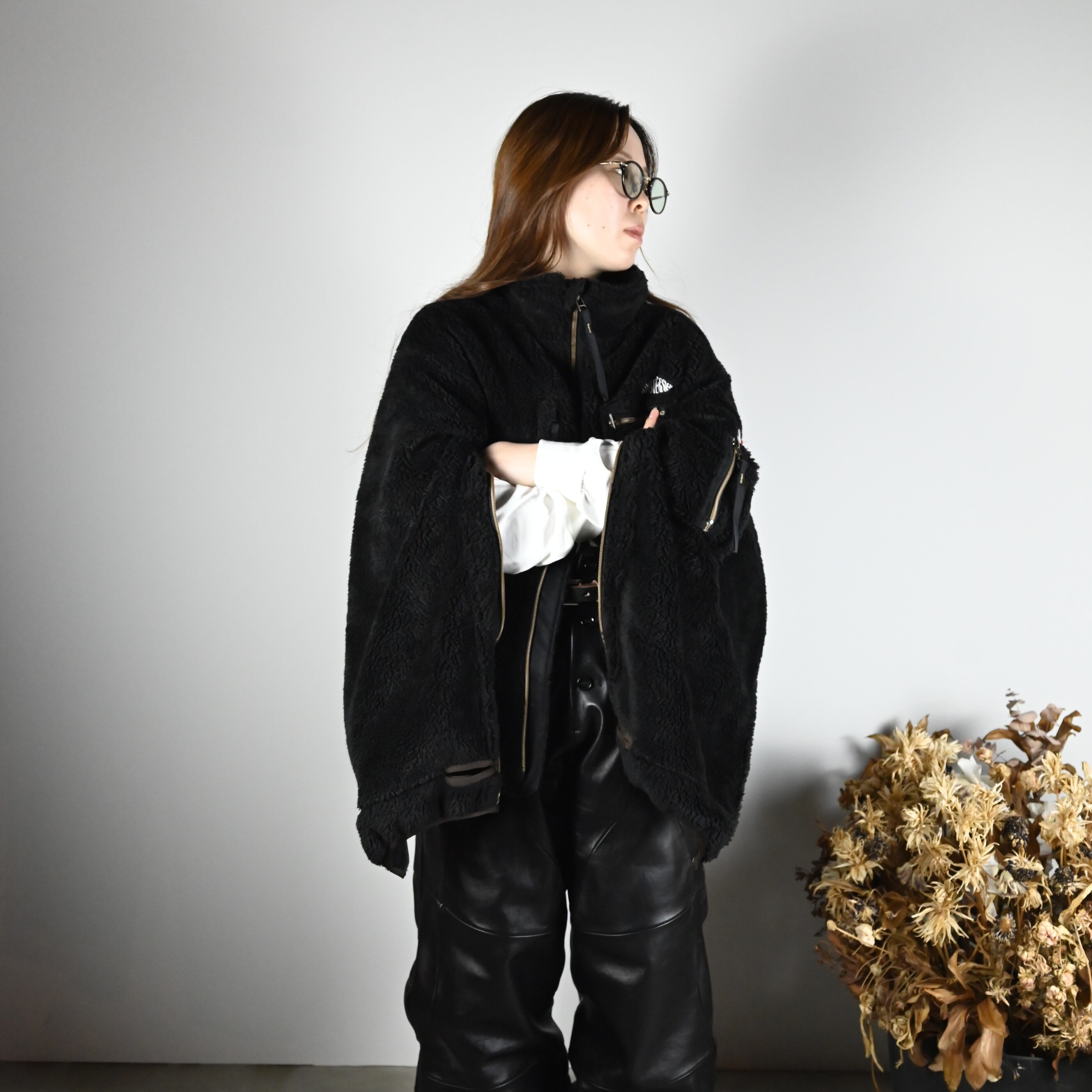 Leh(レー)25AW新作のBoa Fleece Blousonをメインにインナーinterim(インテリム)のHIGH GAUGE SUVIN JERSEYE L/S TEEを合わせ同じくLEH(レー)のLeather Coverup Pantsを合わせました。
