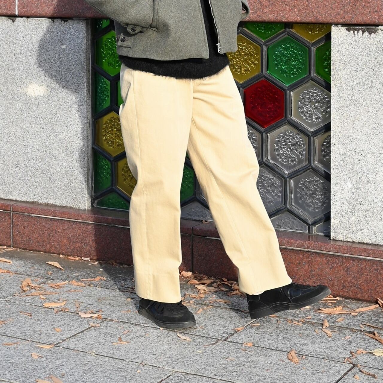 今回はインナーにモヘアニットを合わせ、チノスラックスを着用。暗くなりがちな秋冬ファッションは色物を入れると新鮮です。