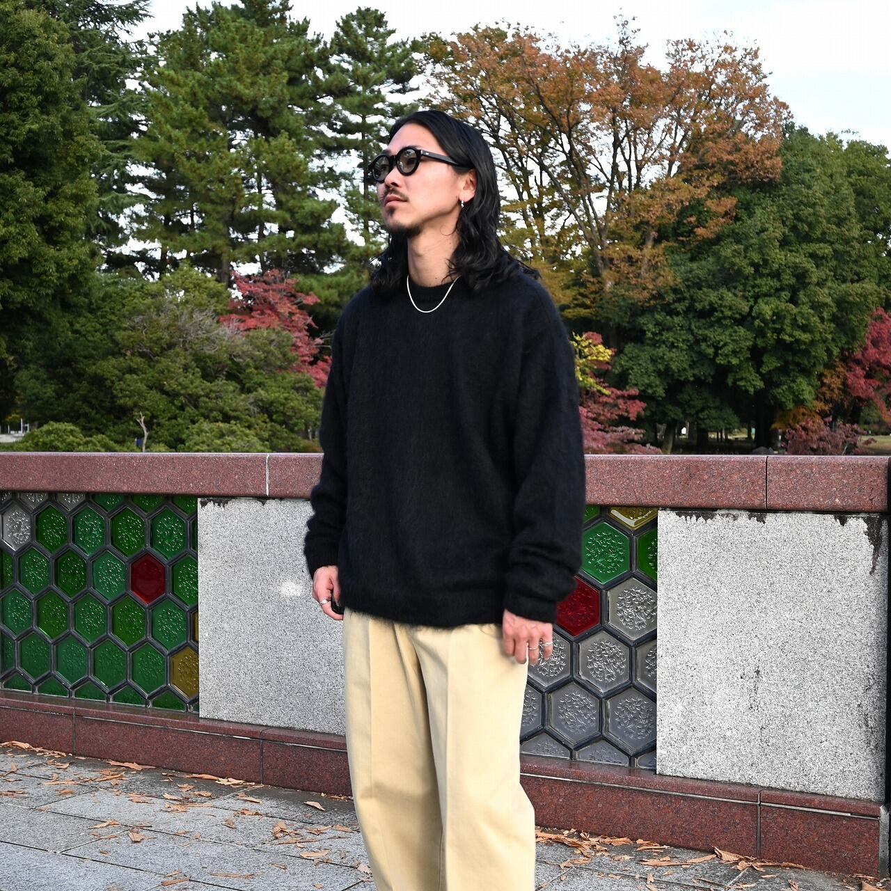 INTERIM(インテリム)キッドモヘア×アルパカ×ウールのクルーネックニットをメイン着用。私の背丈でサイズ4を着用してややゆとりのあるサイズ。袖はためて着用するためにあえて長めの設定です。モヘアニットを際立たせるためにベージュのチノスラックスを合わせました。