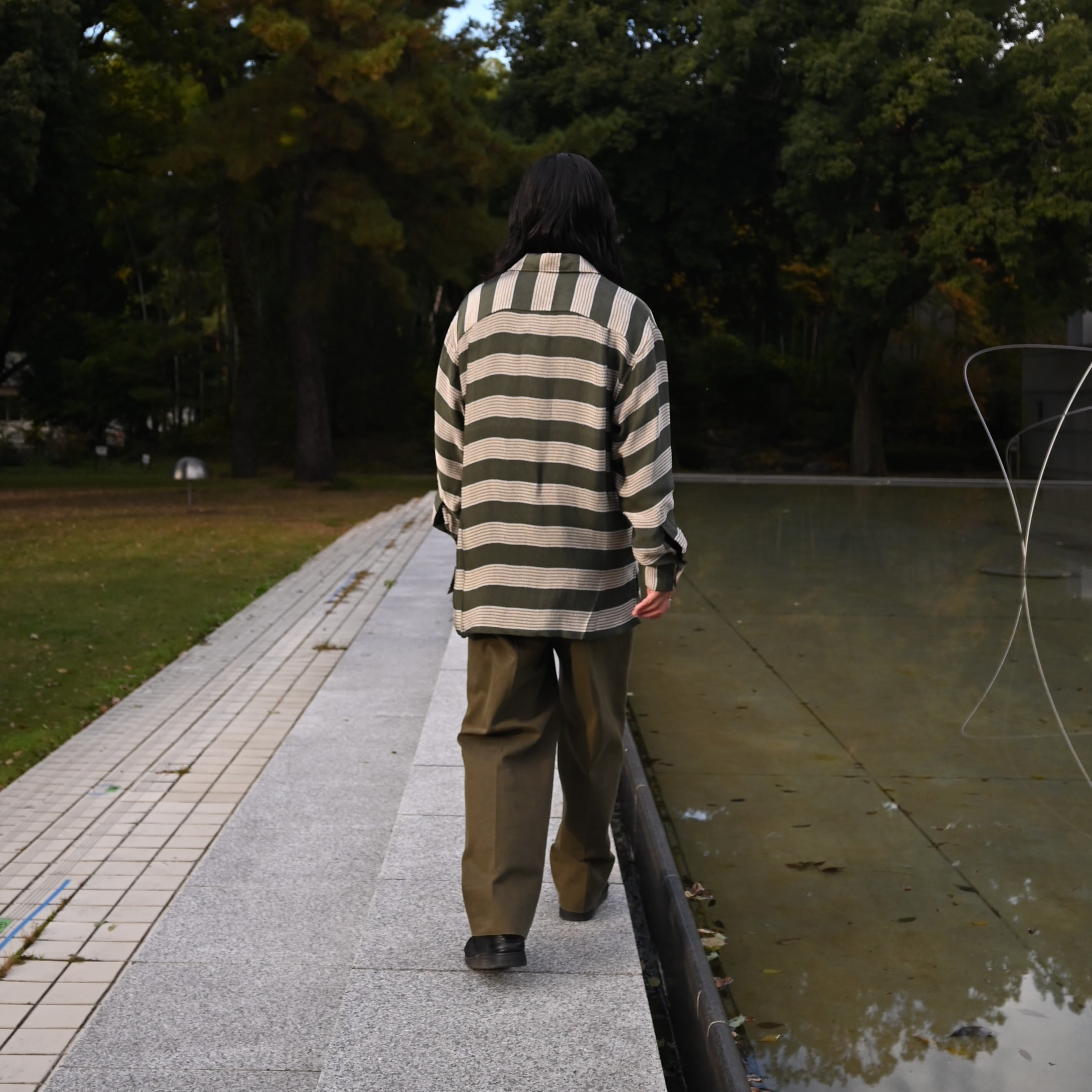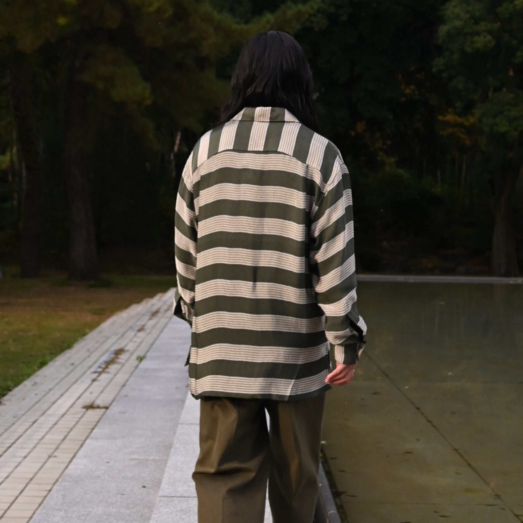 Styling the new INTERIM KID MOHAIR ALPACA SHAGGY CARDIGAN as the main piece, paired with the HYPER BIG VISCOSE STRIPE 60s OPEN COLLAR SHIRT and the HEAVY PIMA TWILL 1-TUCK FRENCH ARMY WIDE TAPERED TROUSERS.