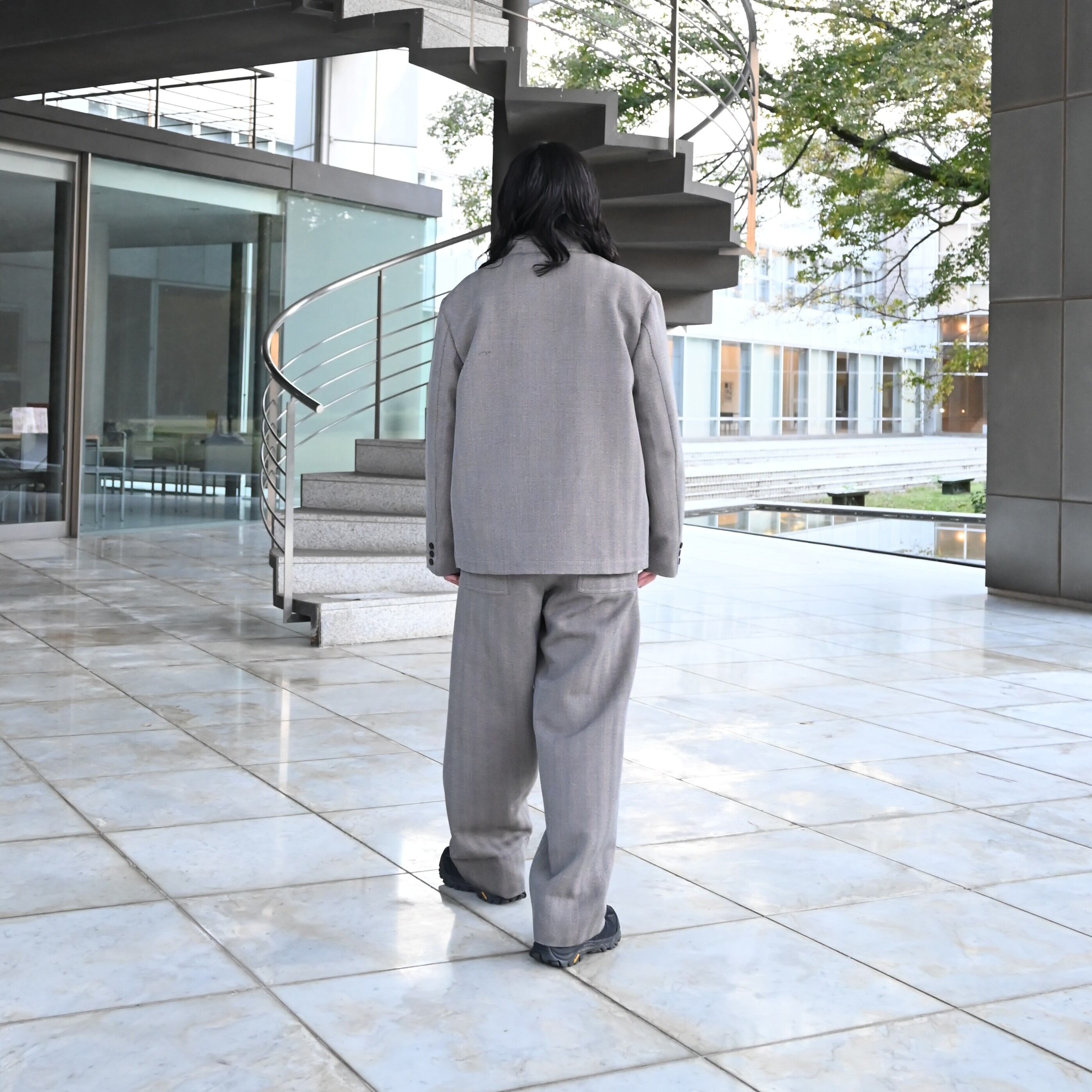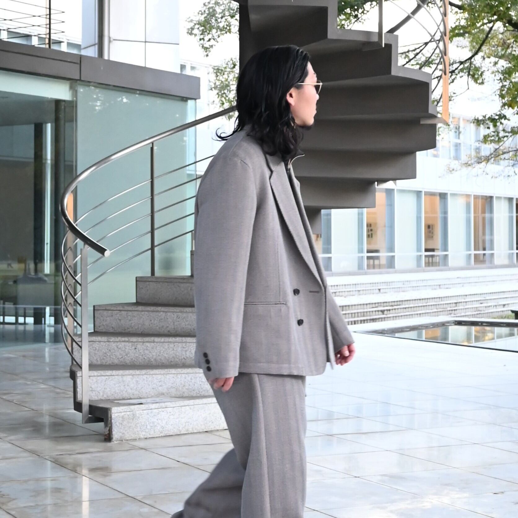 Wearing the new INTERIM STRUCTURED DIAGONAL MELANGE WOOL DEADSTOCK PIPING DOUBLE JACKET and STRUCTURED DIAGONAL MELANGE WOOL DEADSTOCK BELTED MIL BAGGY TROUSERS as a setup.
