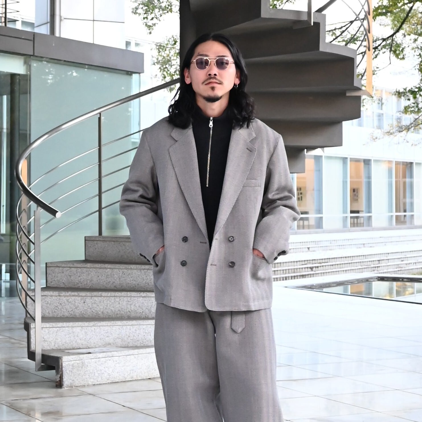 INTERIM(インテリム)新作のSTRUCTURED DIAGONAL MELANGE WOOL DEADSTOCK PIPING DOUBLE JACKETとSTRUCTURED DIAGONAL MELANGE WOOL DEADSTOCK BELTED MIL BAGGY TROUSERをセットアップ着用。インナーにYASHIKI(ヤシキ)のFuyushigure Half Zip Knitを合わせてスタイリングを引き締めました。