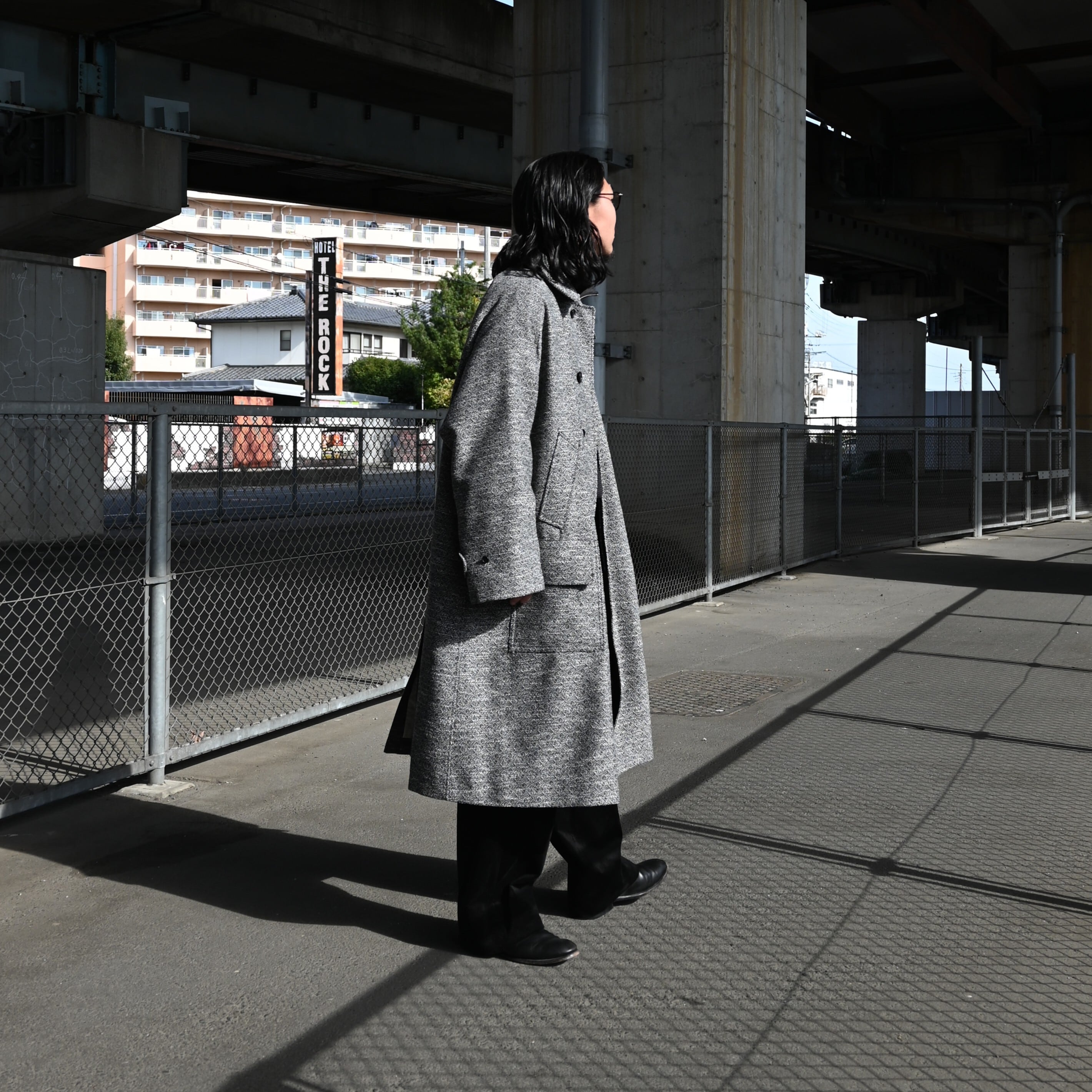 Wearing INTERIM’s DOUBLE SIDED JACQUARD TWEED DEADSTOCK HYPER BIG HUNTING OVER COAT as the main piece.