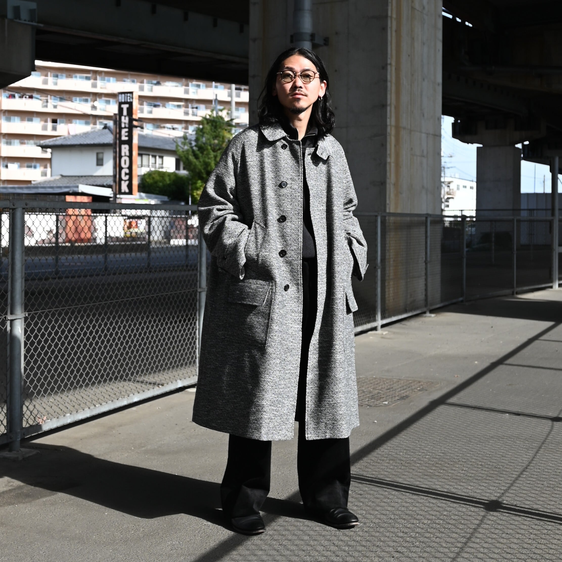 For the inner layer, I paired it with YASHIKI’s Fuyushigure Half Zip Knit, and styled it with the 9W Linen Cotton Corduroy Belted Mil Baggy Trousers to create a look that highlights the coat’s fabric and presence.