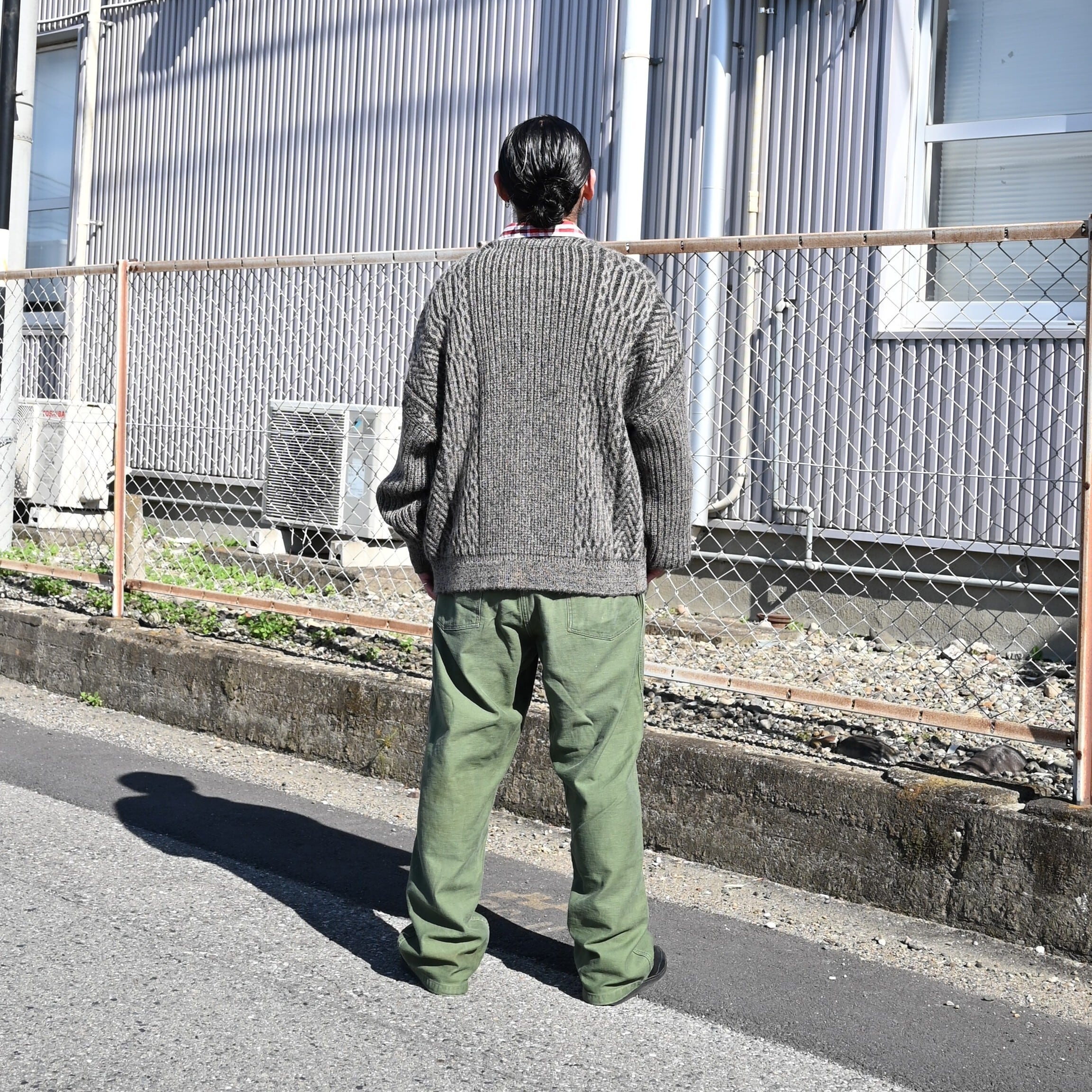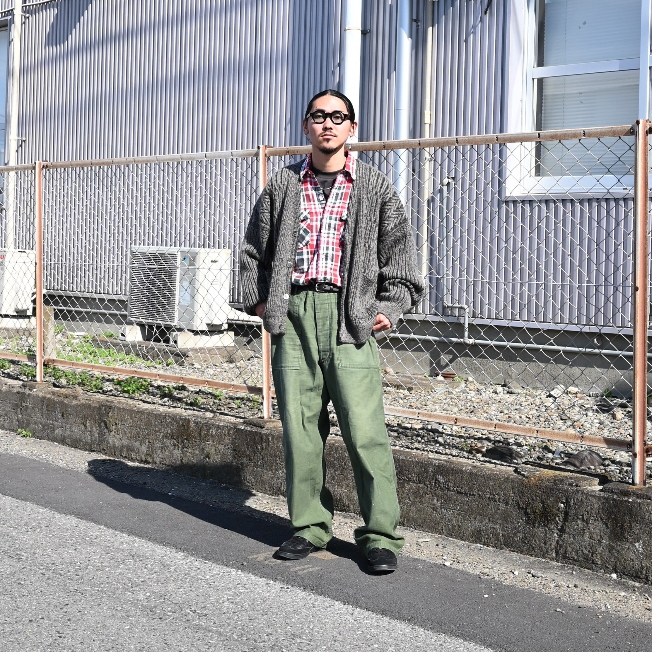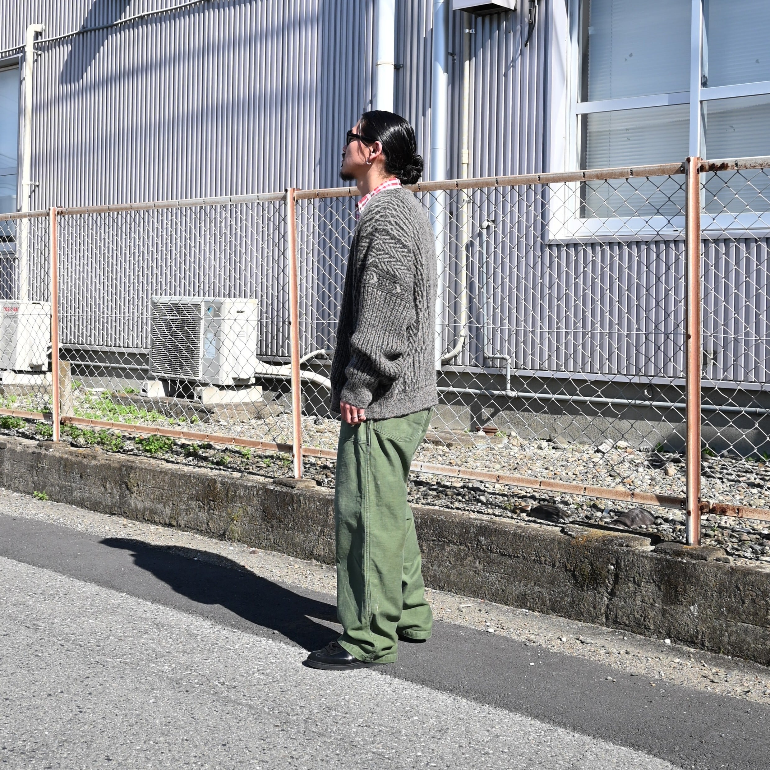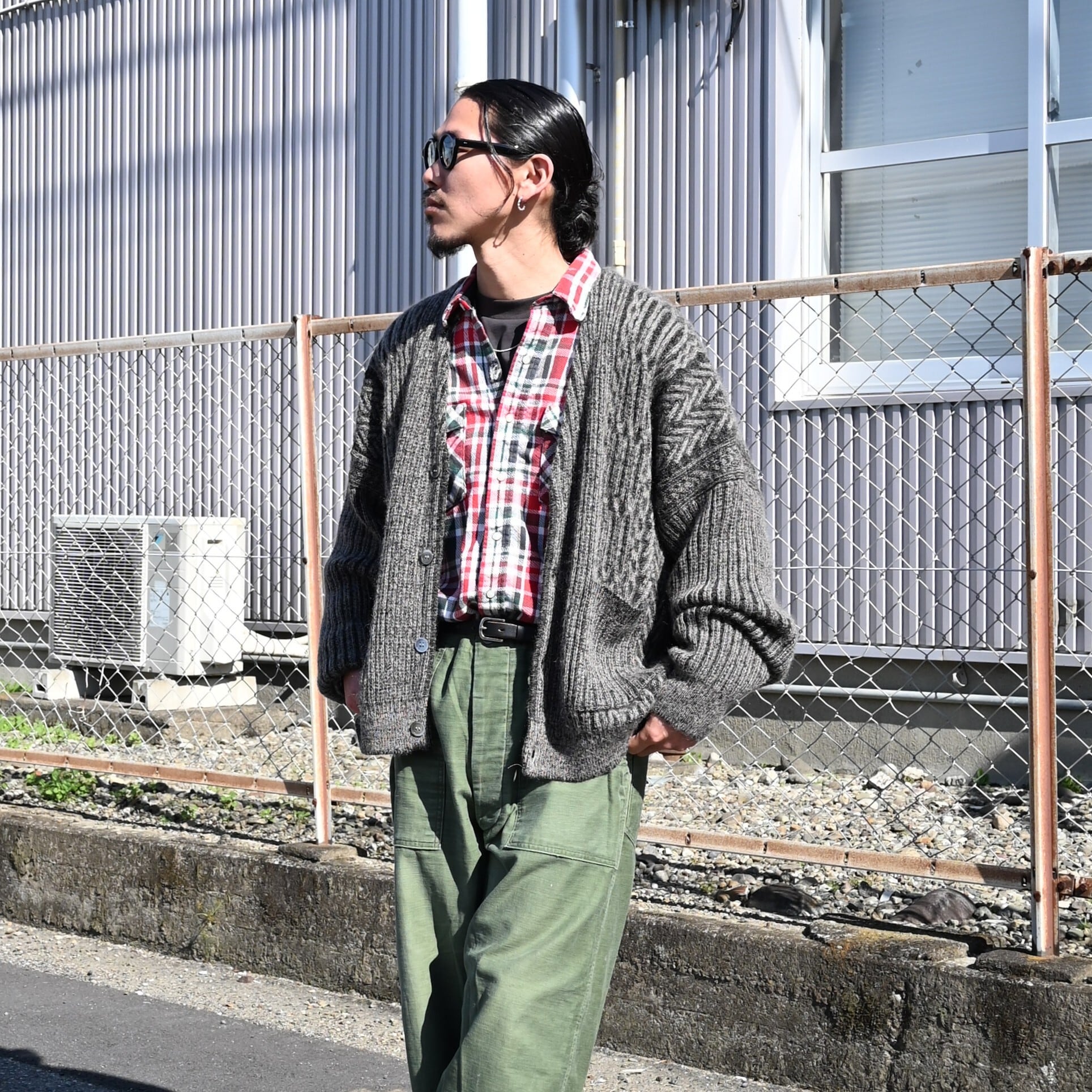 I styled the YASHIKI “Sekkei Mohair Cardigan” as the main piece, pairing it with a saddlekingwestern Cotton Flannel Shirt as the inner layer, along with 60s U.S. ARMY Vintage L OG107 Baker Pants with side adjusters.