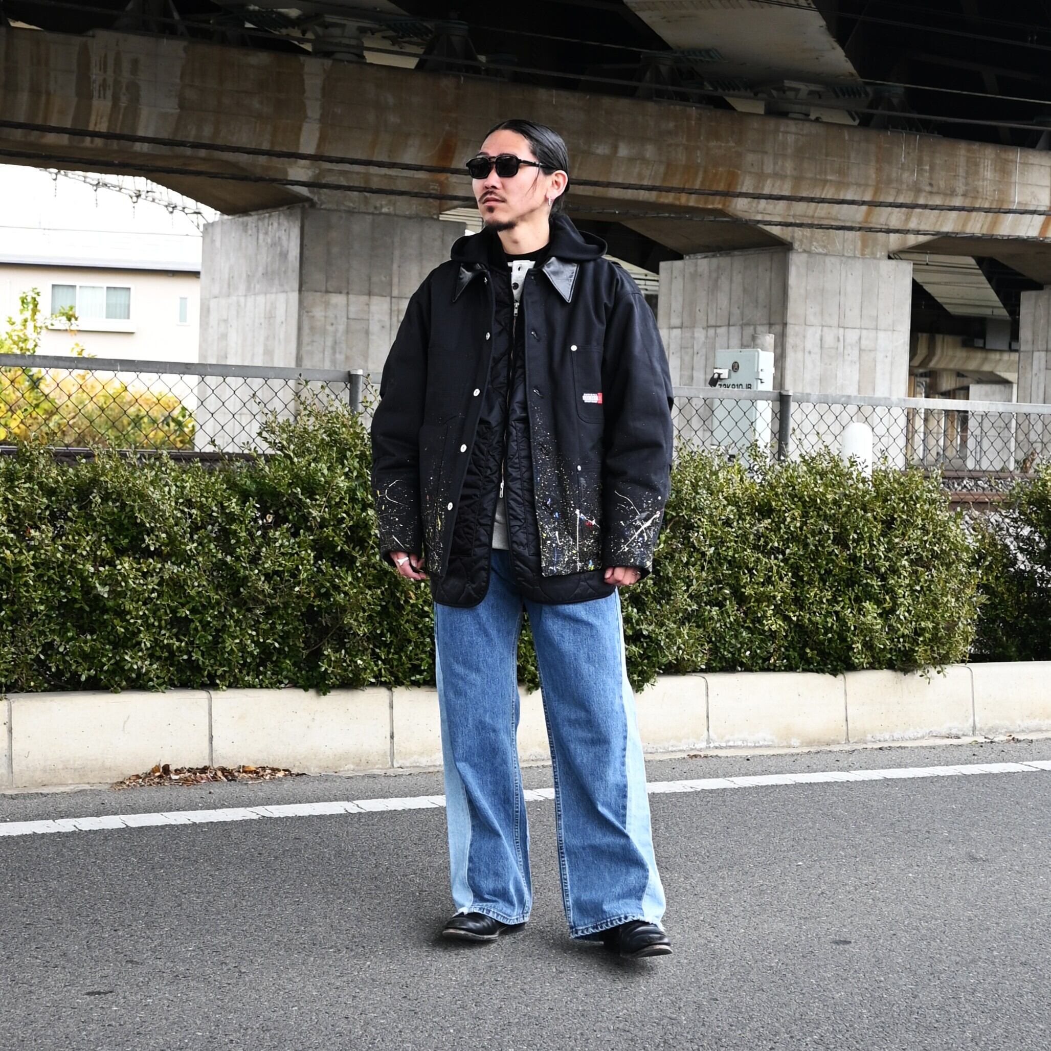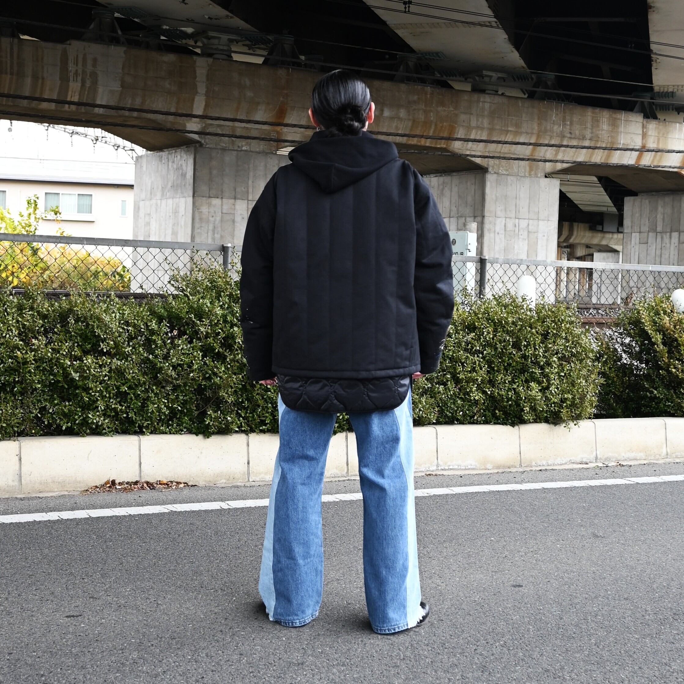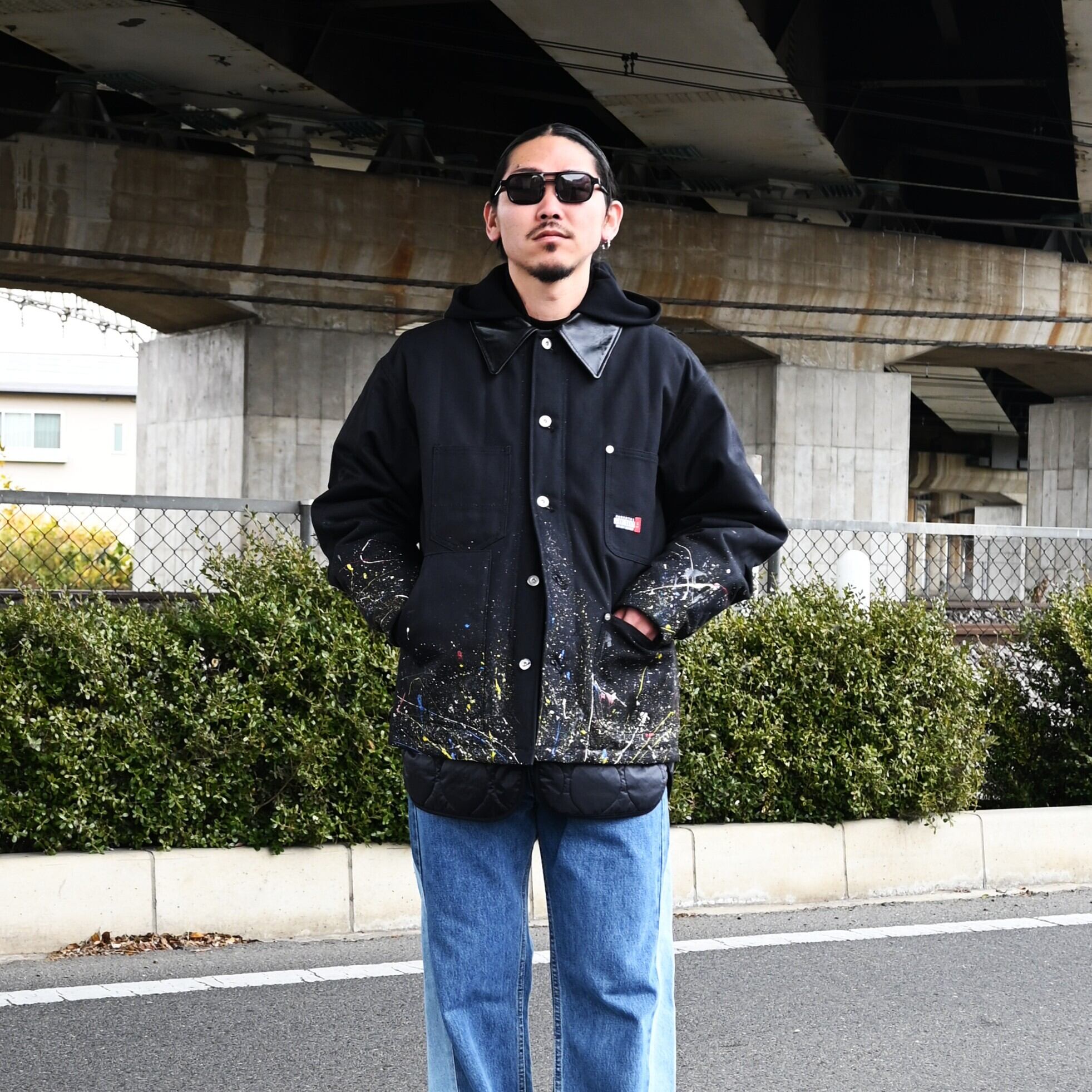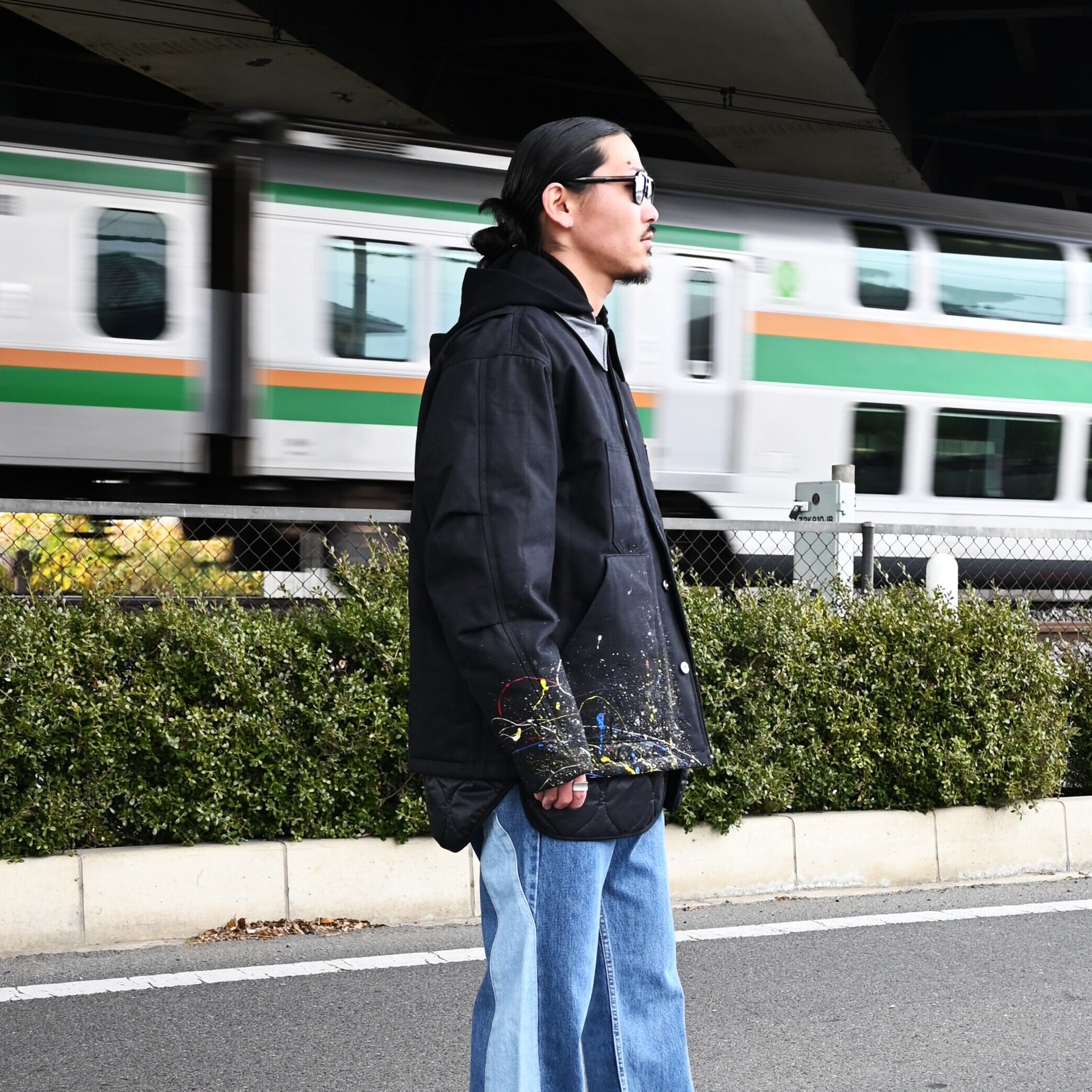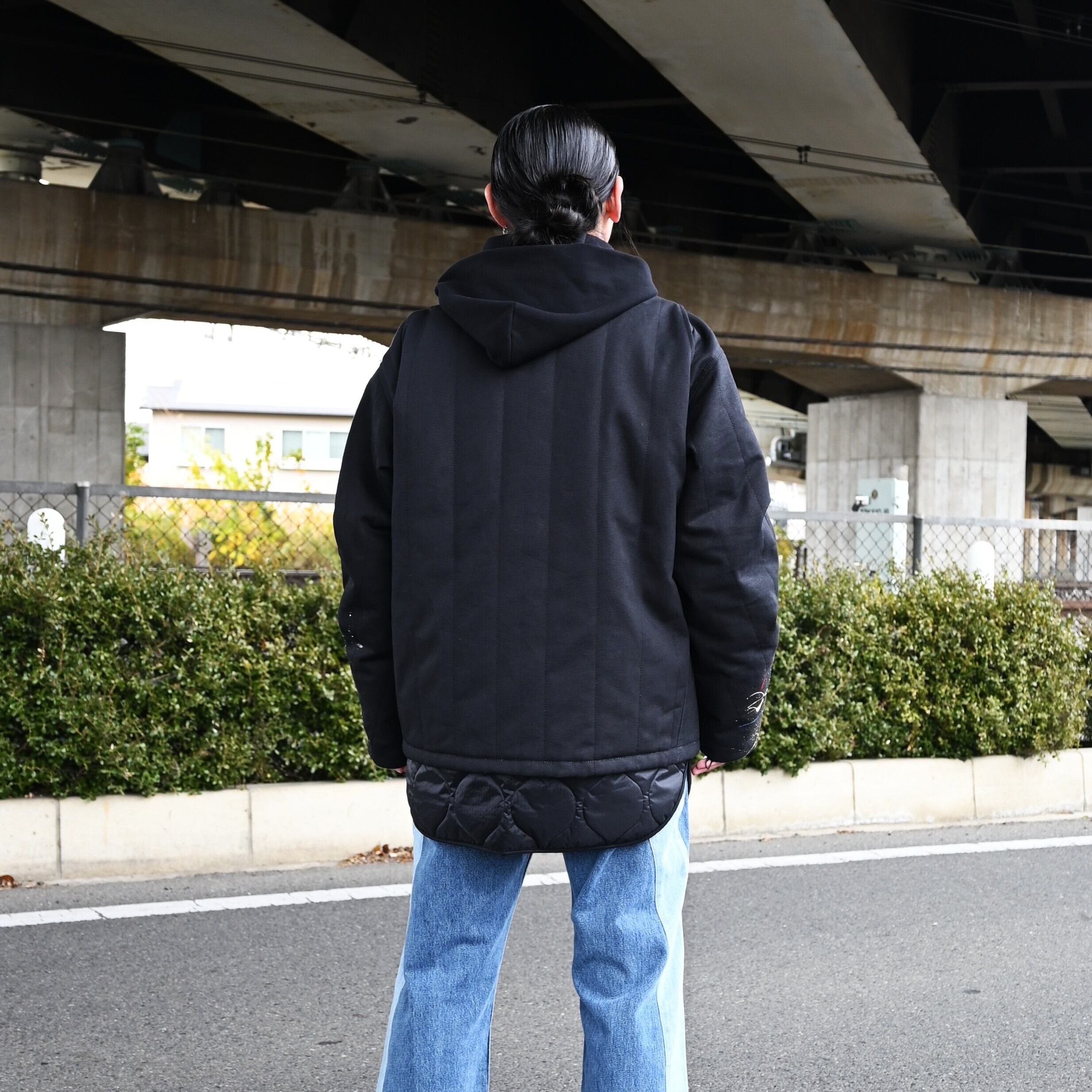 "Introducing the 'Quilting Docking Coverall Blouson,' a one-of-a-kind piece due to the paint processing from LEH.