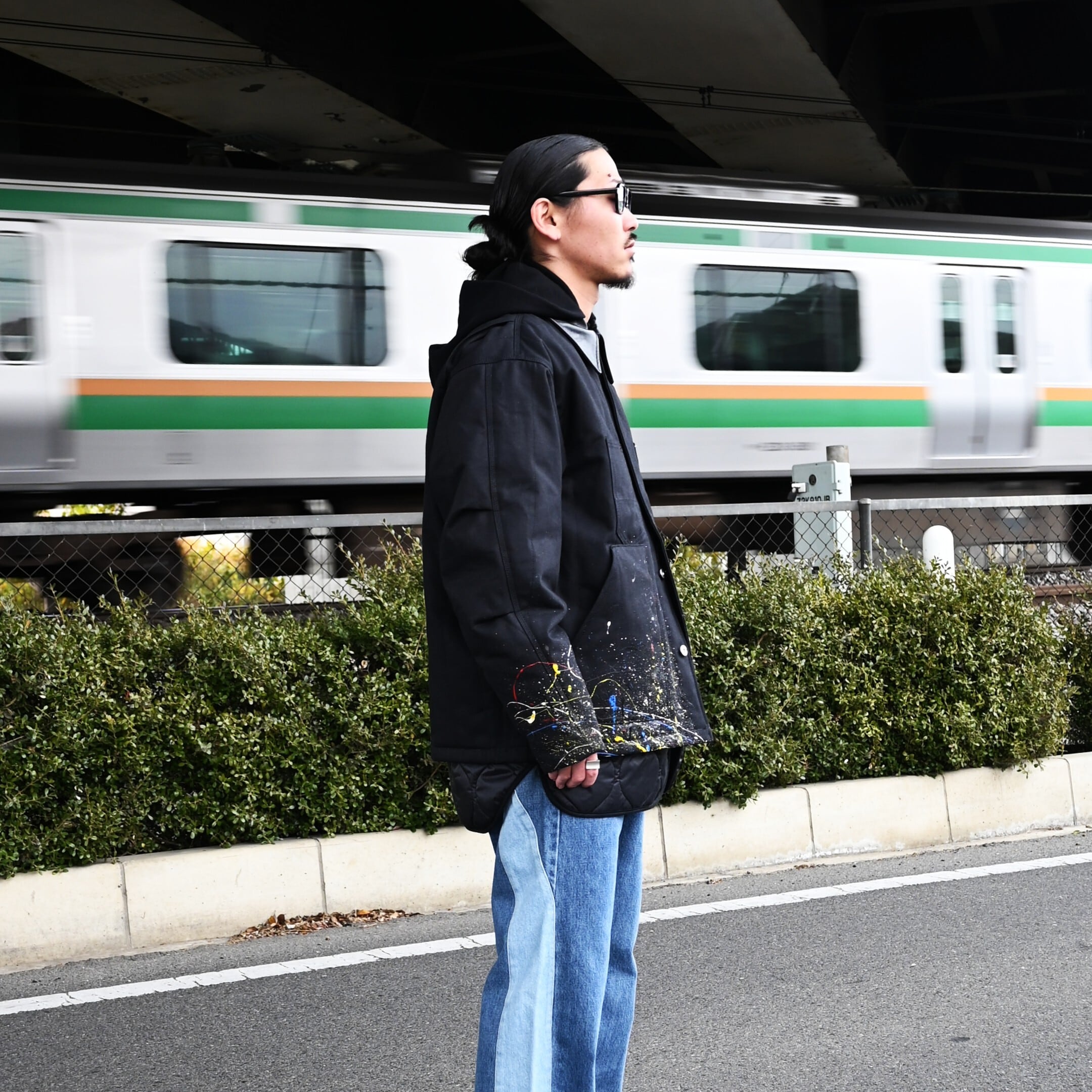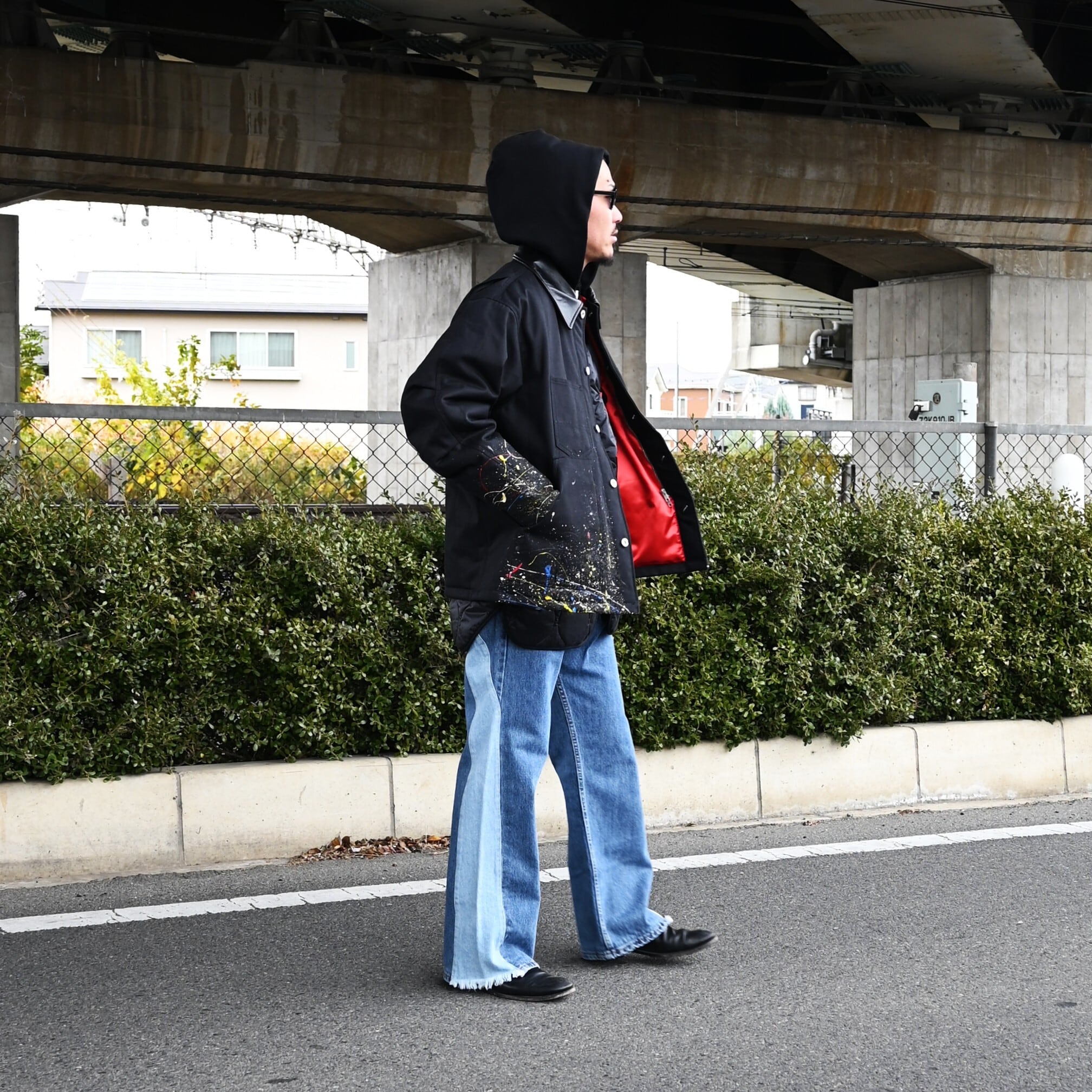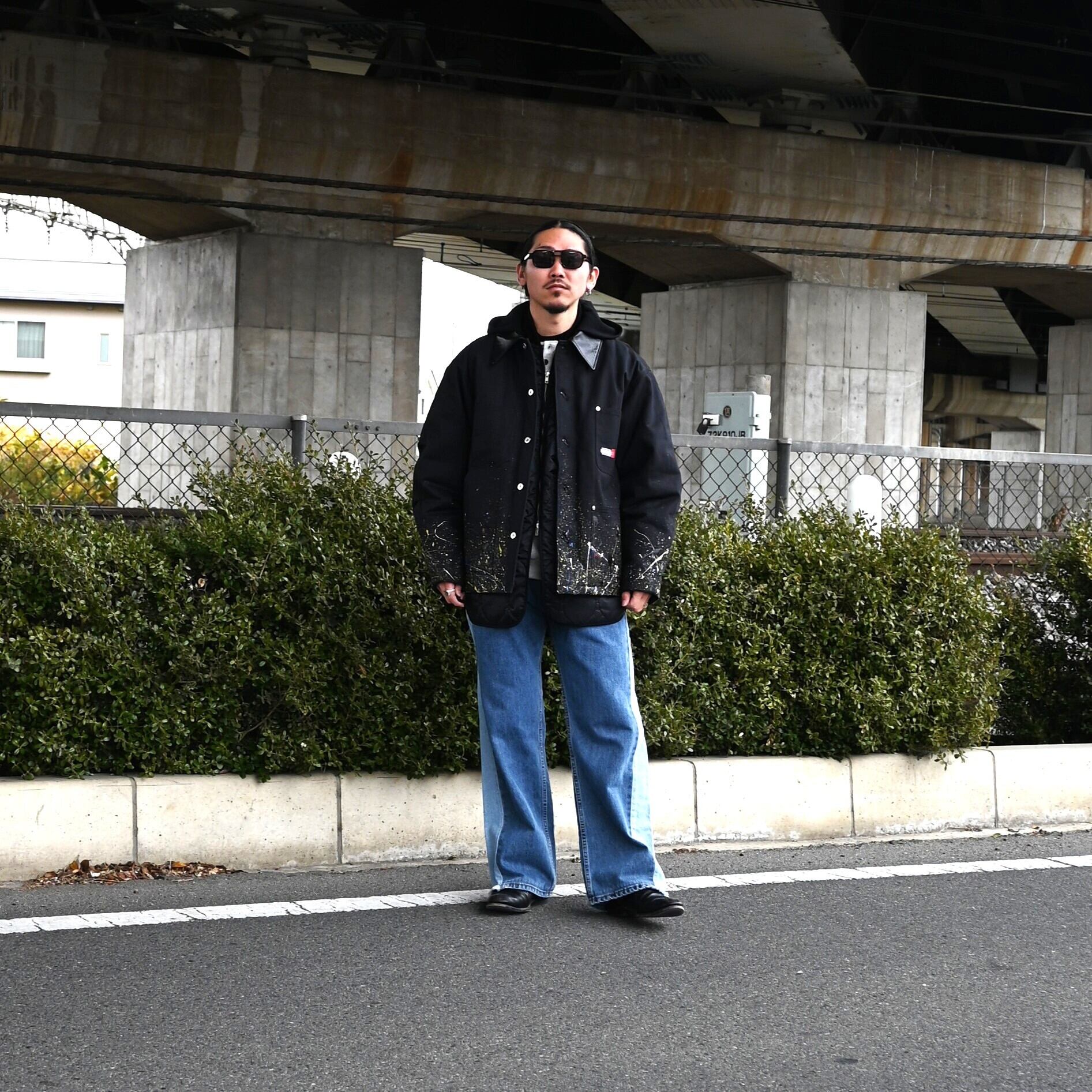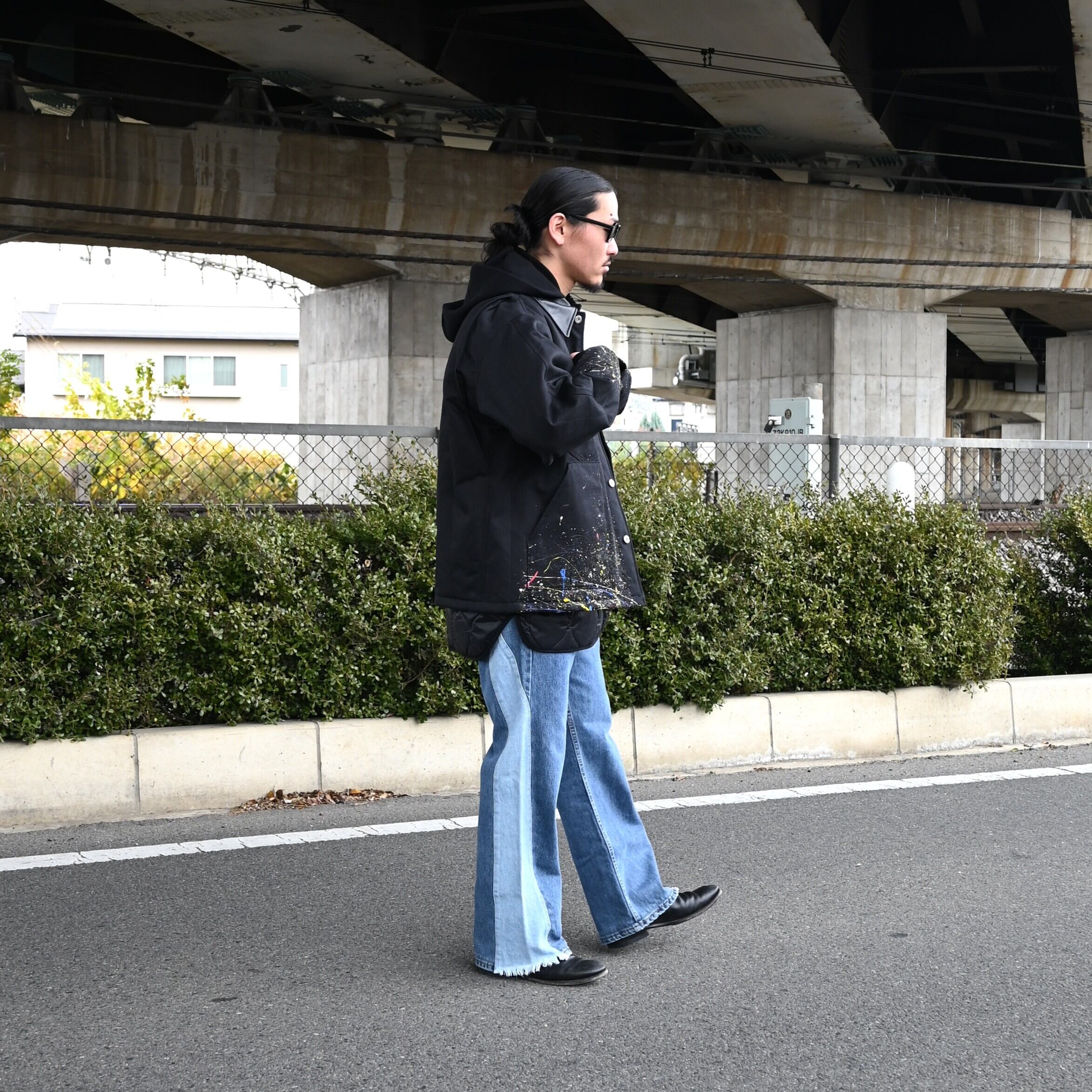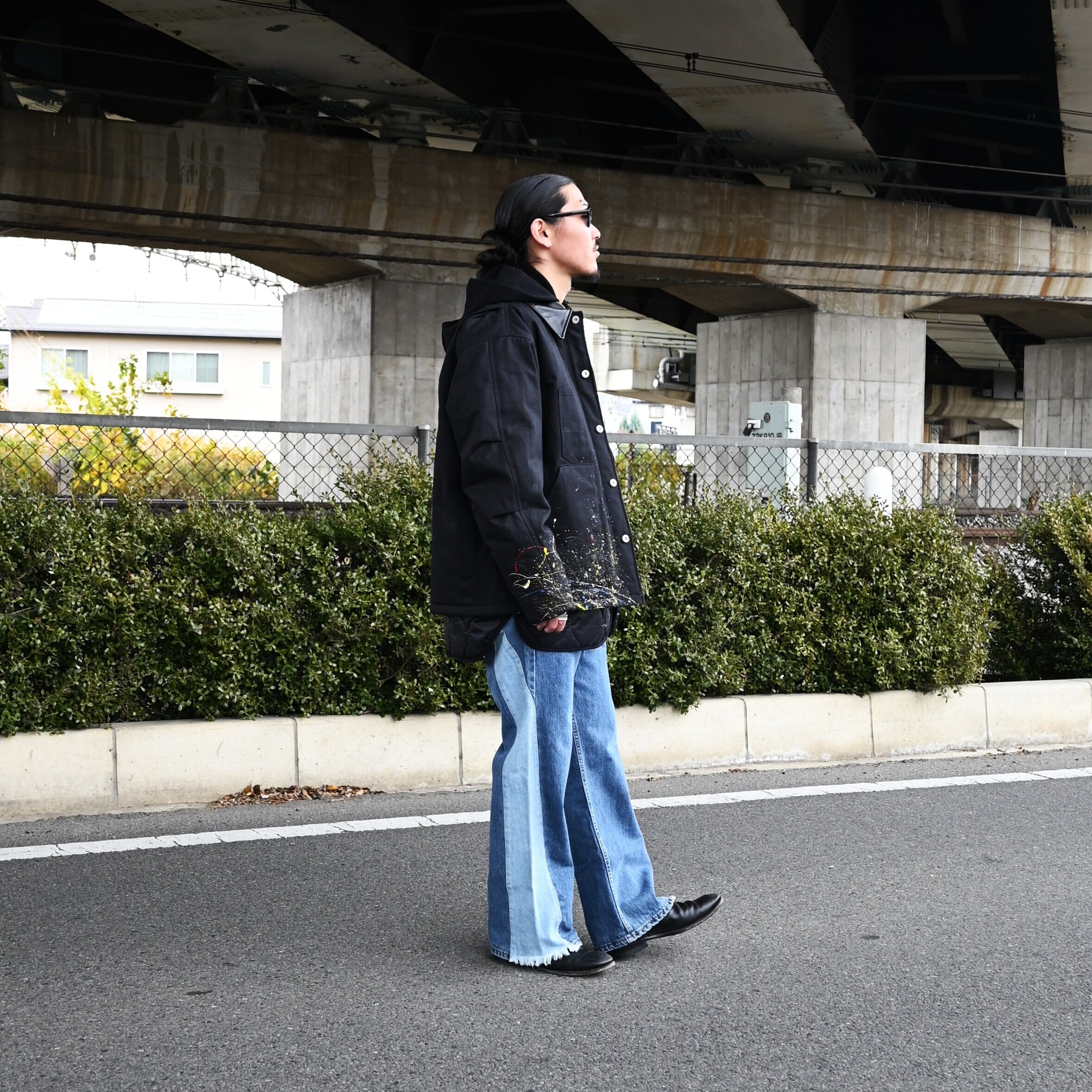 "Introducing the 'Quilting Docking Coverall Blouson,' a one-of-a-kind piece due to the paint processing from LEH.