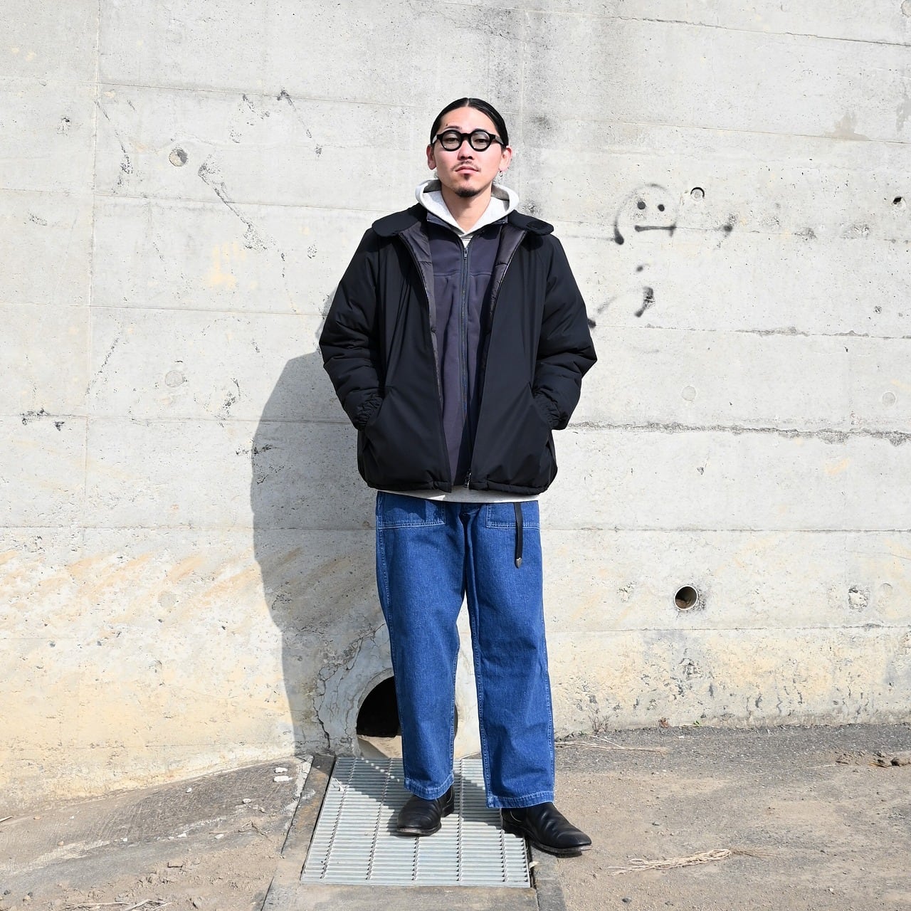 INTERIM(インテリム)のDERMIZAX HI-LOFT WATER PROOF HYPER BIG INSULATED JACKETをメインにコーディネート。本発の機能素材「ダーミザクス」、中綿に⽶スリーエム社の「シンサレート」を使⽤した中綿ジャケットは保温力も申し分なく、水沢ダウンにも使用されているダーミザクスの生地を使用。今回はインナーにTHEDAYのフリースベストを合わせ、パーカー、パンツはインテリムのアイテムでまとめました。