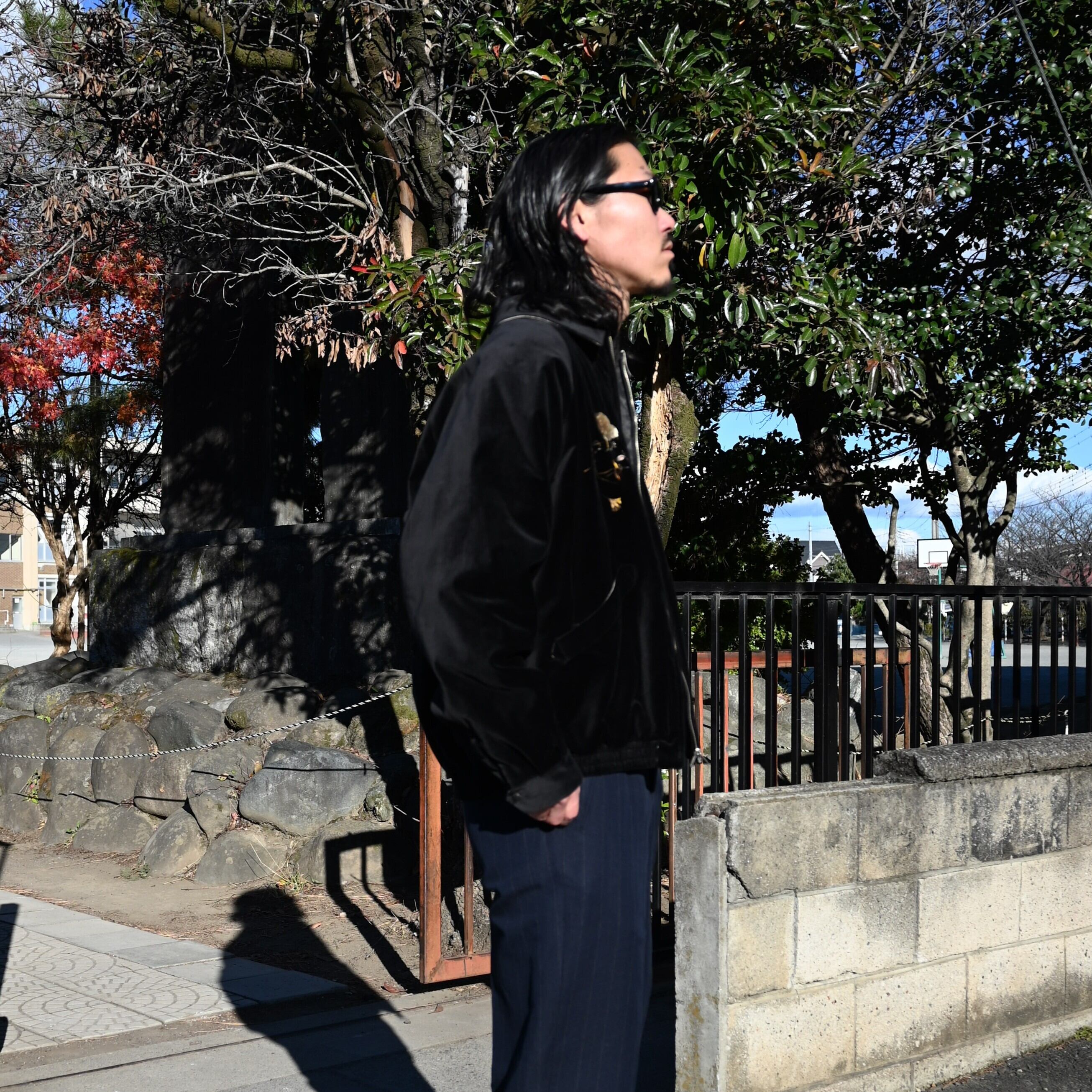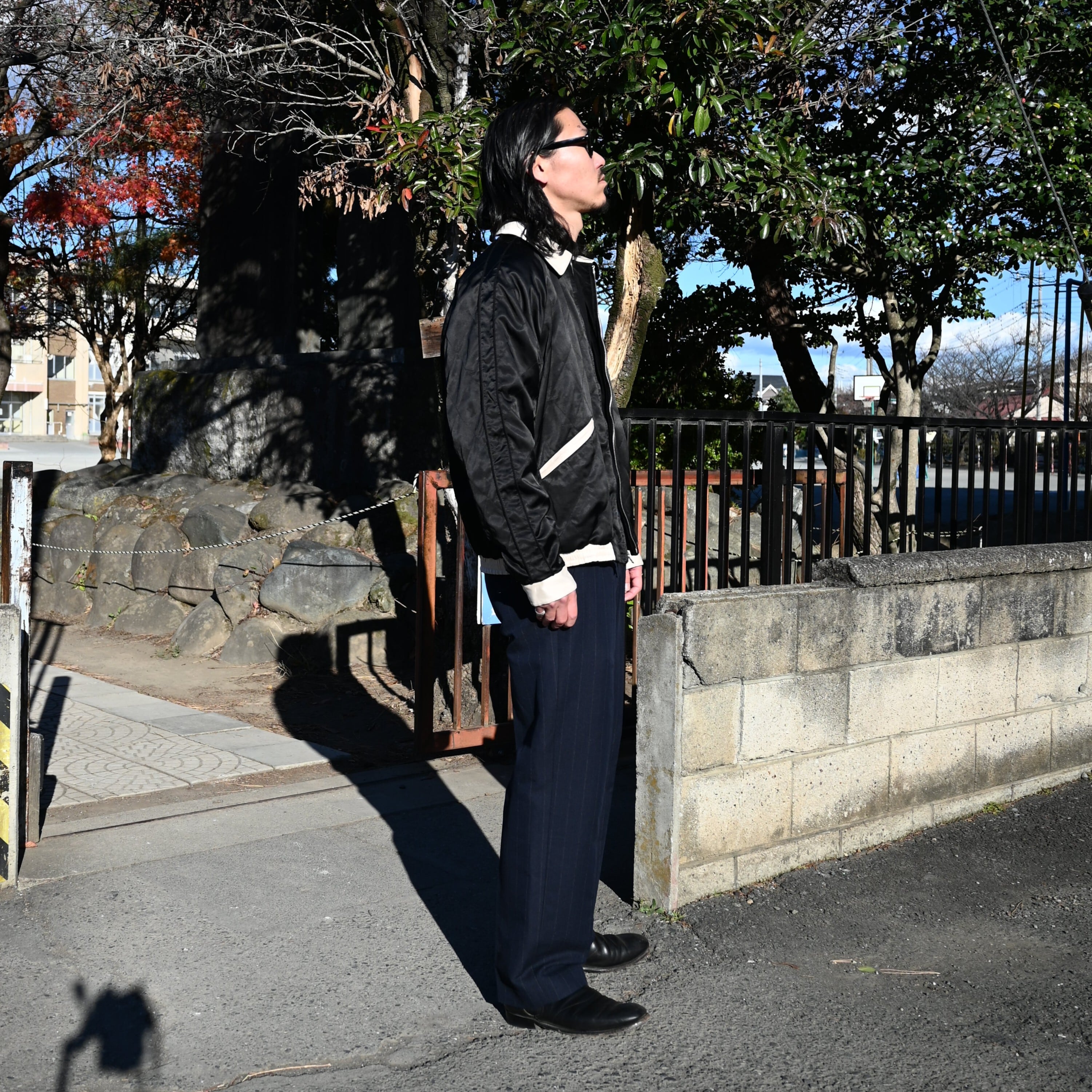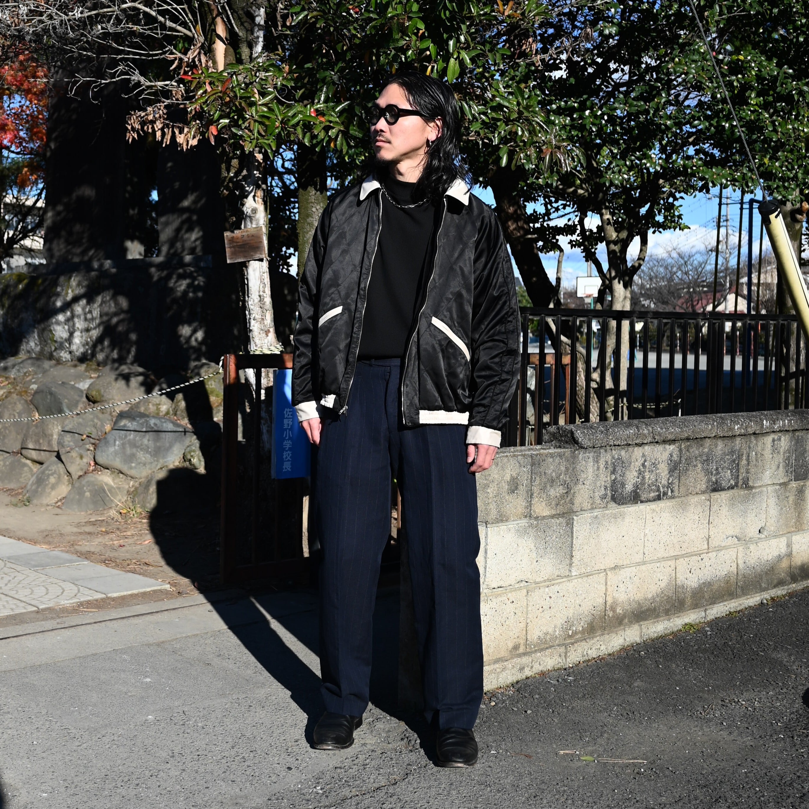 A coordination centered around OLD JOE’s STUNNING VELVET SOUVENIR JACKET (Niwatori to Hiyoko). This jacket is reversible and can be worn on either side. For this look, I paired it with a mock-neck thermal cut-and-sew from TANGENT as the inner layer, along with OLD JOE’s DOUBLE-PLEATED SMARTY TROUSER and “The Gardner” ARTISAN LEATHER SIDE-GORE SHOES.