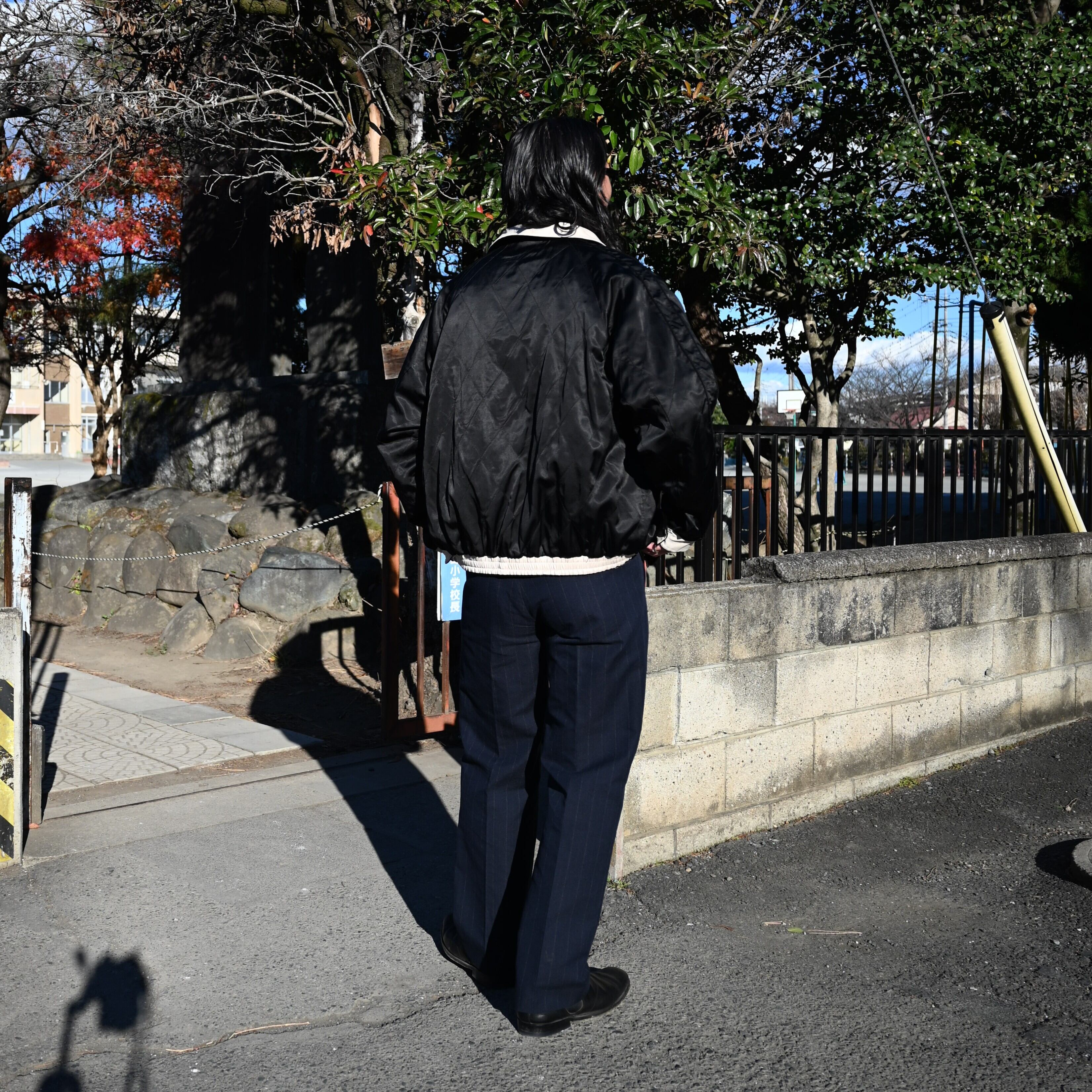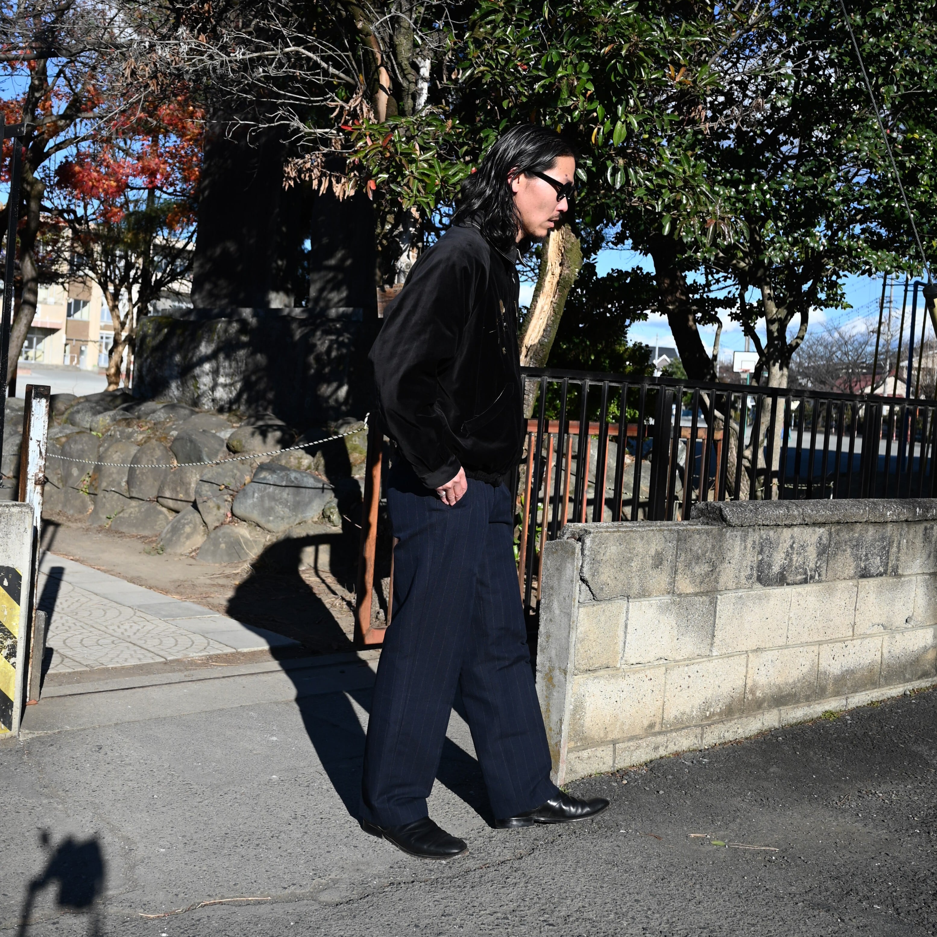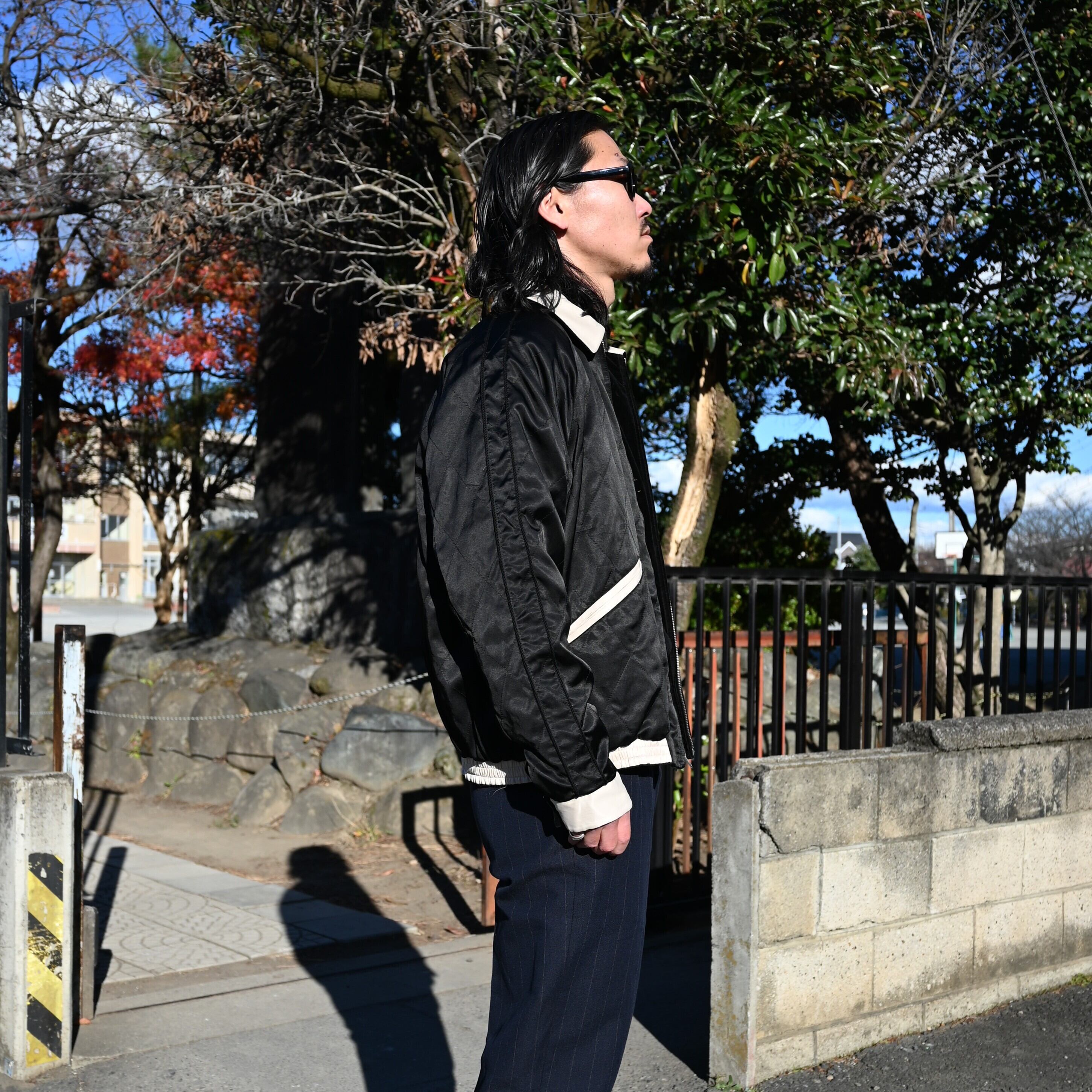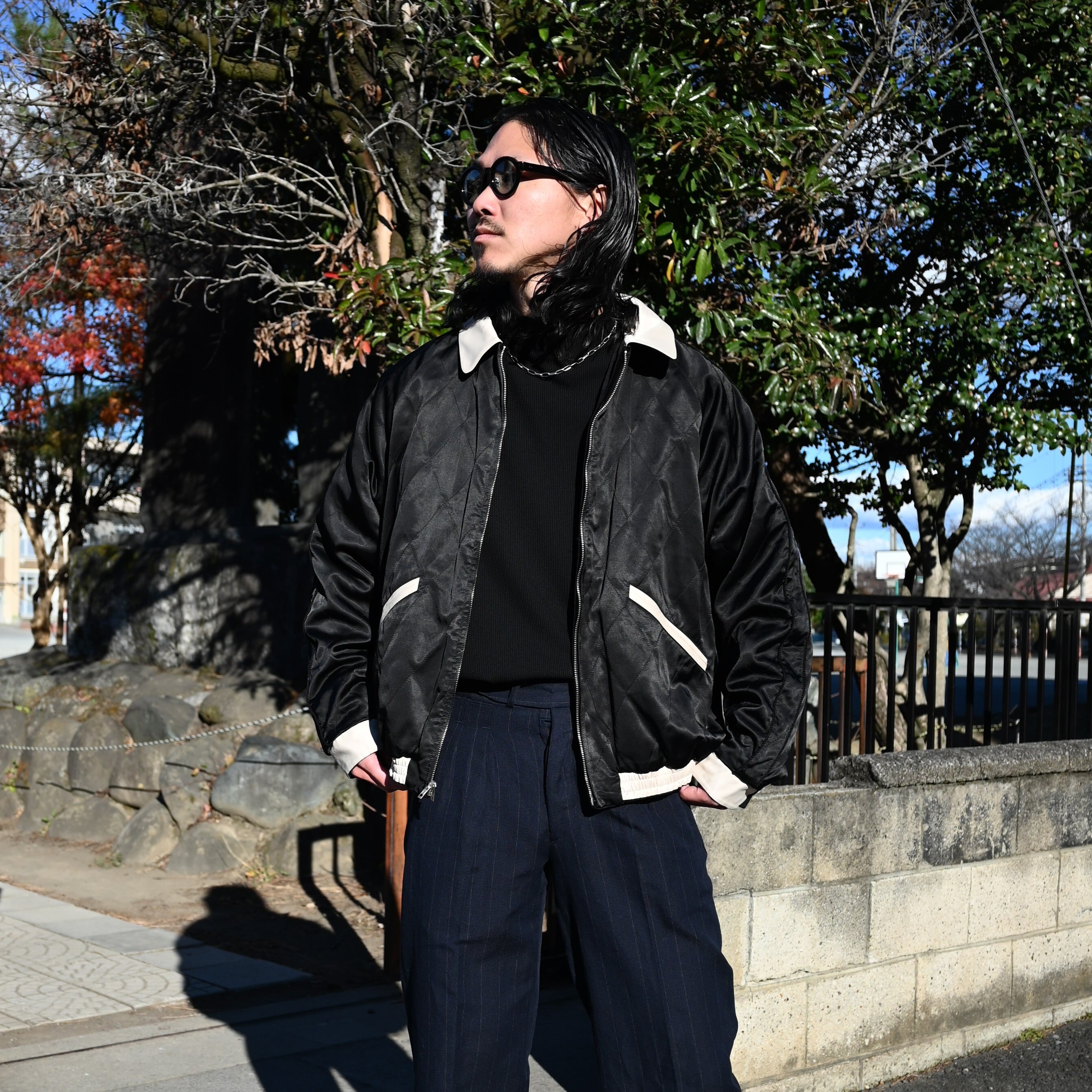 A coordination centered around OLD JOE’s STUNNING VELVET SOUVENIR JACKET (Niwatori to Hiyoko). This jacket is reversible and can be worn on either side. For this look, I paired it with a mock-neck thermal cut-and-sew from TANGENT as the inner layer, along with OLD JOE’s DOUBLE-PLEATED SMARTY TROUSER and “The Gardner” ARTISAN LEATHER SIDE-GORE SHOES.