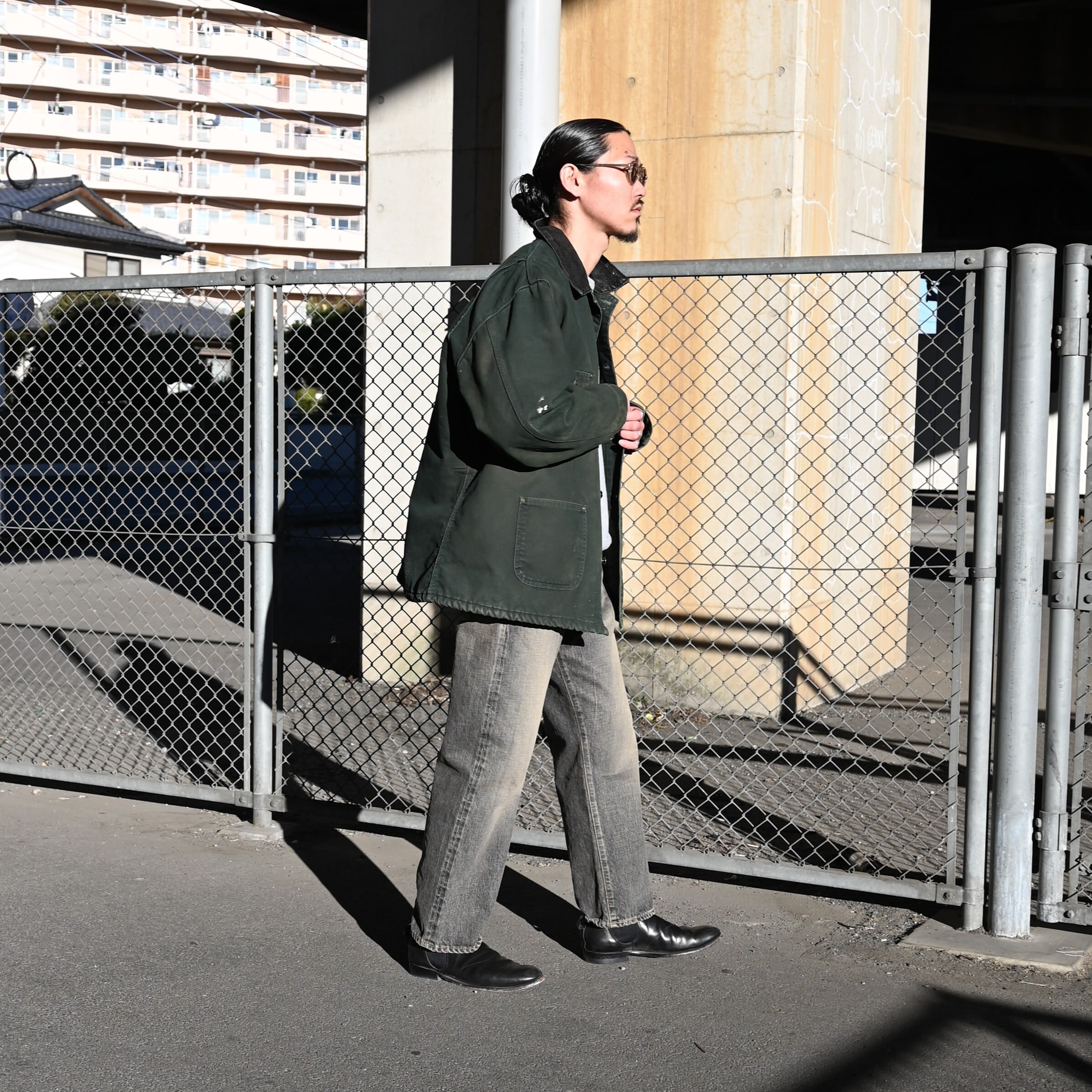 当店のKUON別注アイテム Sashiko Sweatshirtをメインにコーディネート。アウターにはヴィンテージカーハートのカバーオール、インテリムの加工デニムを合わせ、ヴィンテージライクなスタイルながら、KUON別注のスウェットがカジュアル感を抑えてくれバランスの良いコーディネートに。