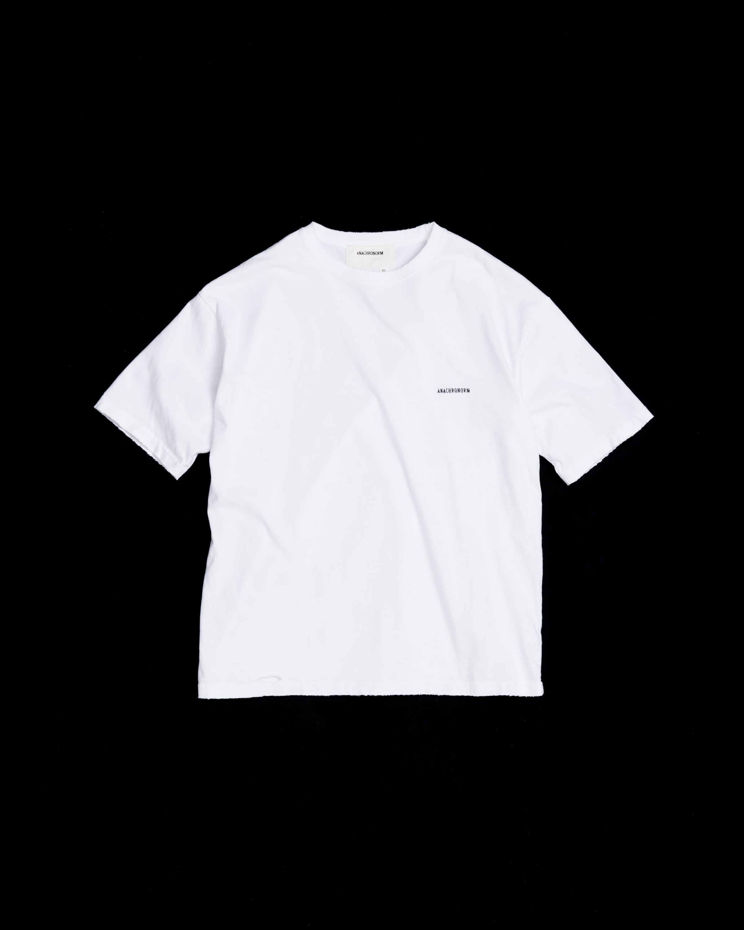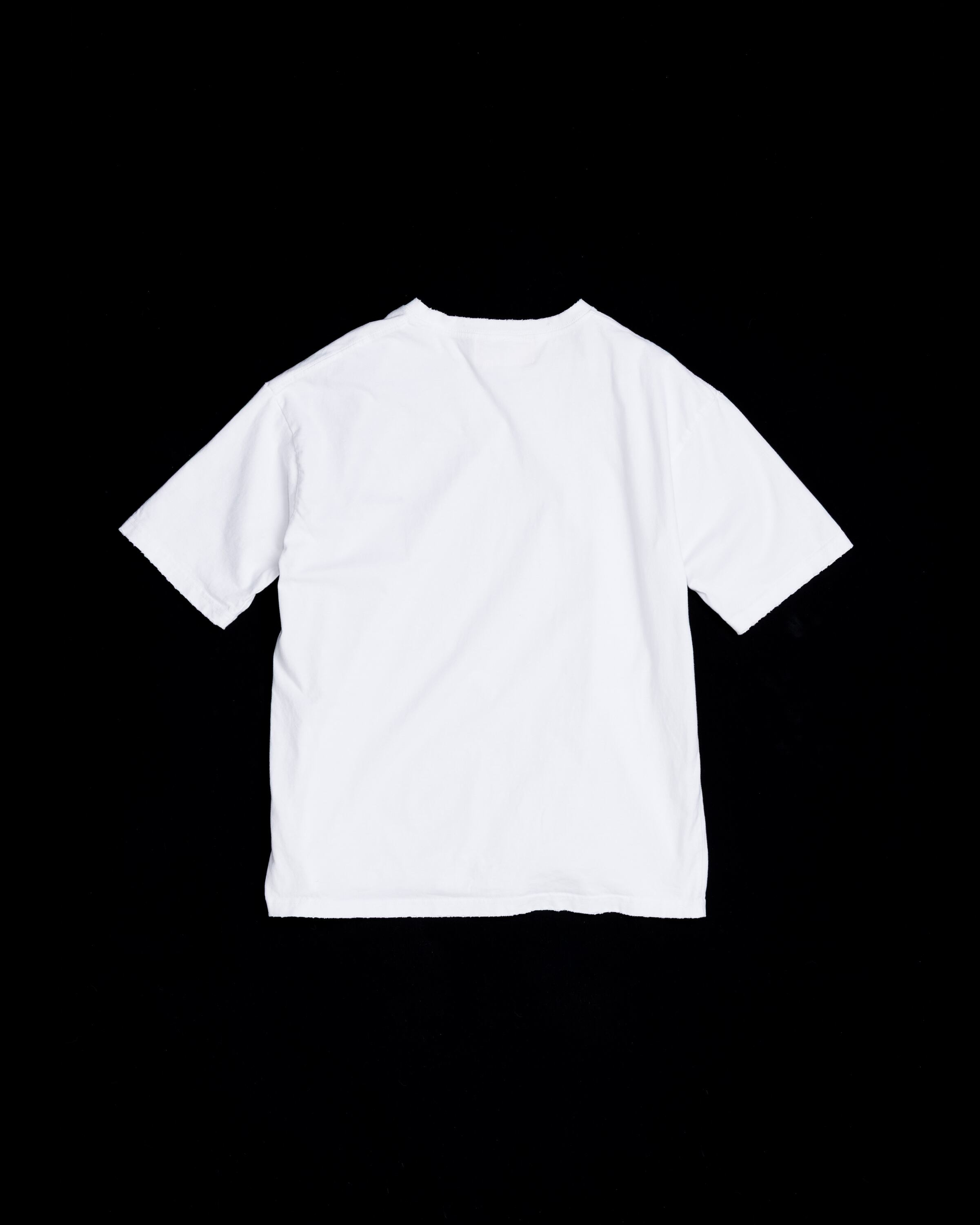 • A minimalist T-shirt featuring a one-point embroidered logo, further enhanced with hand-applied processing.