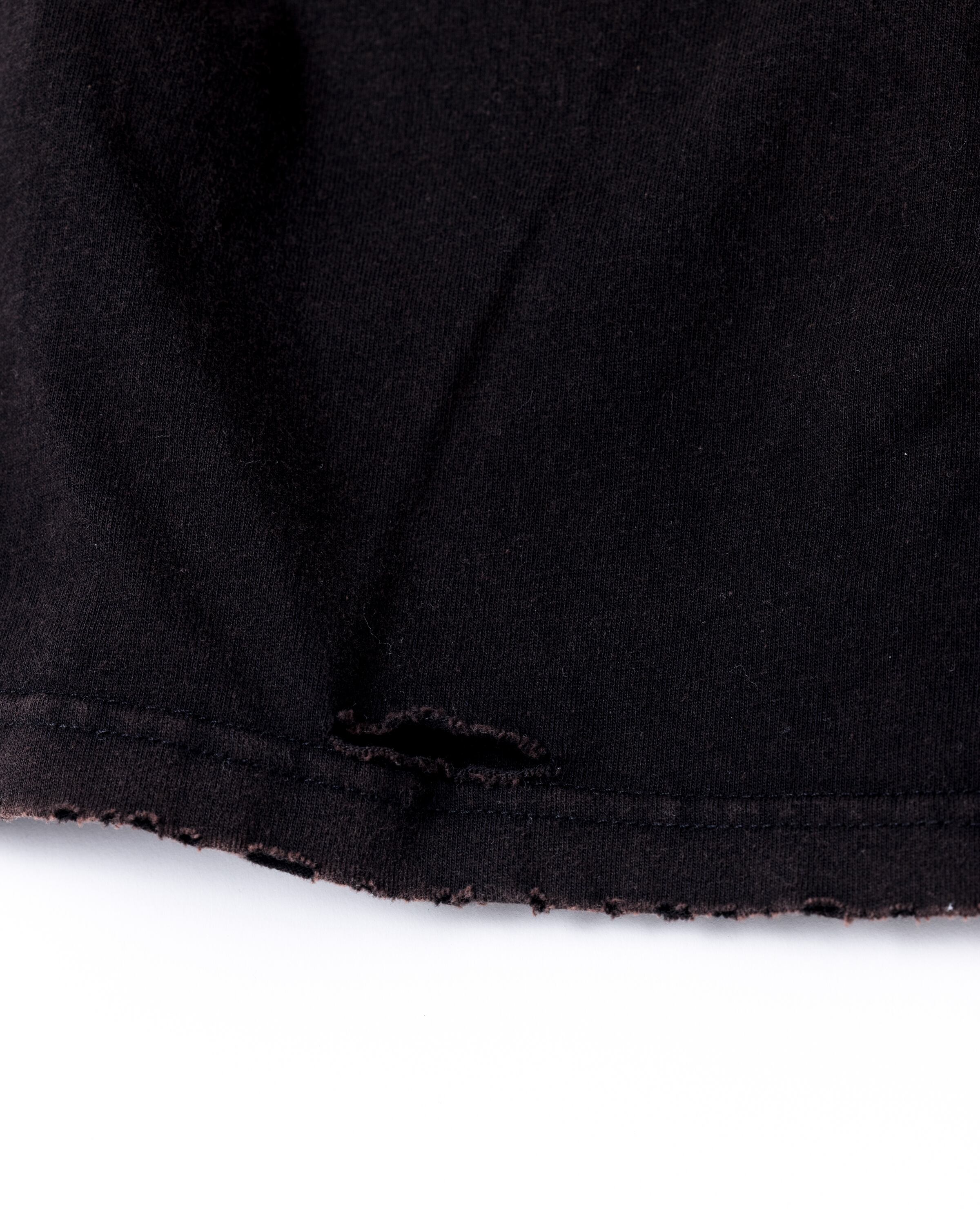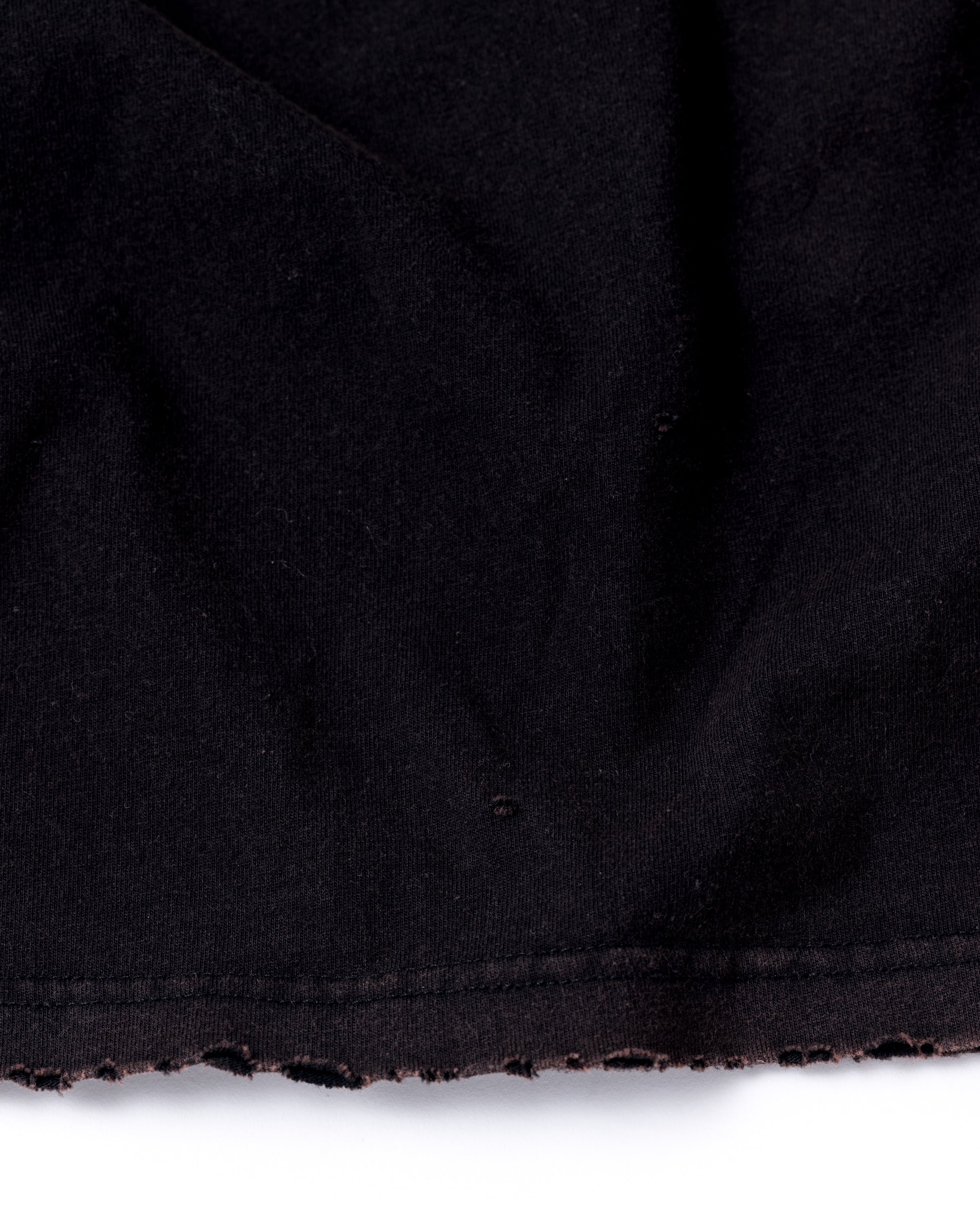 A logo T-shirt treated with sulfur dyeing, sustainable bleach, and damage processing.