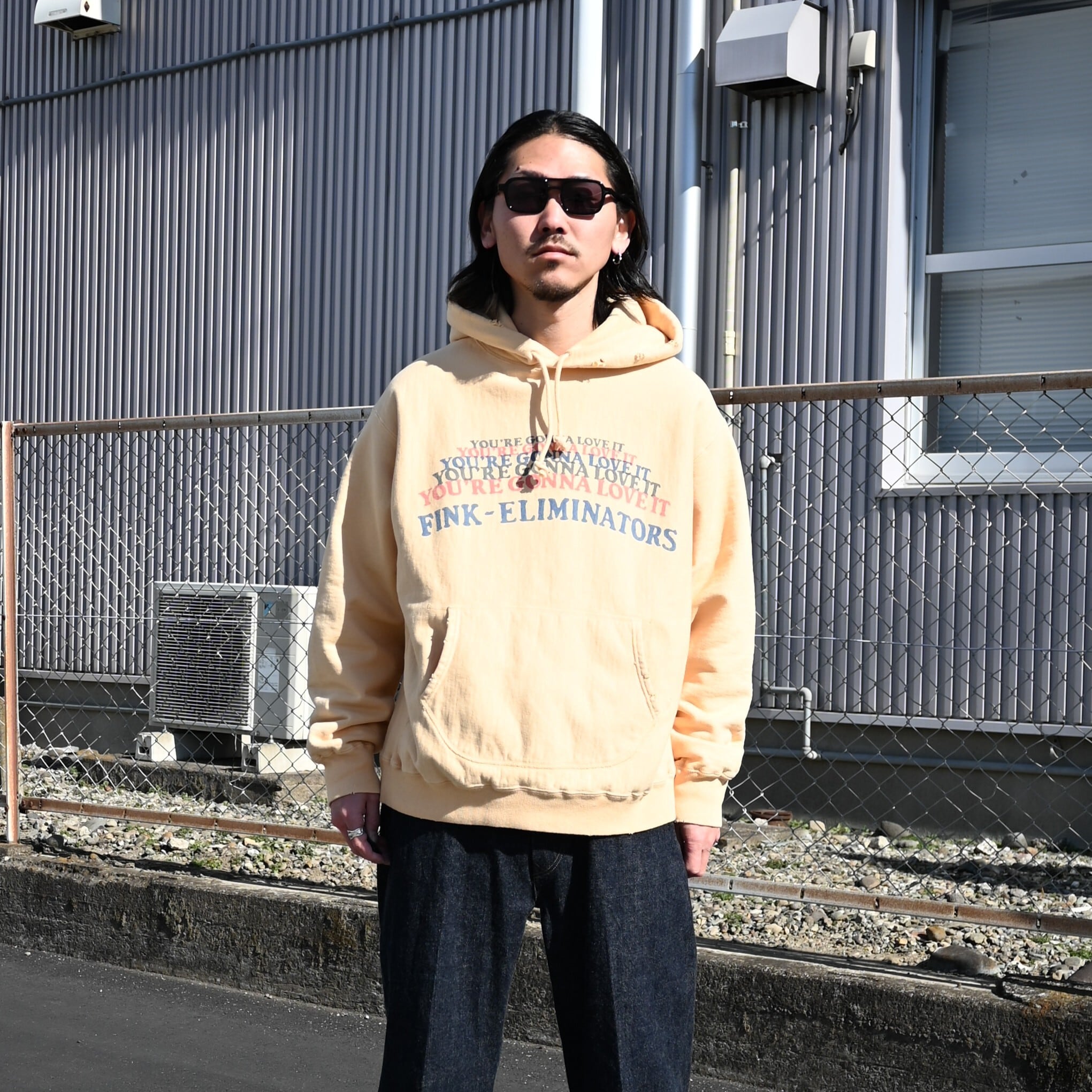 FINK-ELIMINATORSグラフィックを配した、ダメージ加工フーディ