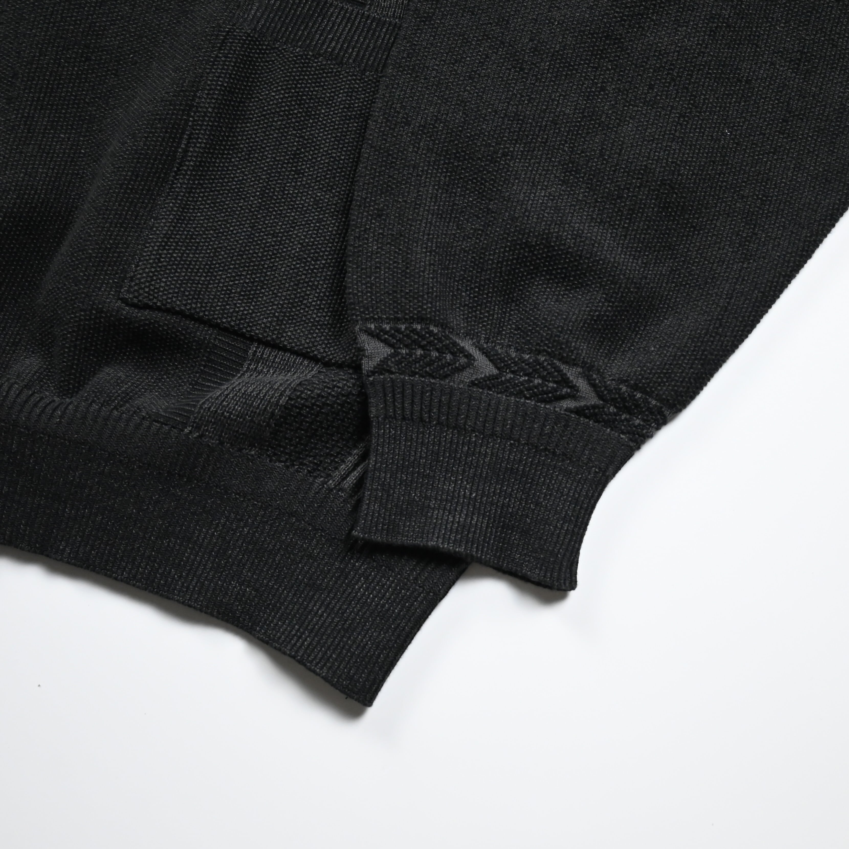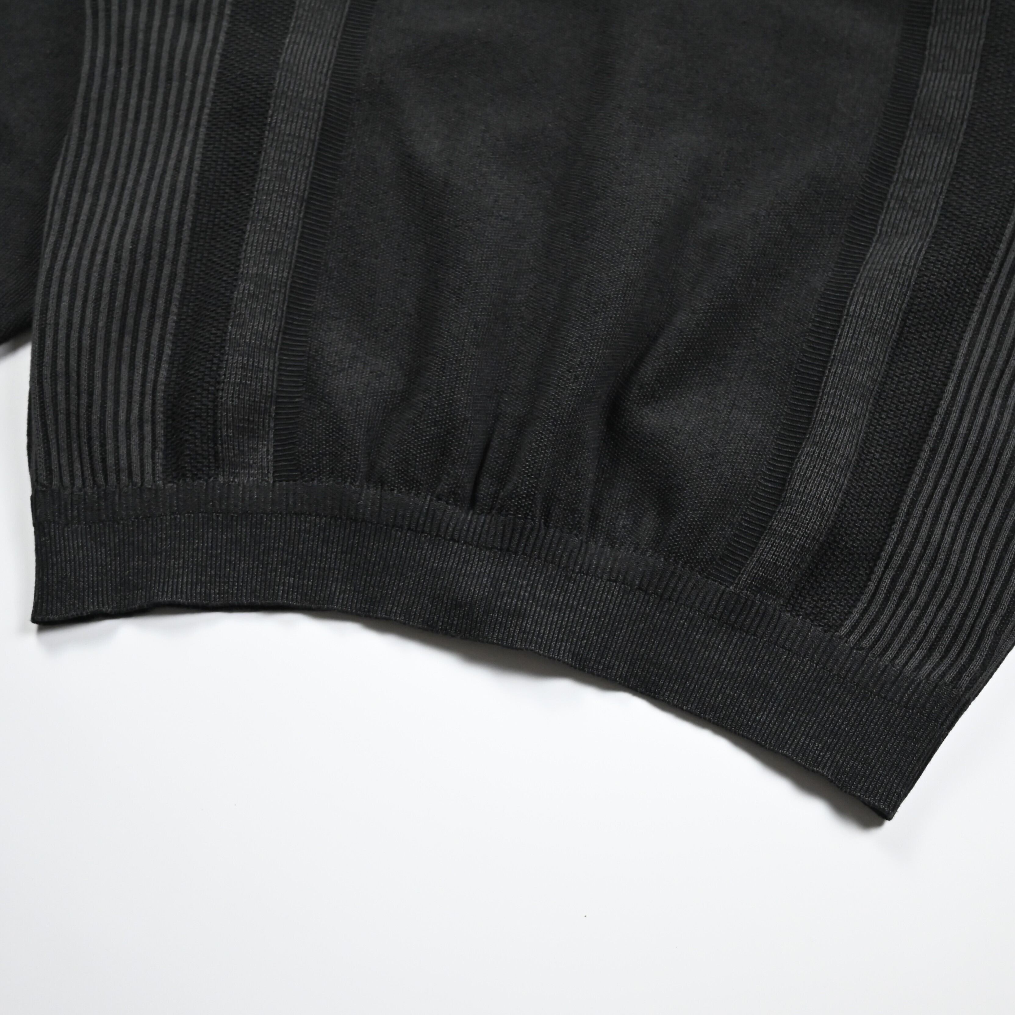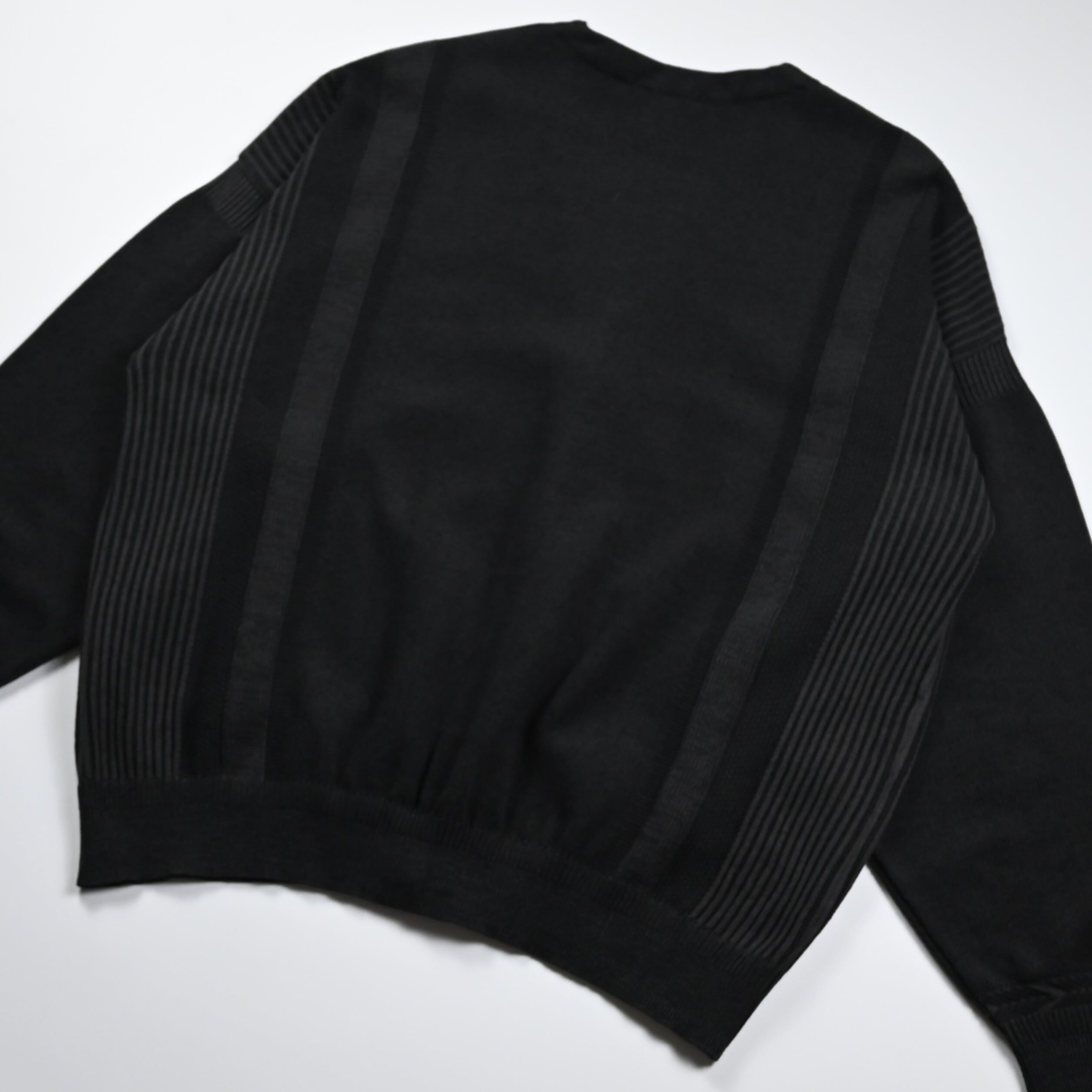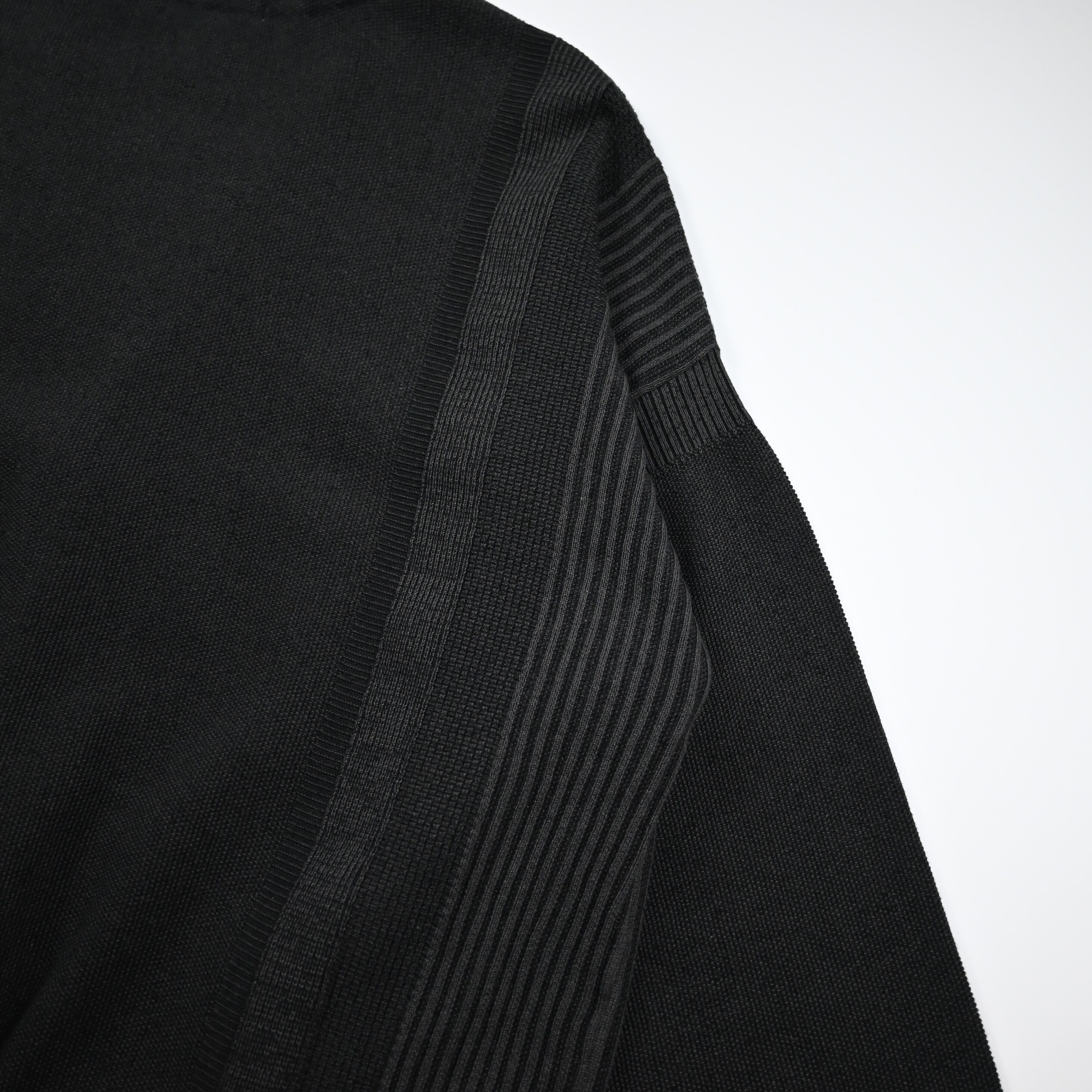 Uses a plating knit technique, knitting different yarns on the front and back; by changing the yarn colors on each side, the fabric achieves a deep, two-tone appearance