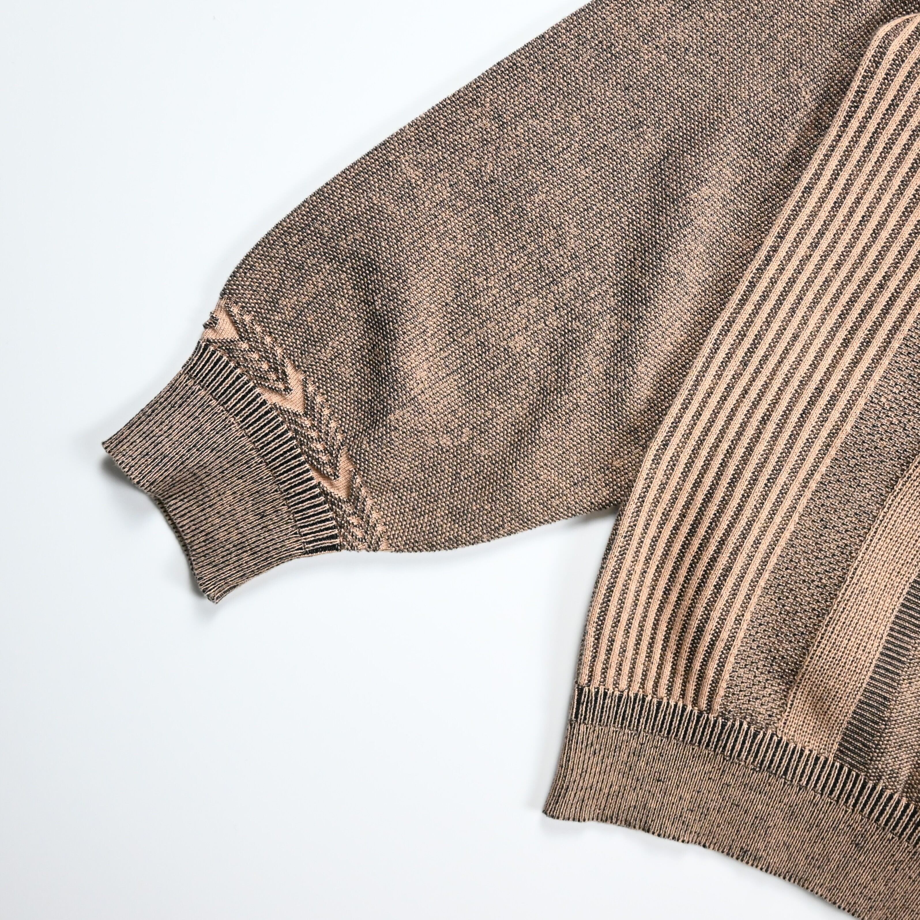 ・ブレーティング編みと言われる表側と裏側で異なる糸を編む技法を使用し、表と裏で糸の色を変えて、2色で編むことで奥行きのある表情に仕上げている