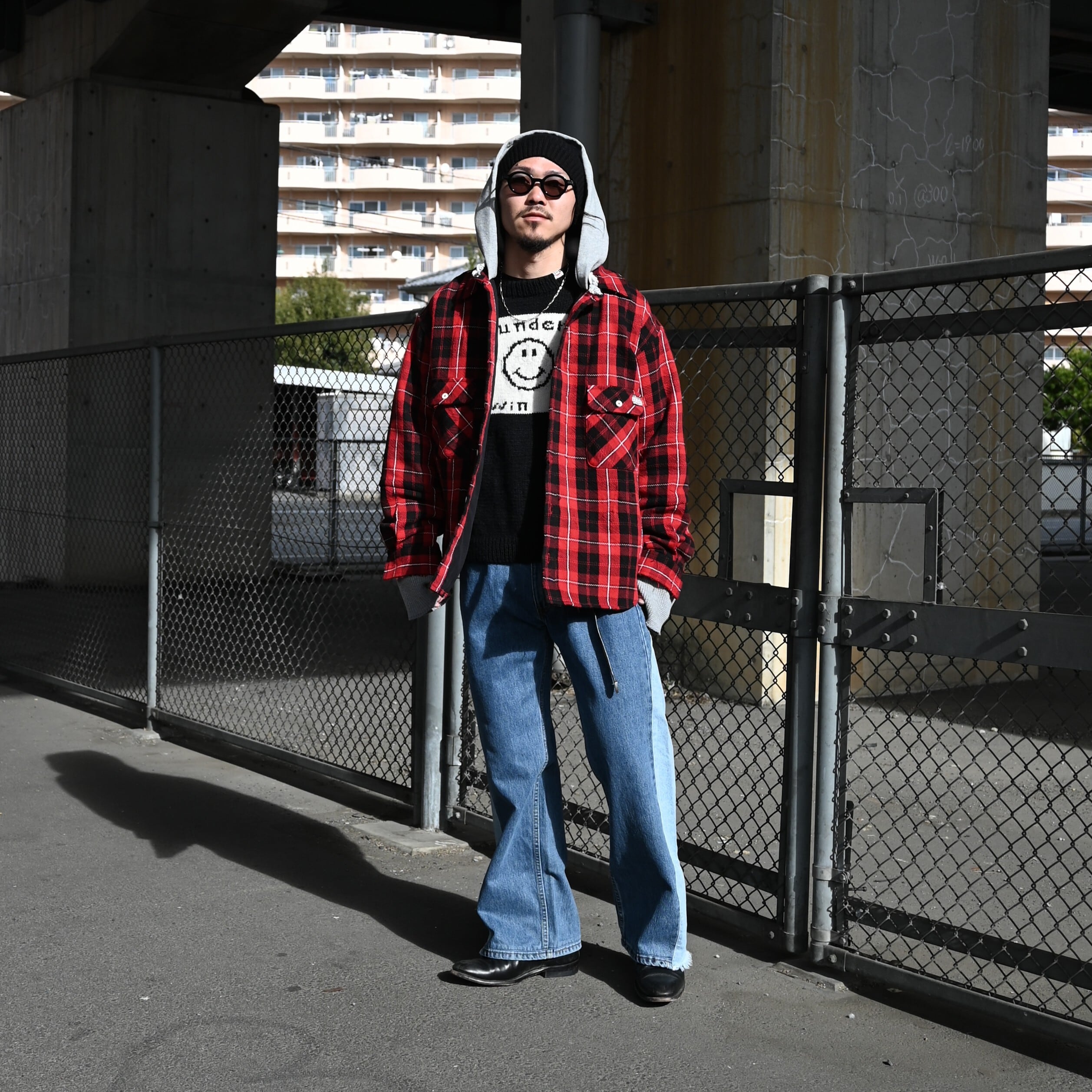 LEH(レー)のHoodie Layered Shirtsをメインにコーディネート。インナーにSmiley Knit Sweaterを合わせ、CHANGES(チェンジーズ)のWIDE DENIM PANTS IND(1)を着用いたしました。グランジ感、ストリートライクなコーディネートですが、足元に革靴を合わせることで大人な印象をプラス。