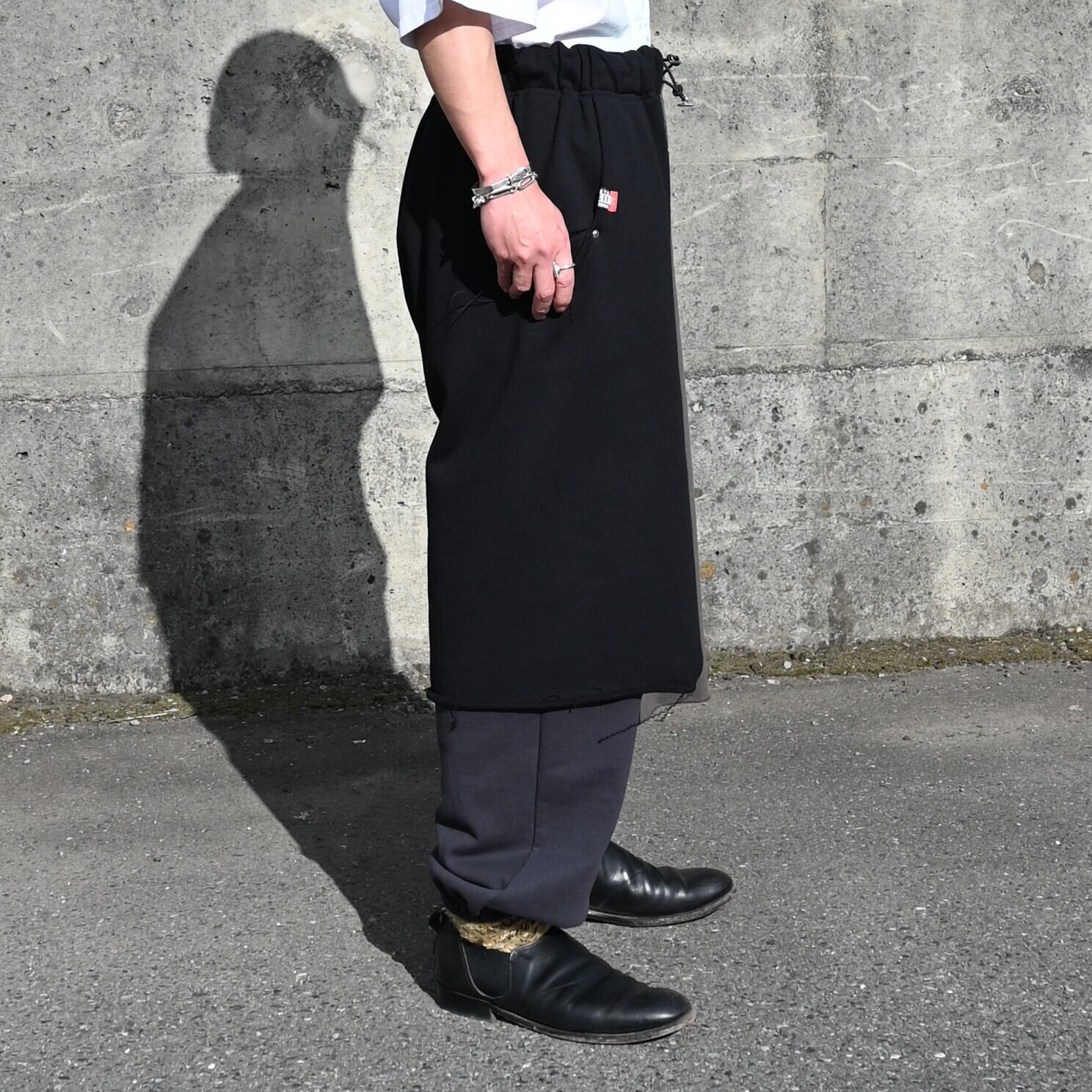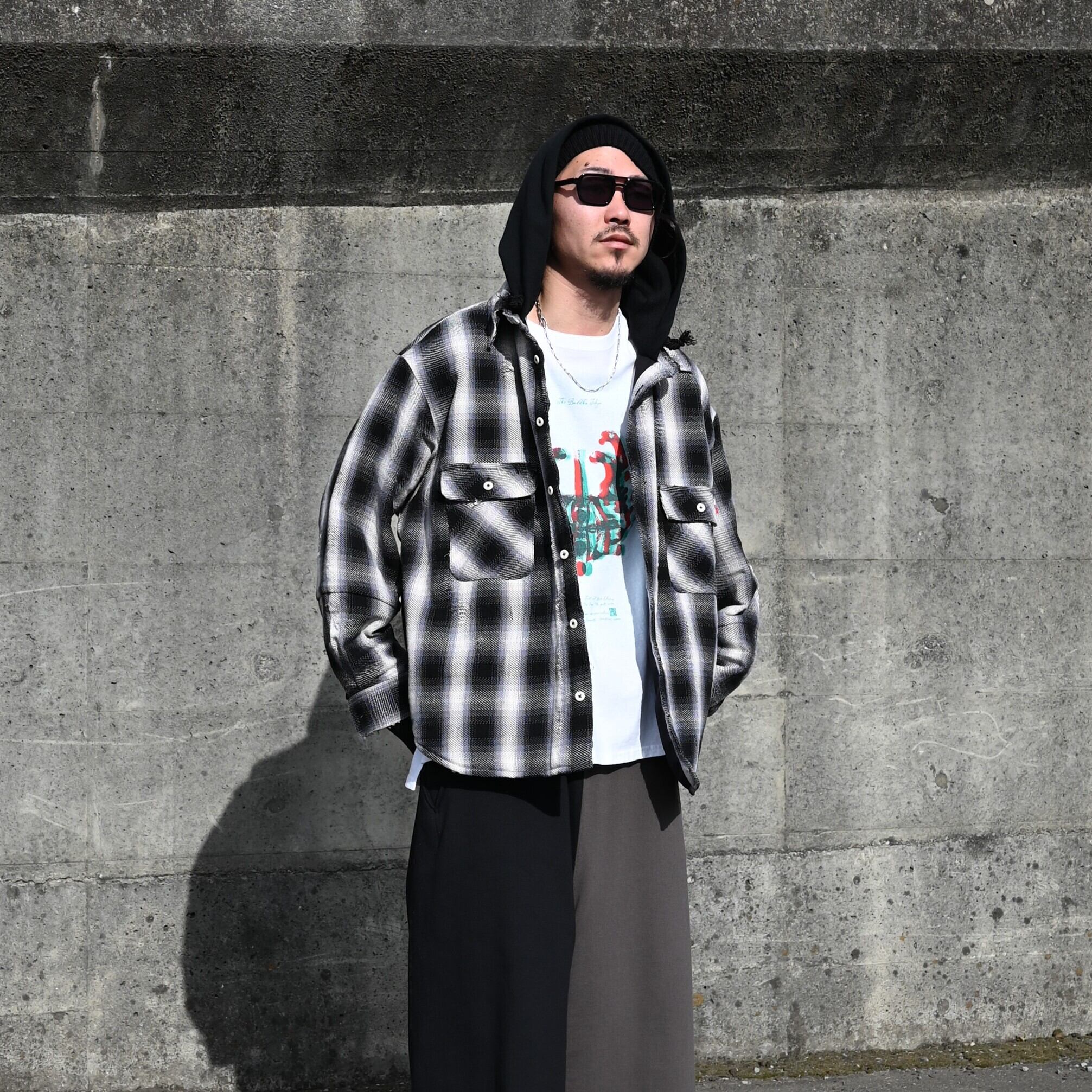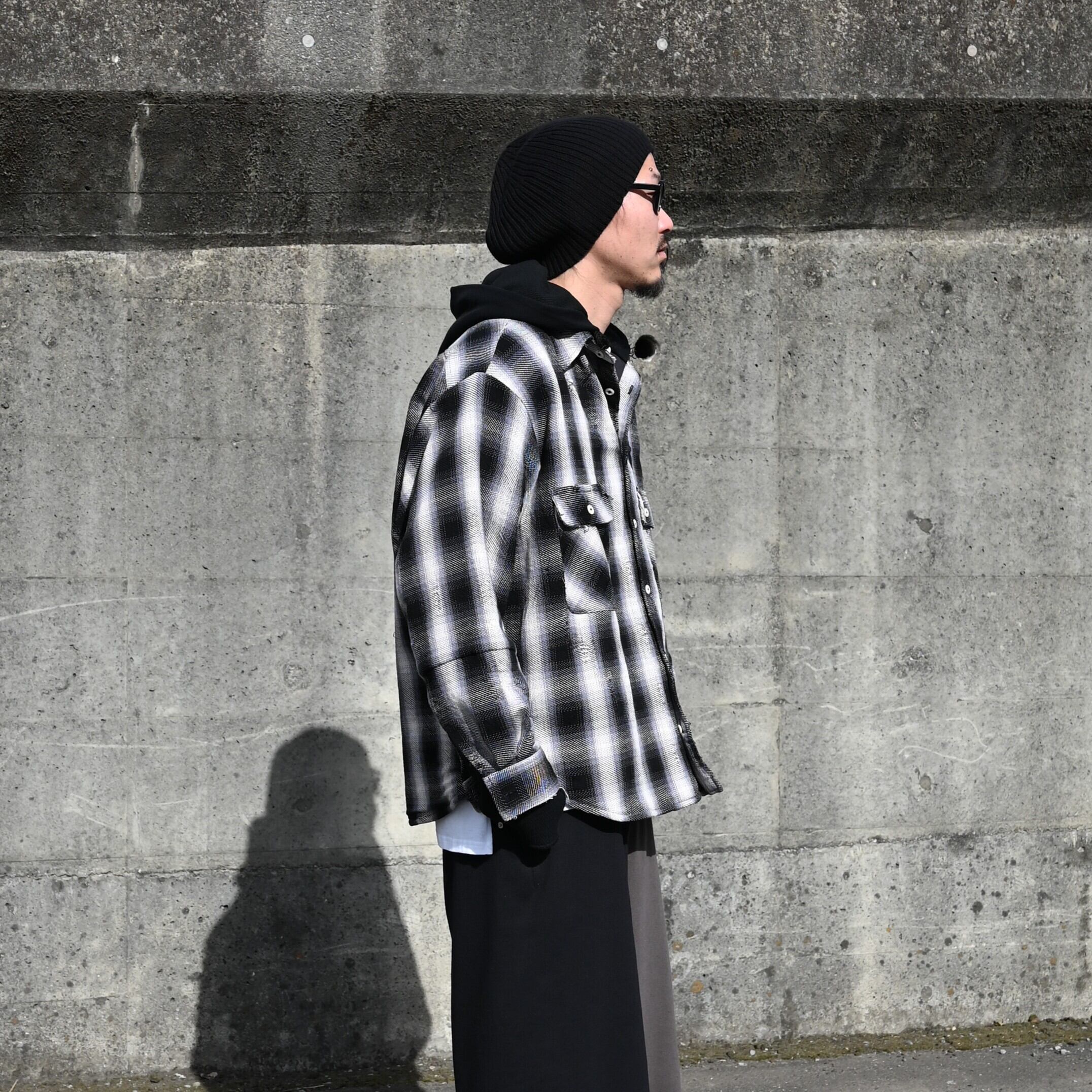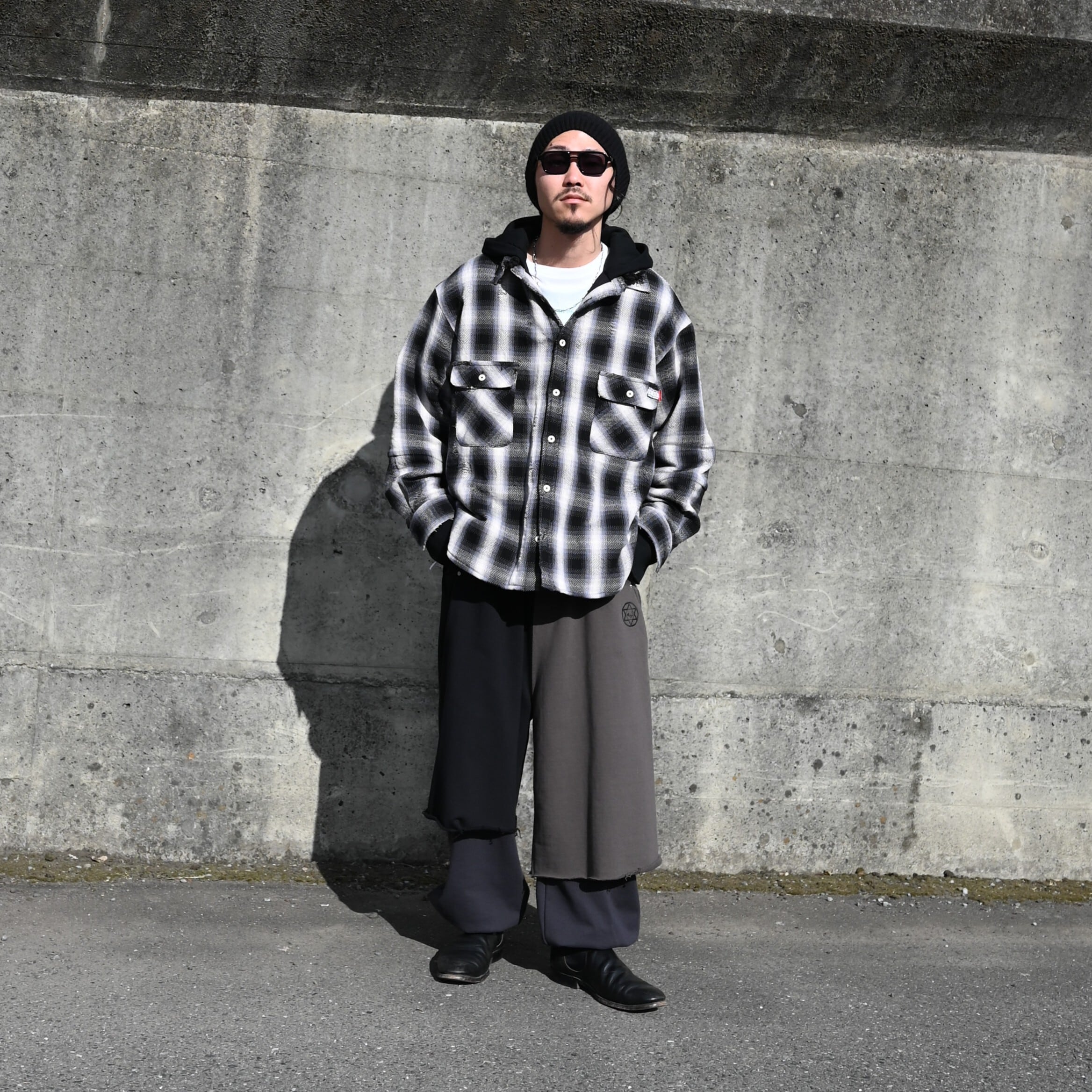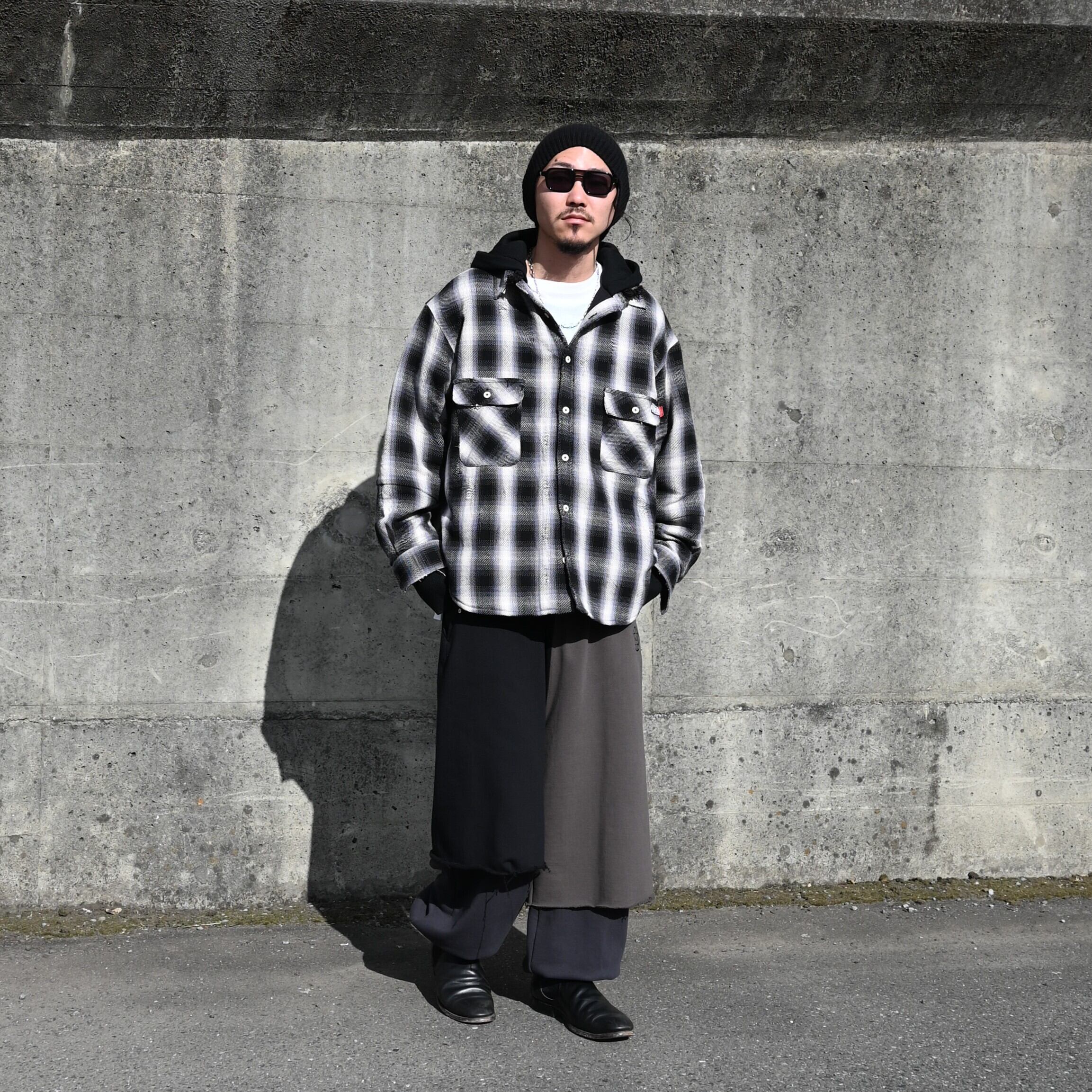 LEH(レー)のHoodie Layered Shirtsをメインにコーディネート。インナーにContemporary Big Size Slit T-SH-2を合わせ、 Layered Wide Track Pantsを着用いたしました。ストリートライクなコーディネートですが、足元に革靴を合わせることで大人な印象をプラス。