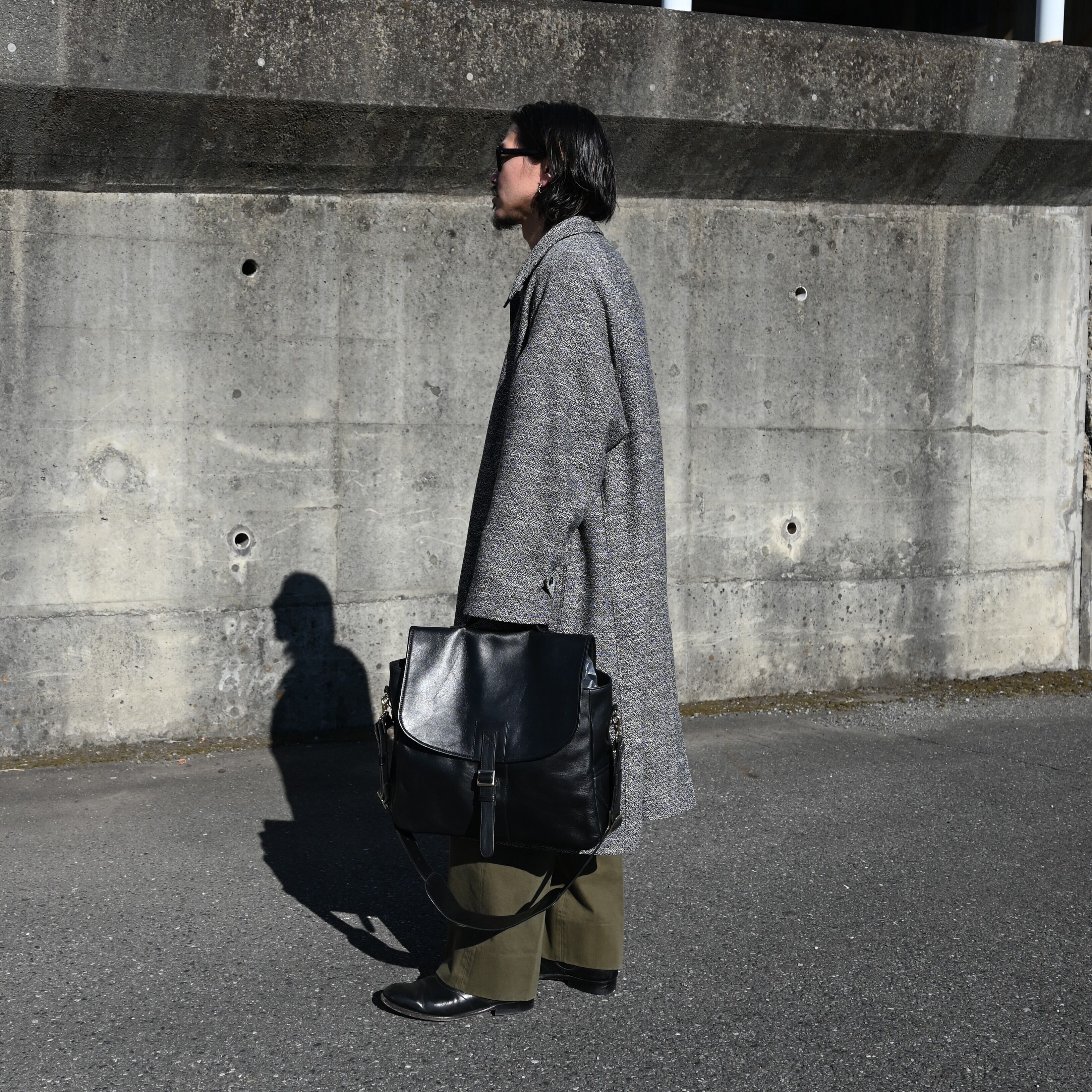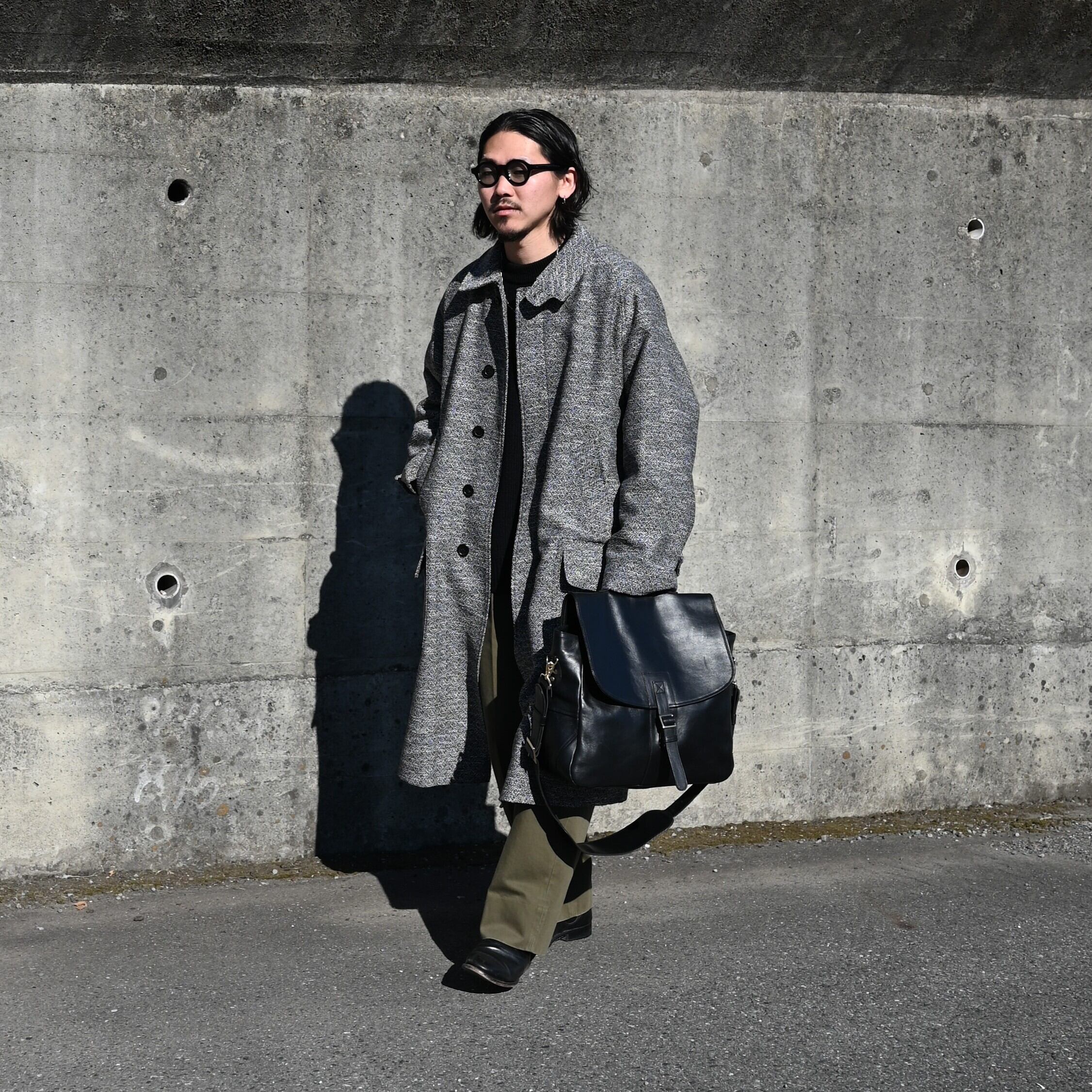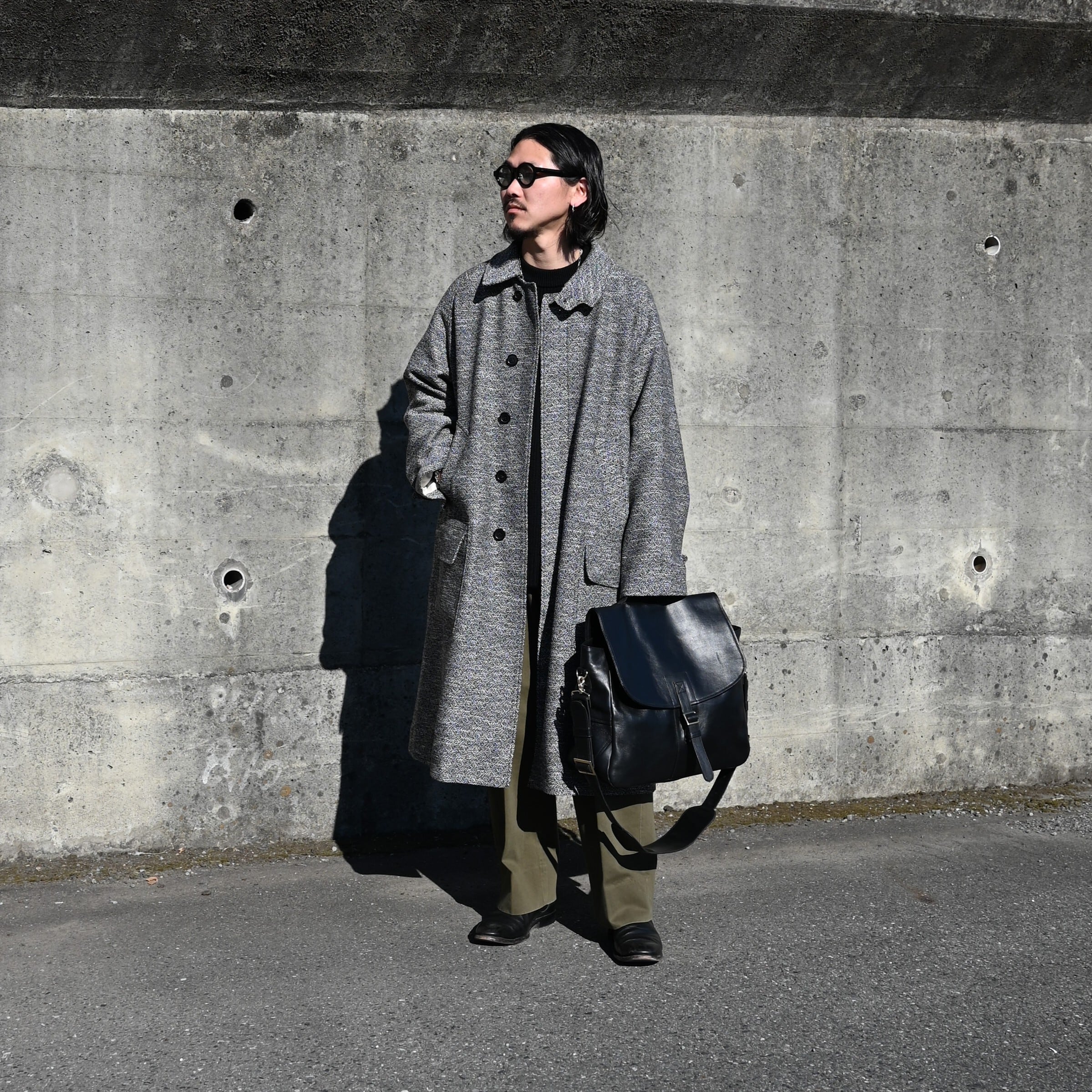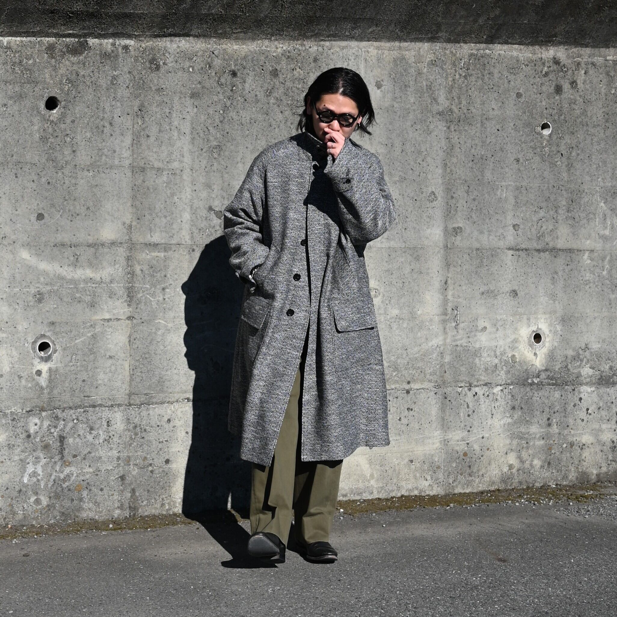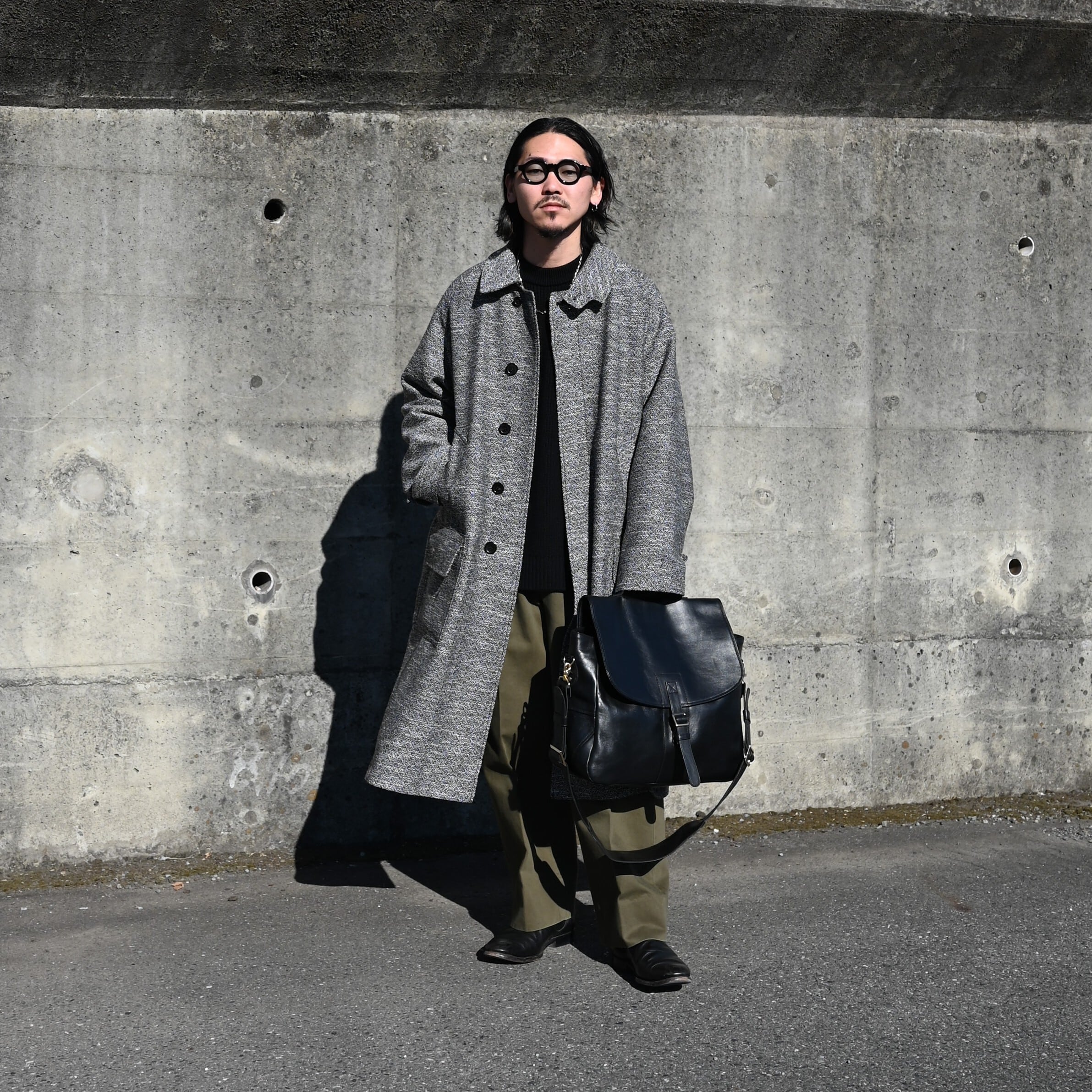 INTERIM(インテリム)のDOUBLE SIDED JACQUARD TWEED DEADSTOCK HYPER BIG HUNTING OVER COATをメインにコーディネート。インナーにTHEDAY(ザデイ)の MERINO WOOL CREWNECK KNITを合わせ、HEAVY PIMA TWILL 1-TUCK FRENCH ARMY WIDE TAPERED TROUSERを着用してカジュアルダウン。