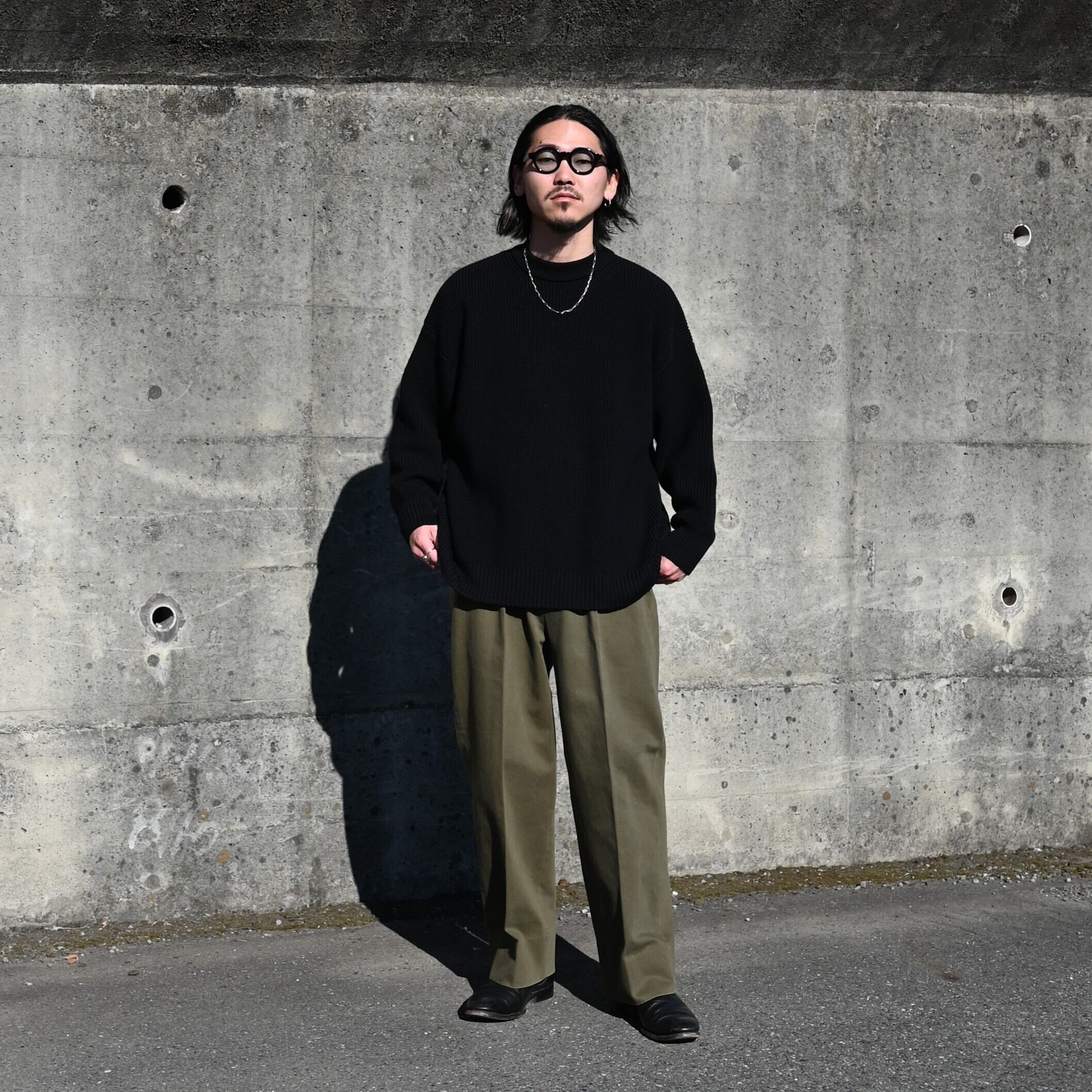 Paired with THEDAY’s Merino Wool Crewneck Knit as an inner layer, and finished with HEAVY PIMA TWILL 1-TUCK FRENCH ARMY WIDE TAPERED TROUSERS to give the look a more casual feel.