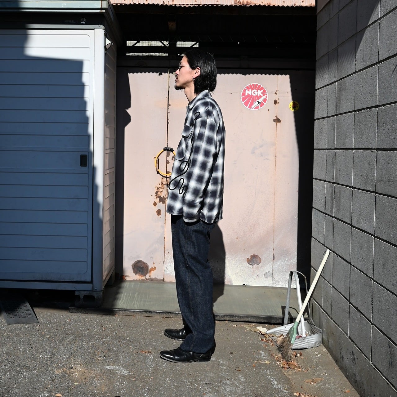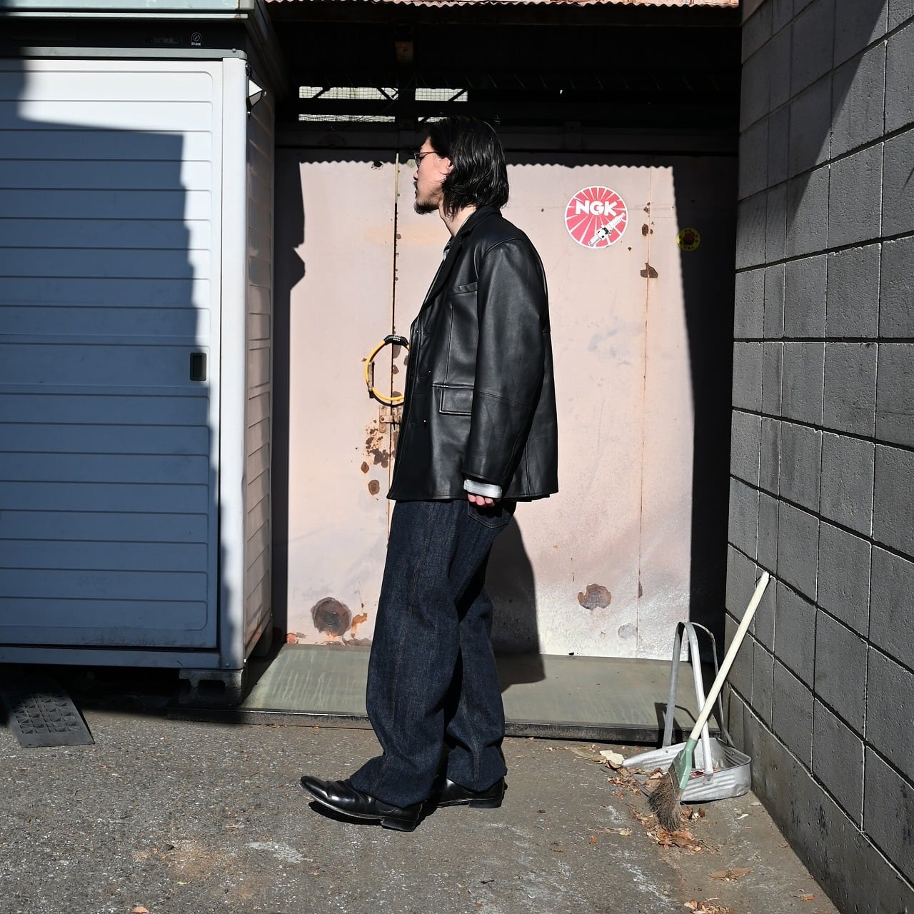 レザーとデニム王道の合わせだけど、レザーはテーラード型のリラックスサイズ、インナーはウエスタンライクなレーヨンシャツ、デニムは1930年代頃のワークウェアのユニークなディテールをモダンにアレンジ。