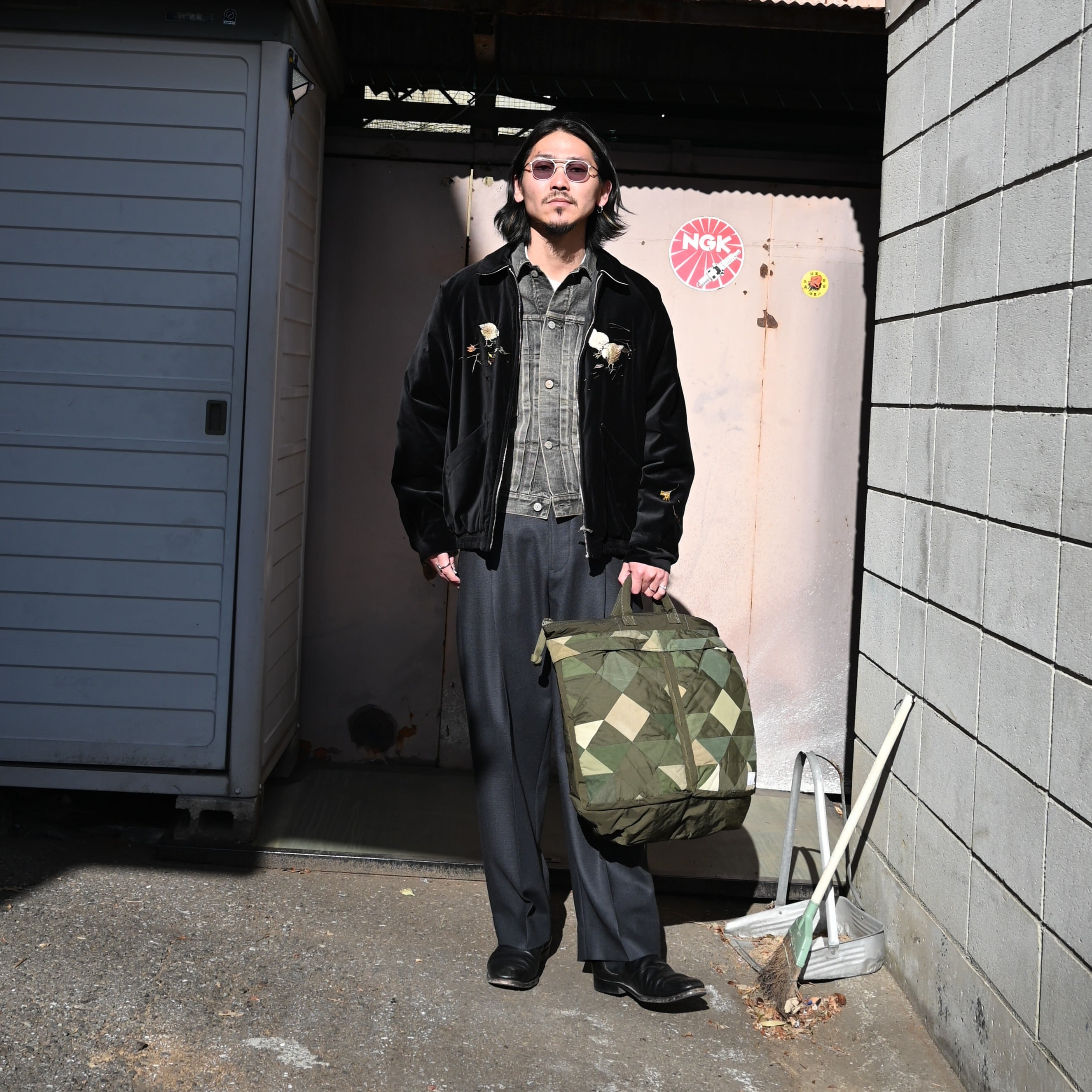 This outfit is styled around the OLD JOE “STUNNING VELVET SOUVENIR JACKET (Niwatori to Hiyoko)” as the main piece.
