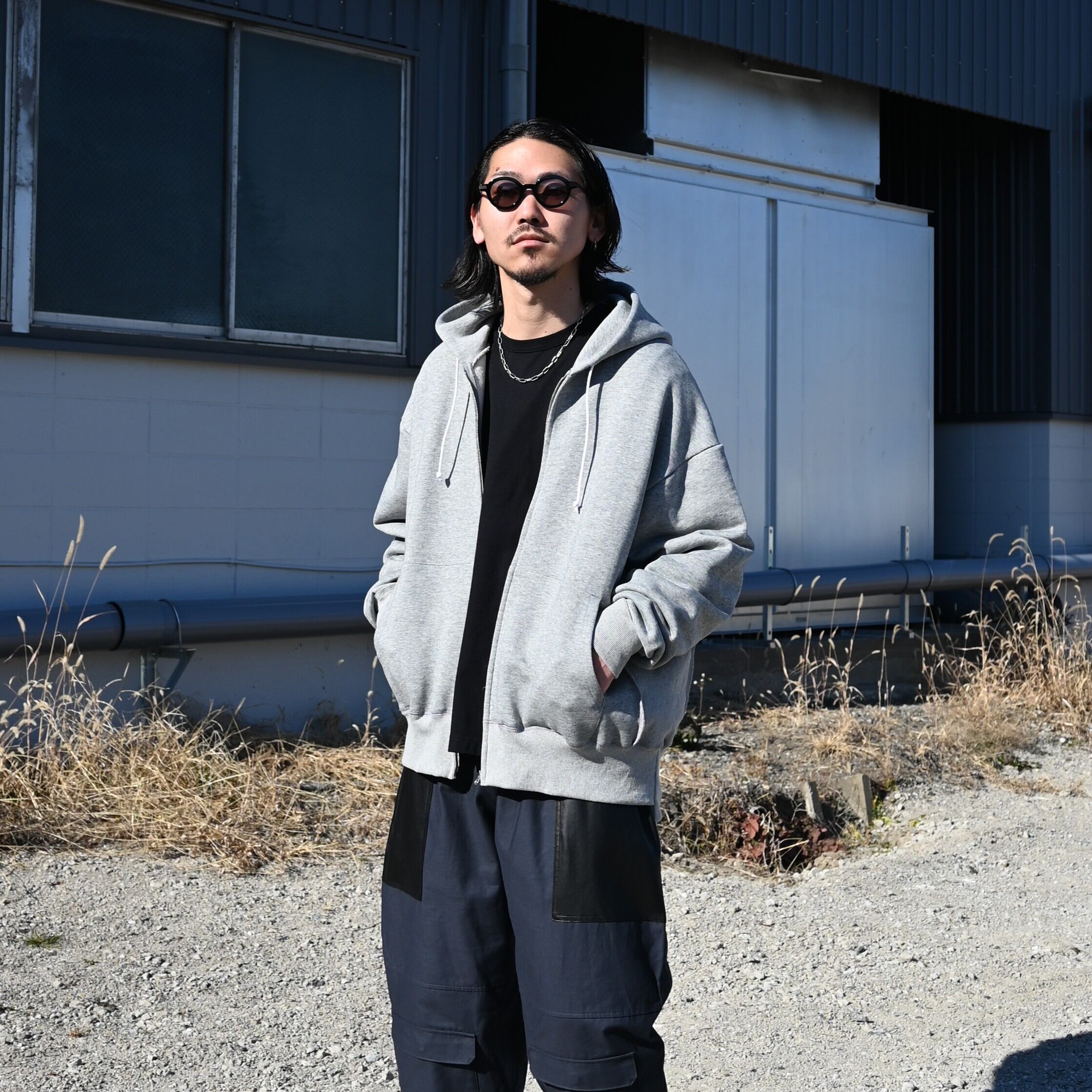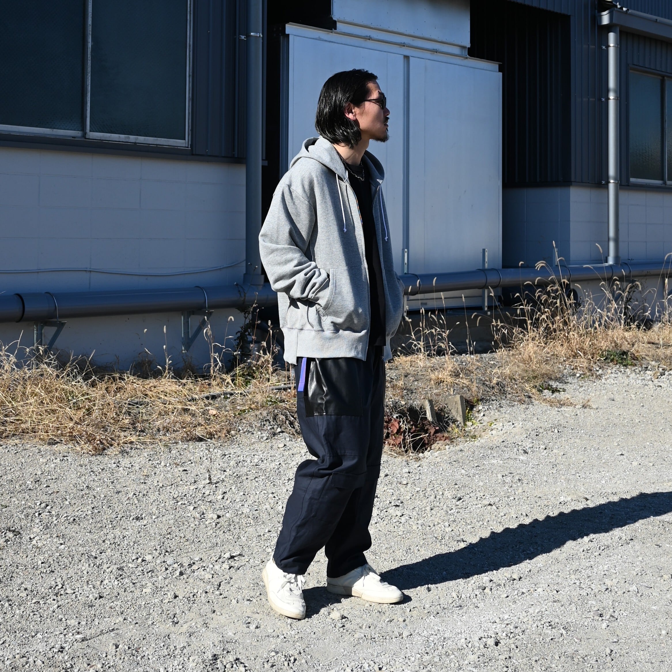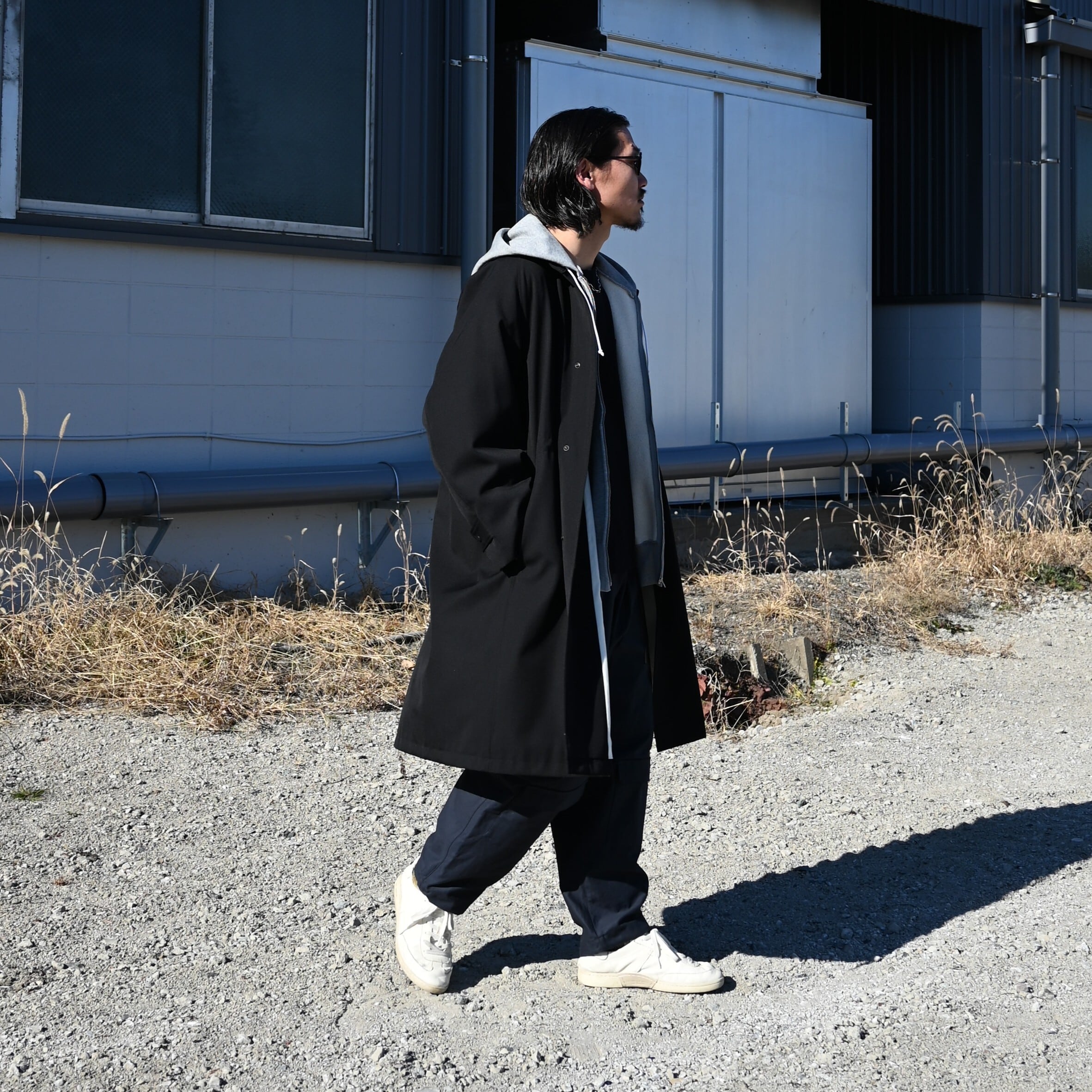 product twelve(プロジェクトトゥウェルブ)のT/W Rain Coatをメインに、UNTRACE(アントレース)のシップパーカー、レザーパッチベイカーパンツを合わせたコーディネート。